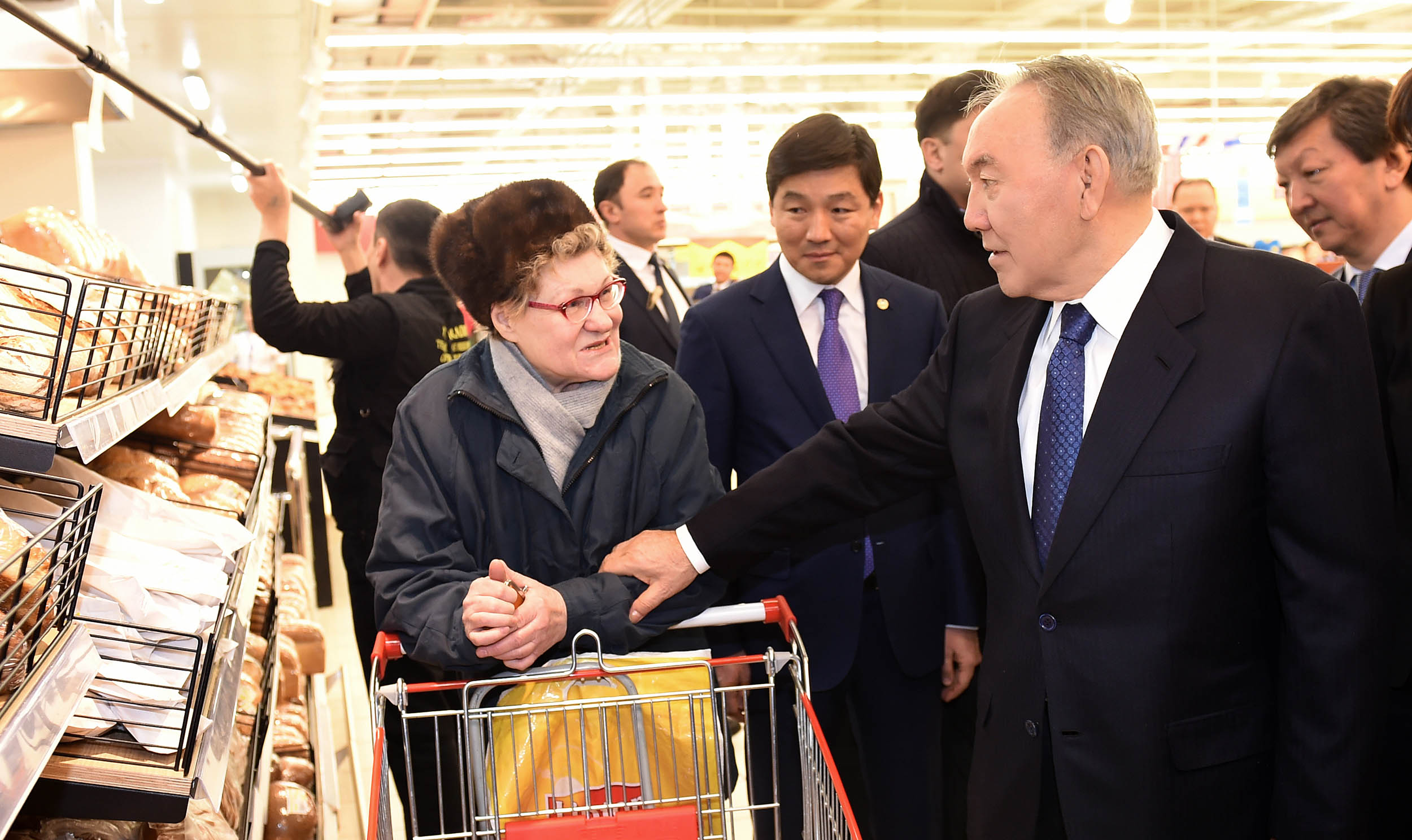 Nursultan Nazarbayev attended the hypermarket located in a new building of the Grand Park Almaty Shopping Mall, where he got acquainted with domestic goods and bought some Kazakhstan-made products.