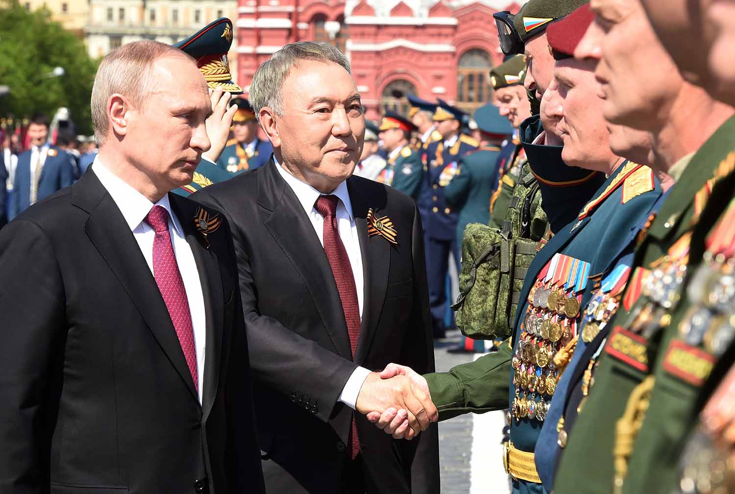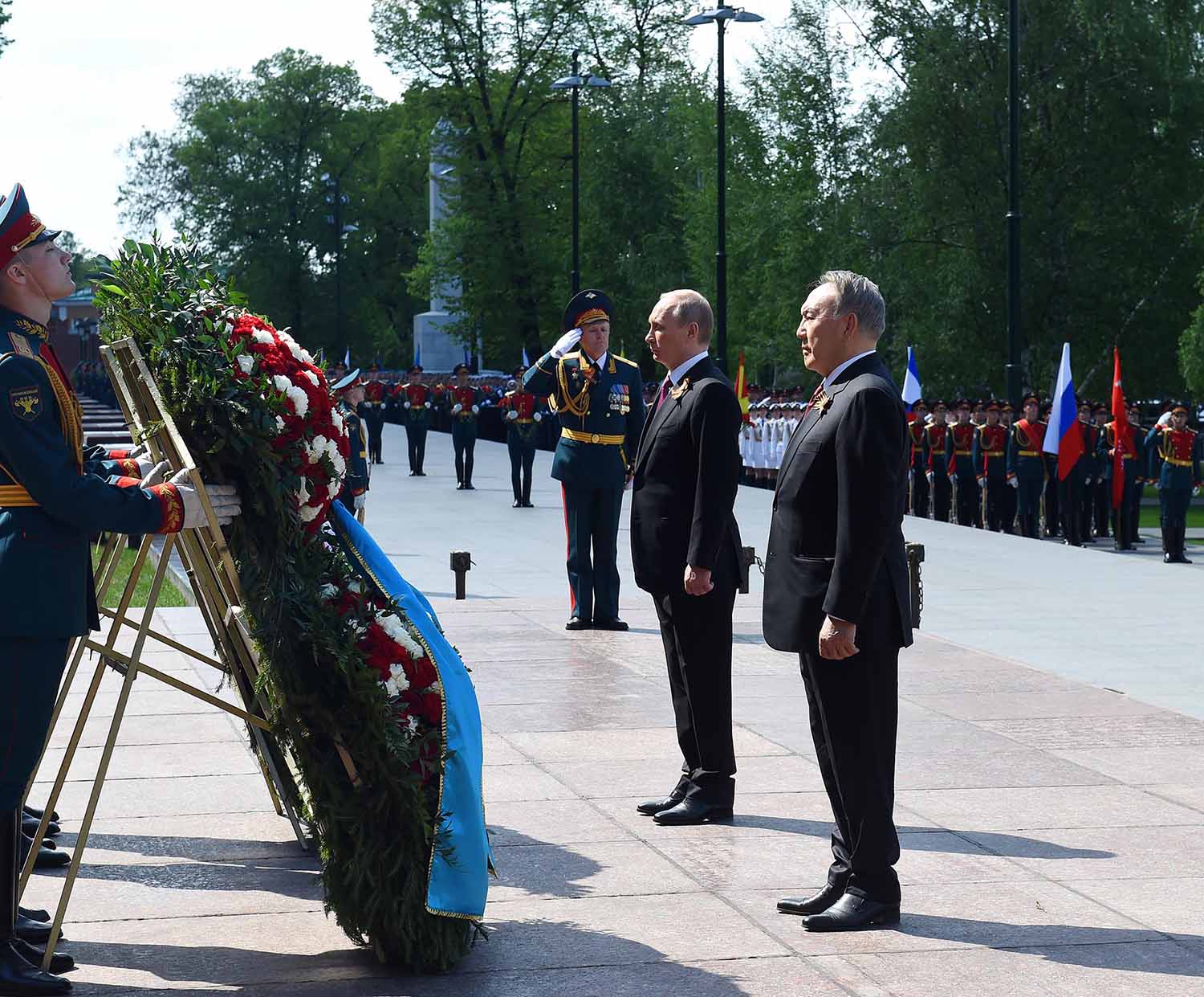 Nursultan Nazarbayev attended the Victory Day military parade in the Red Square and took part in a wreath laying ceremony at The Tomb of the Unknown Soldier. *** More than 10,000 troops participated in the parade with over 100 units of modern weapons and military equipment being displayed.