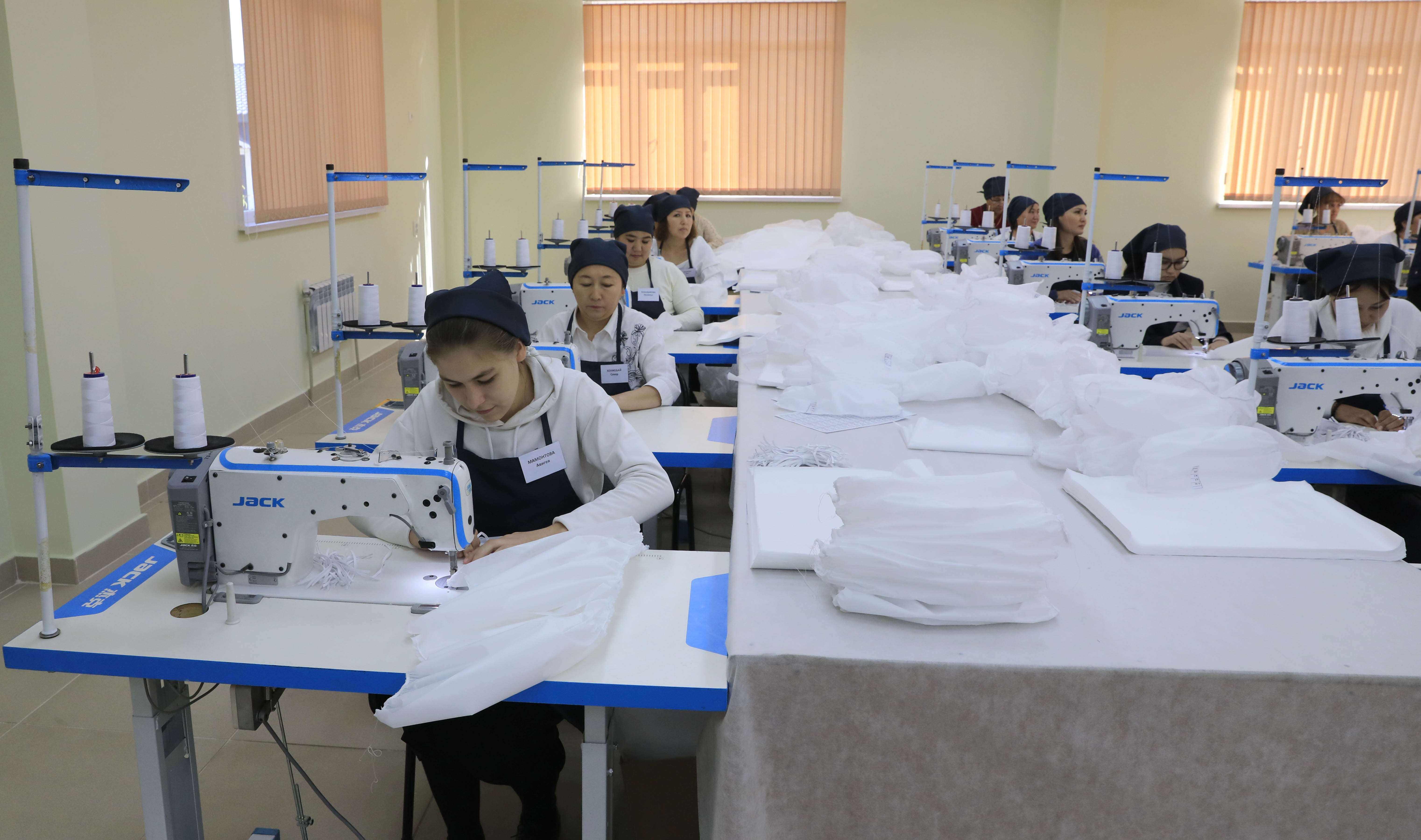 Заманауи тігін жабдықтарына ие кәсіпорын бүгінде бір рет қолданылатын медициналық бұйымдар (бетперде, халат, комбинезон) және арнаулы киім формаларын тігеді.