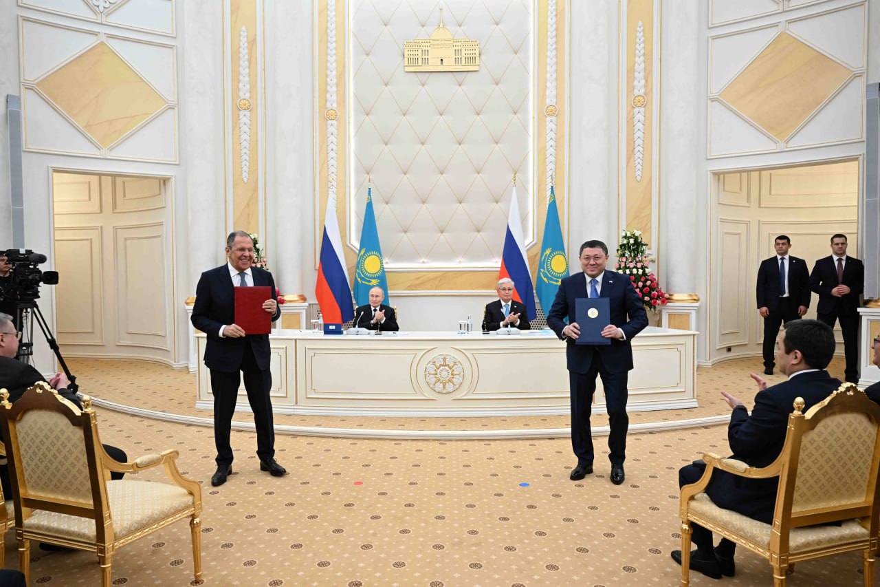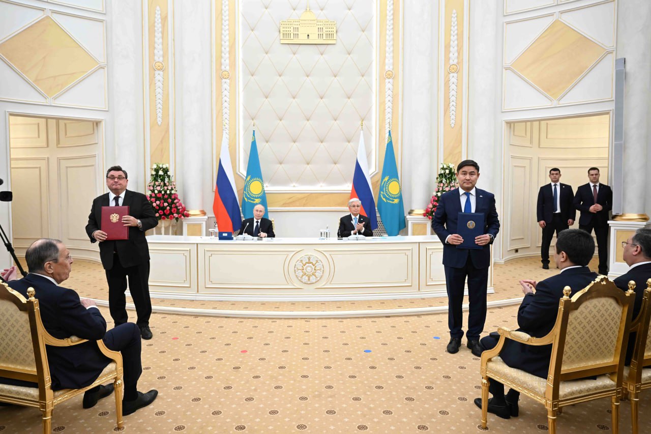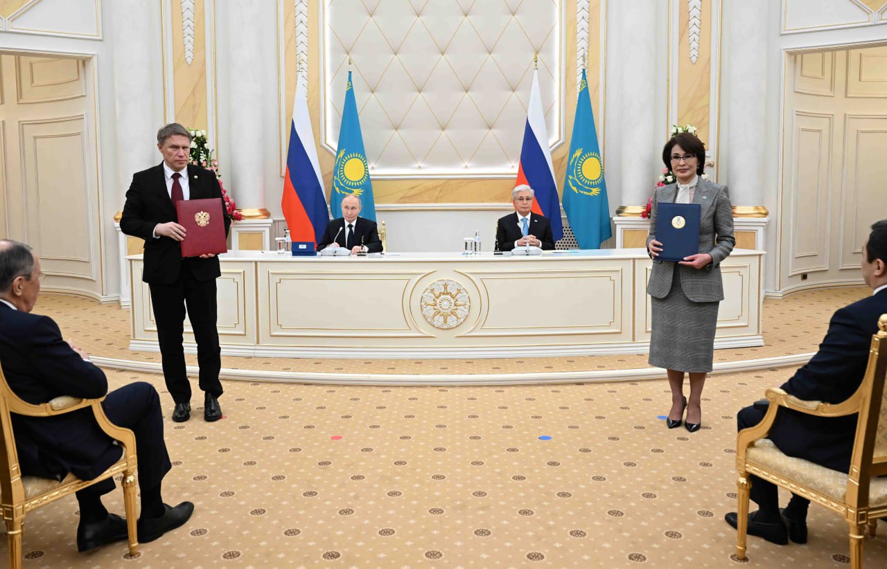 Келіссөздер қорытындысы бойынша Қасым-Жомарт Тоқаев пен Владимир Путин Жаңа жаһандық тәртіп жағдайында стратегиялық әріптестікті тереңдету туралы бірлескен мәлімдеме қабылдады.
