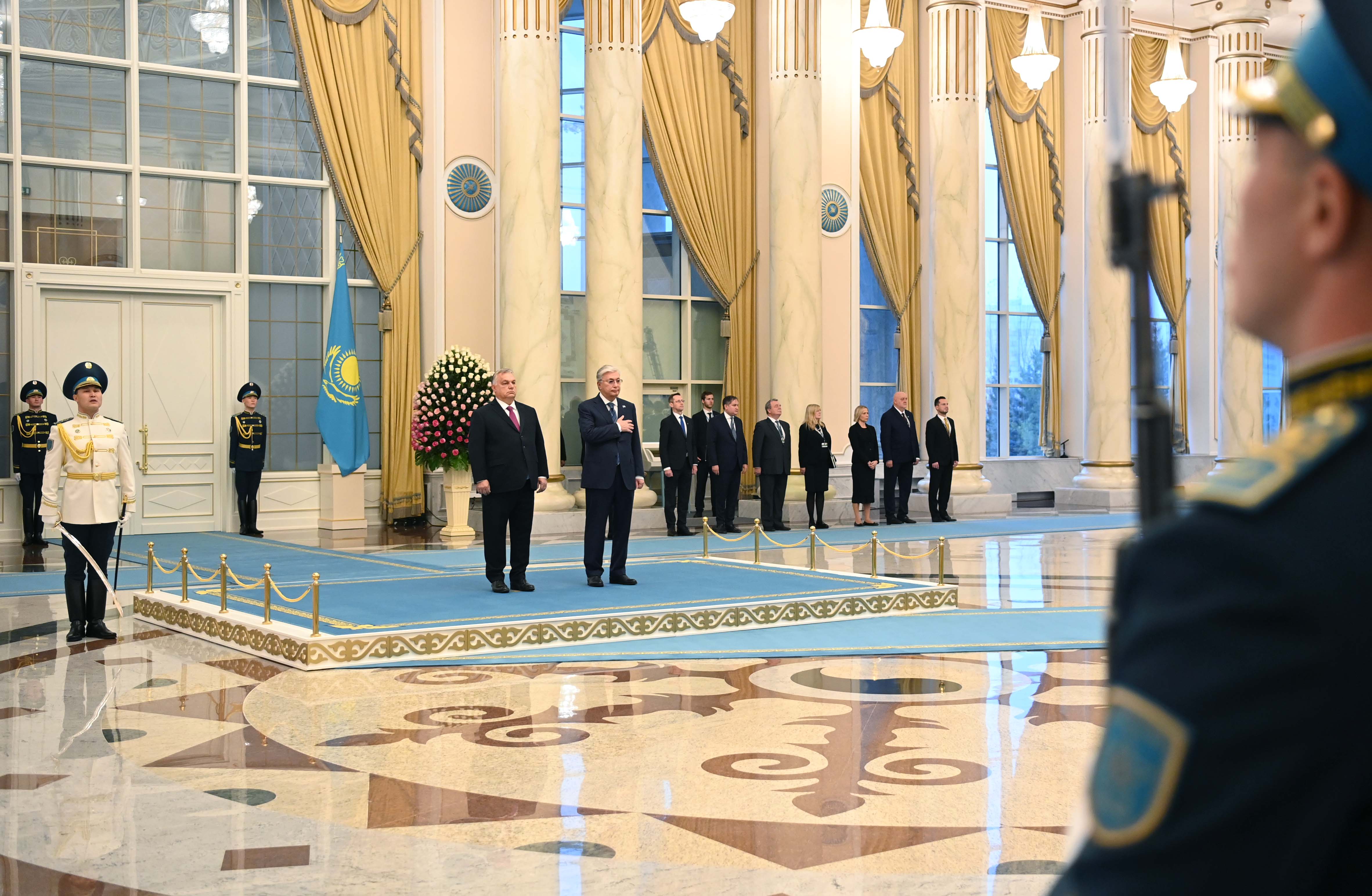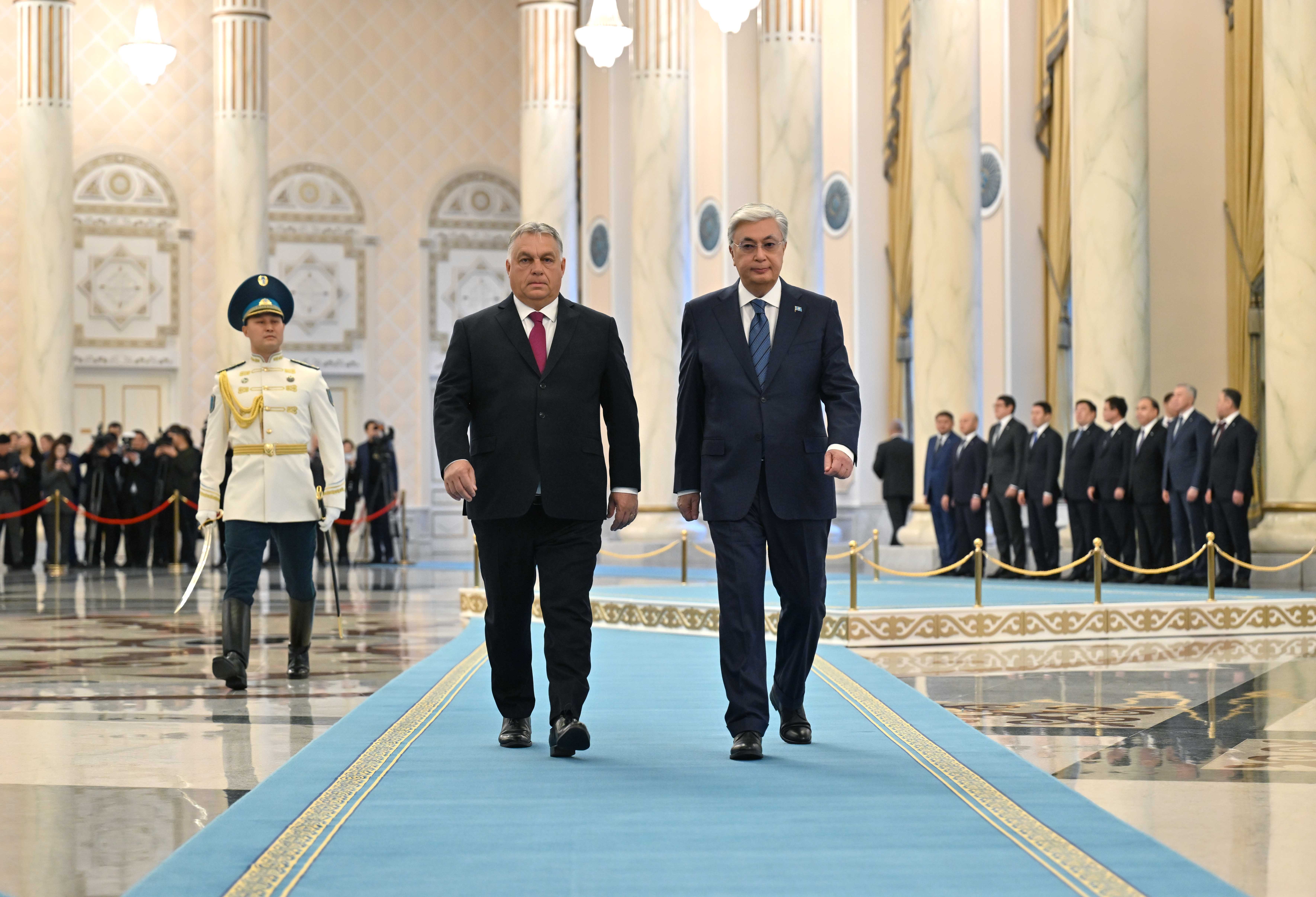 Келіссөз алдында «Ақорда» резиденциясында салтанатты түрде қарсы алу рәсімі өтті. Құрмет қарауылының бастығы Қазақстан Президенті мен Мажарстан Премьер-министріне рапорт берді. Екі елдің мемлекеттік әнұрандары орындалғаннан кейін Қасым-Жомарт Тоқаев пен Виктор Орбан шағын құрамда кездесу өтетін залға барды.