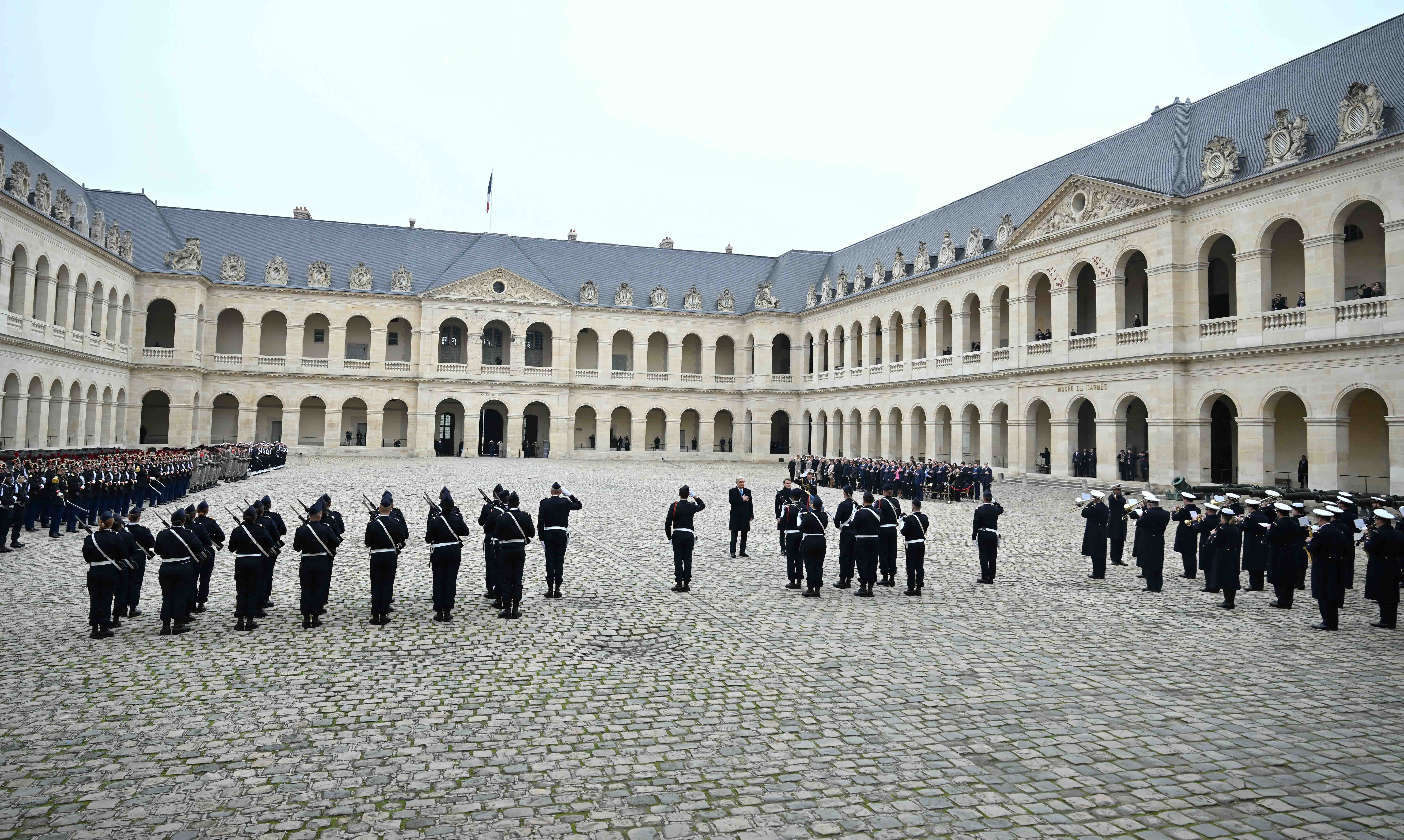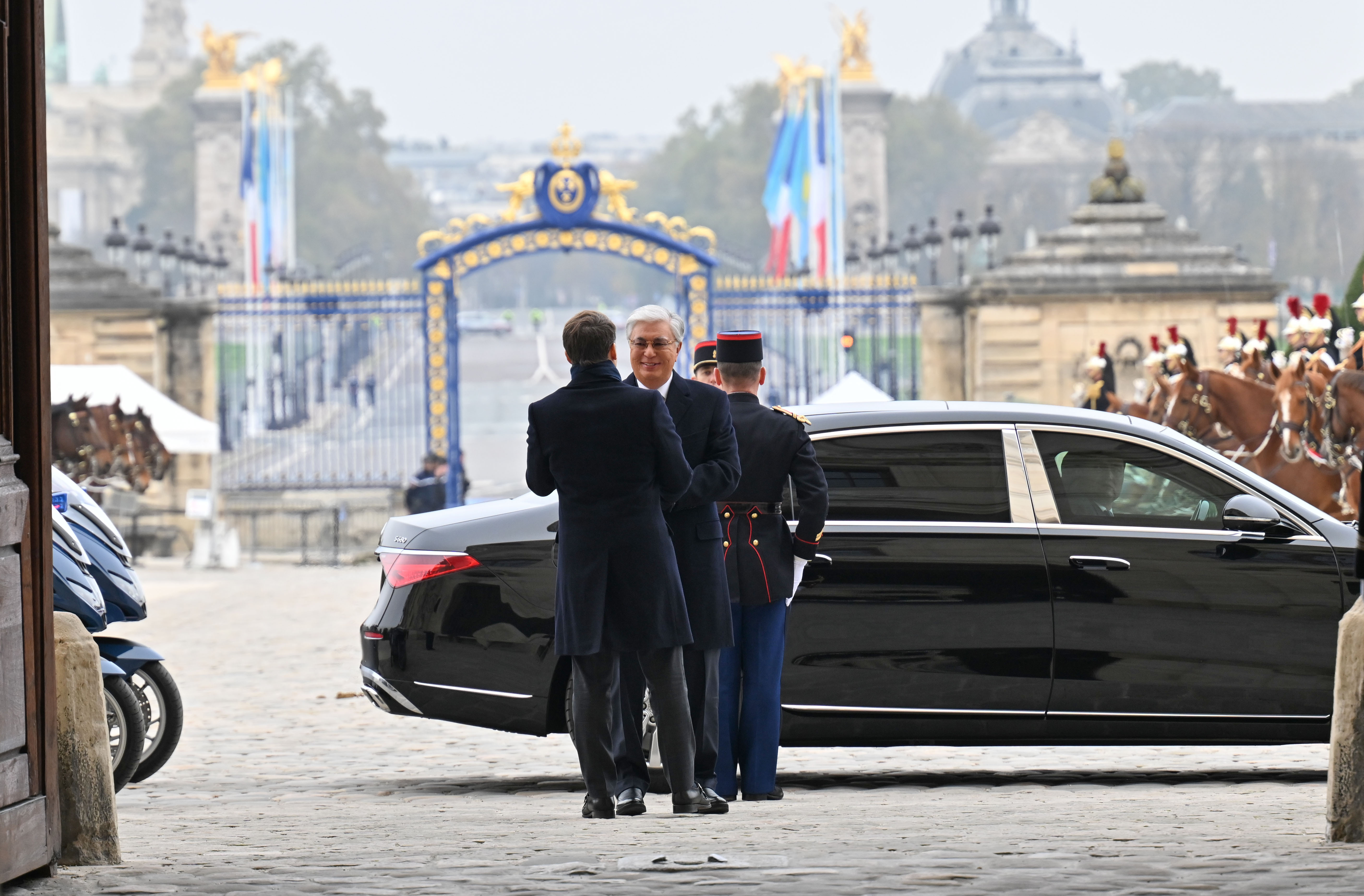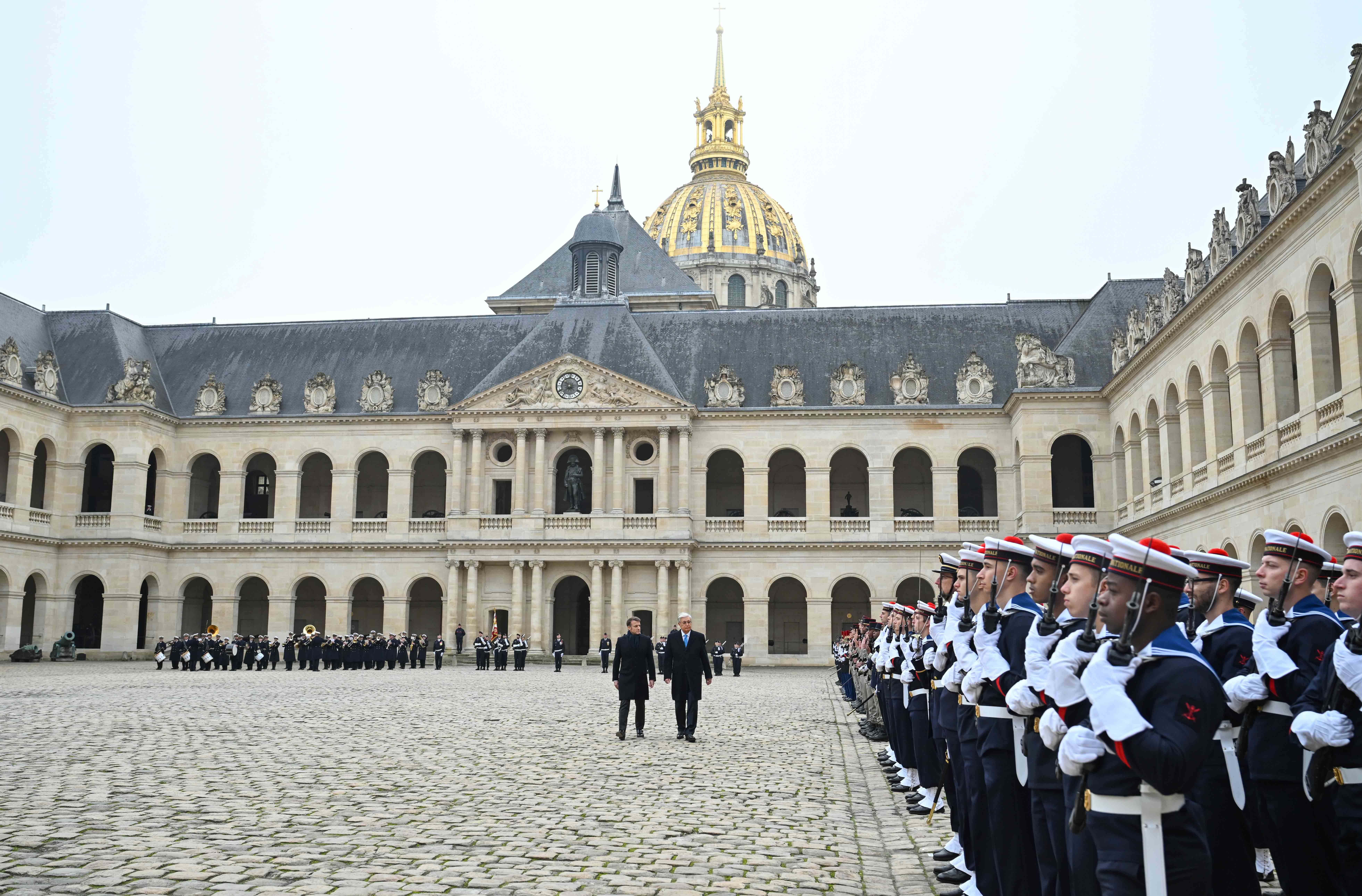 Франция, Париж қаласы Қасым-Жомарт Тоқаевтың Франция Республикасына мемлекеттік сапары салтанатты қарсы алу рәсімінен басталды. Мемлекет басшысын әскери оркестрдің сүйемелдеуімен Президент Эмманюэль Макрон қарсы алды. Қазақстан мен Францияның мемлекеттік әнұрандары шырқалды. Президенттер республикалық гвардия, әуе-ғарыш, құрлық және теңіз әскерлерінен жасақталған Құрмет қарауылының алдынан жүріп өтті. Бұдан кейін мемлекеттер басшылары Құрмет қарауылының салтанатты шеруін тамашалады. Қасым-Жомарт Тоқаев пен Эмманюэль Макрон бір-біріне ресми делегация мүшелерін және құрметті қонақтарды таныстырды.