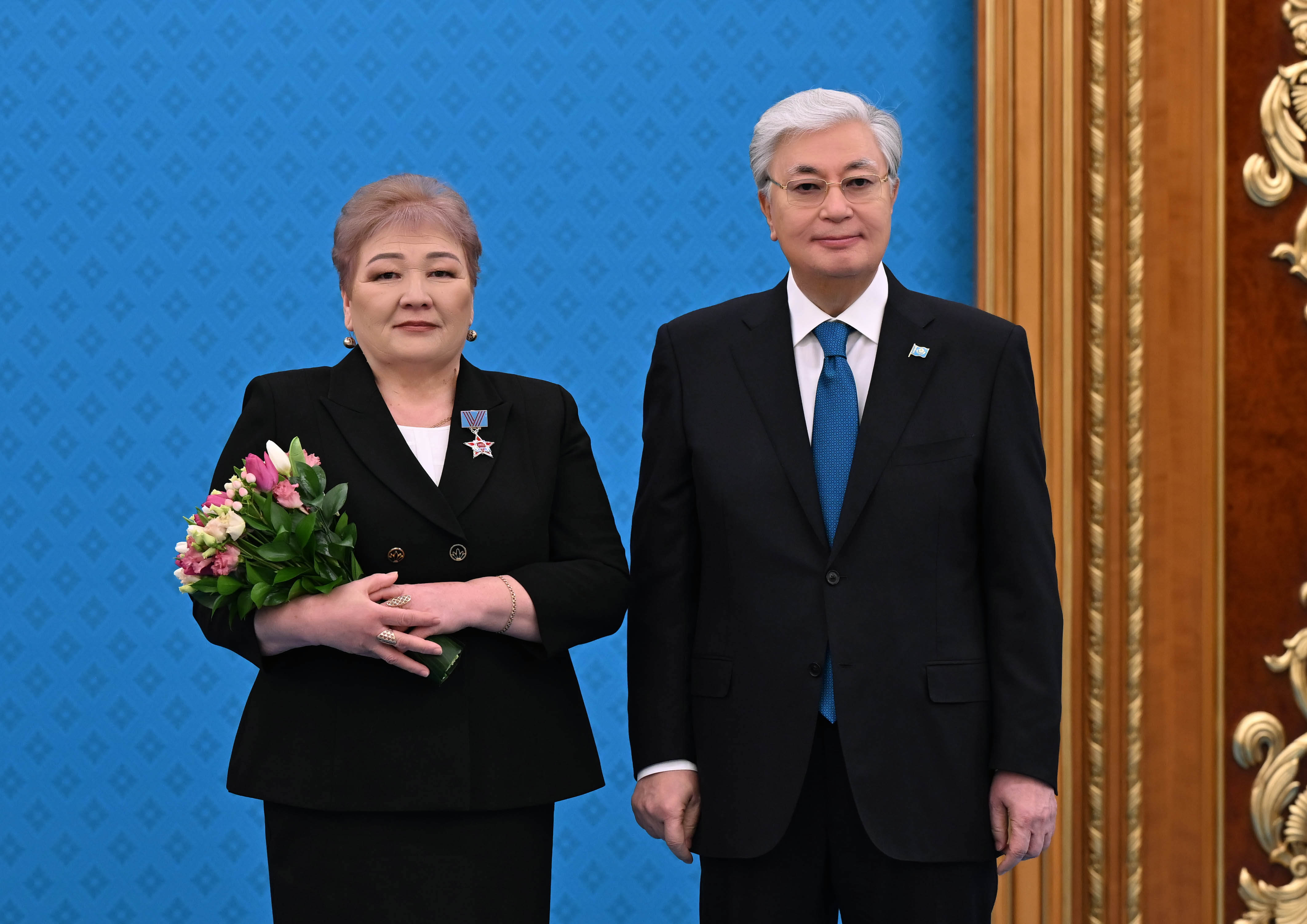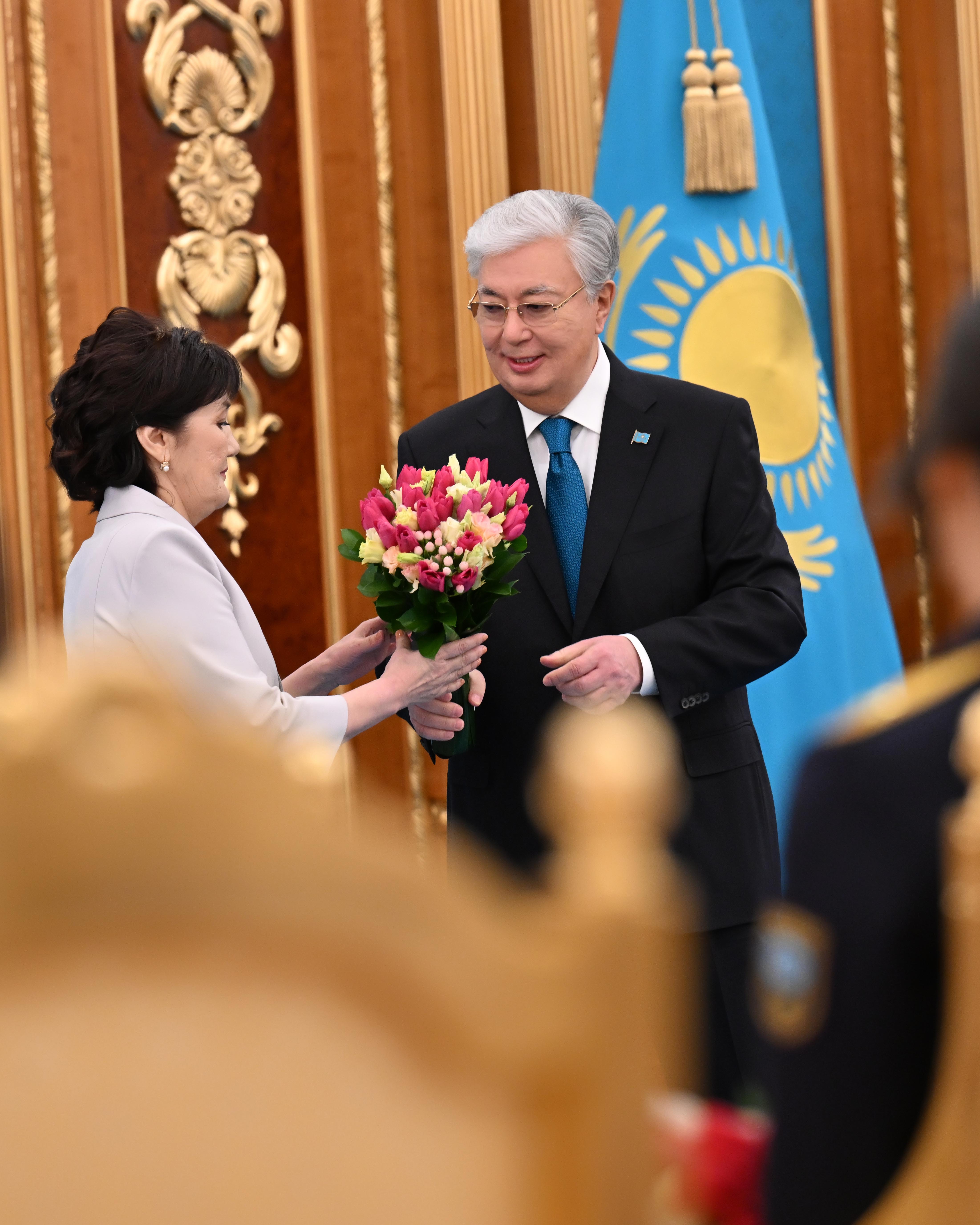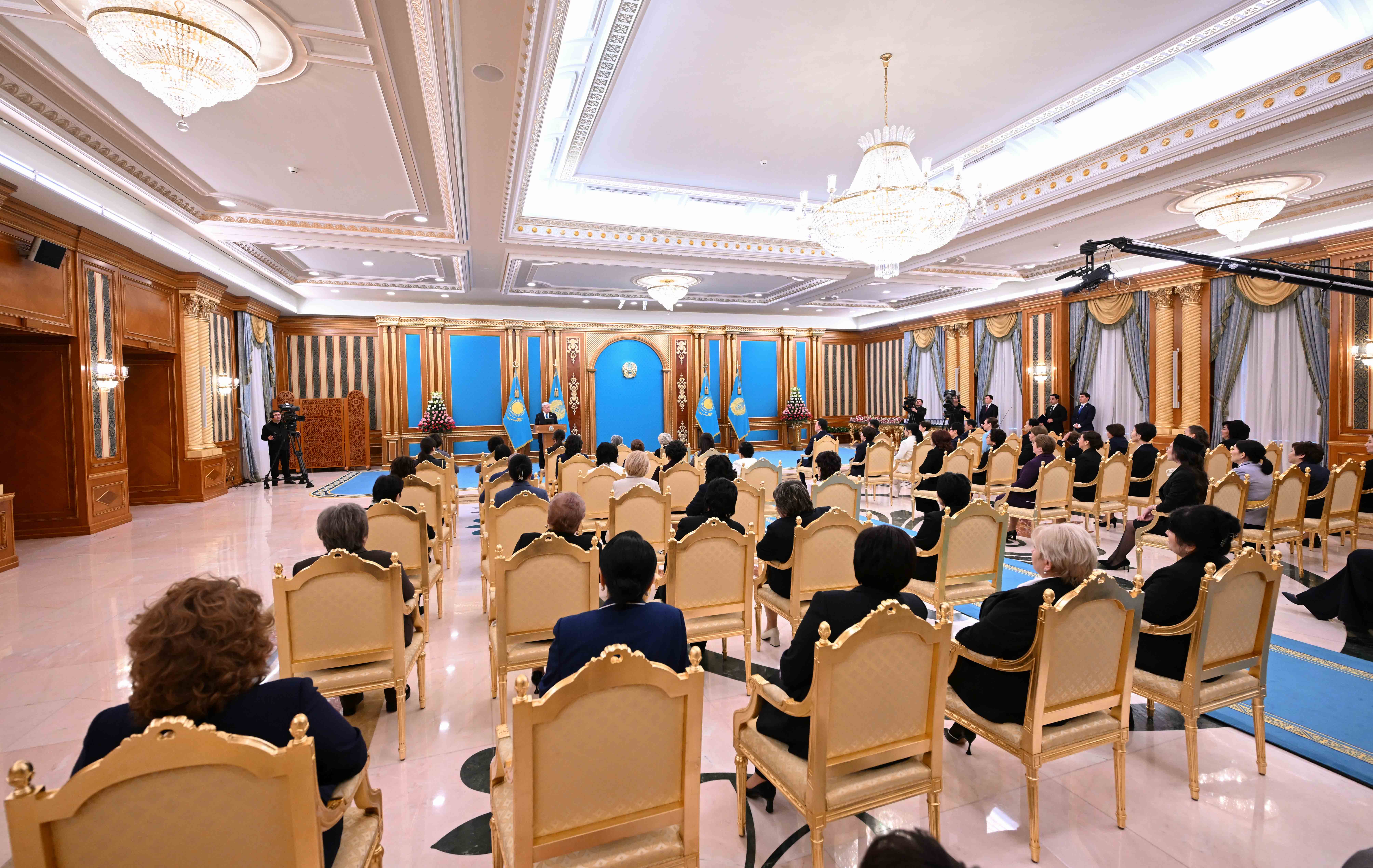 Салтанатты жиында Мемлекет басшысы еліміздің дамуына елеулі еңбек сіңірген, өз саласында жоғары жетістікке жеткен бір топ әйел азаматқа мемлекеттік наградалар табыстады.