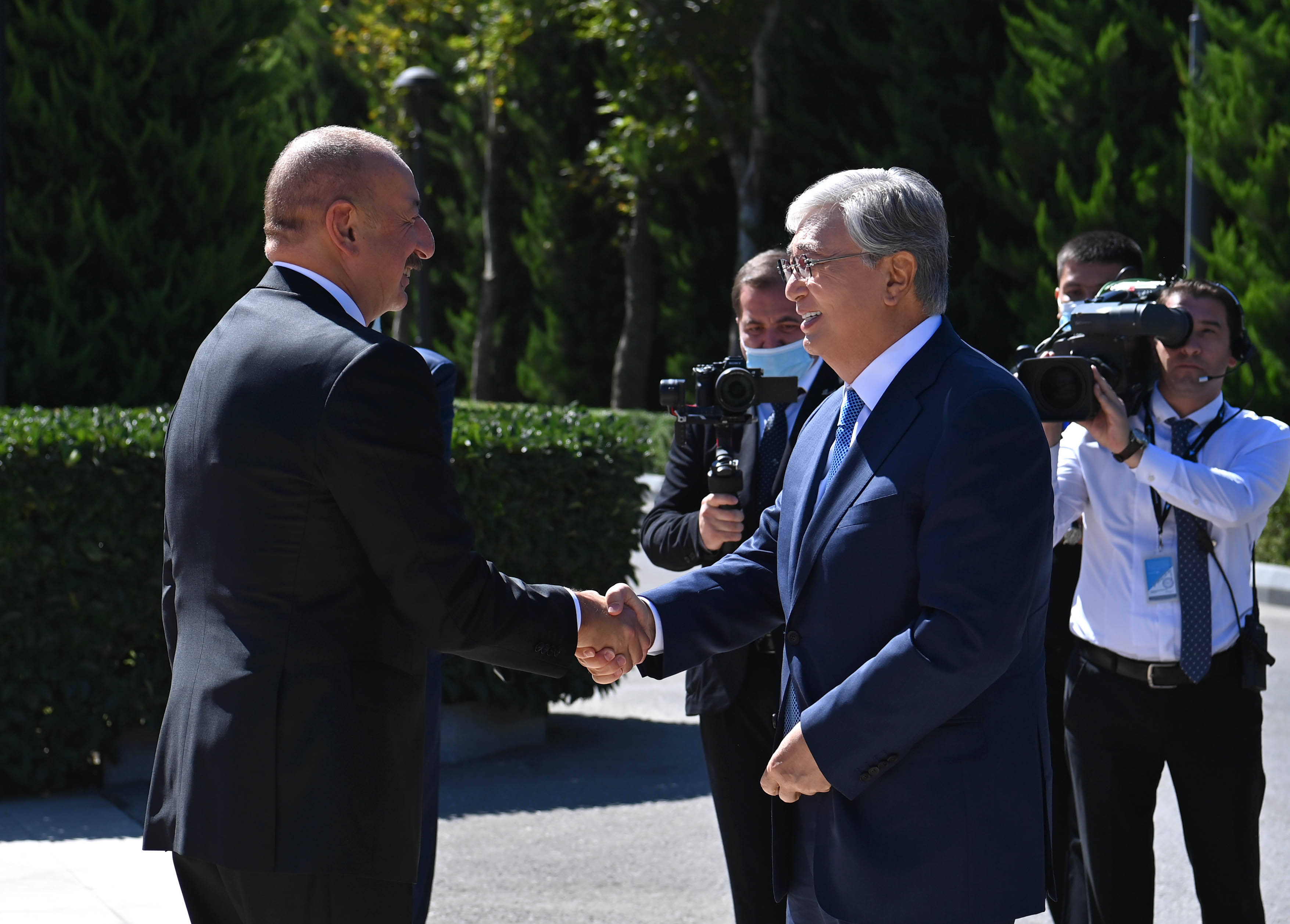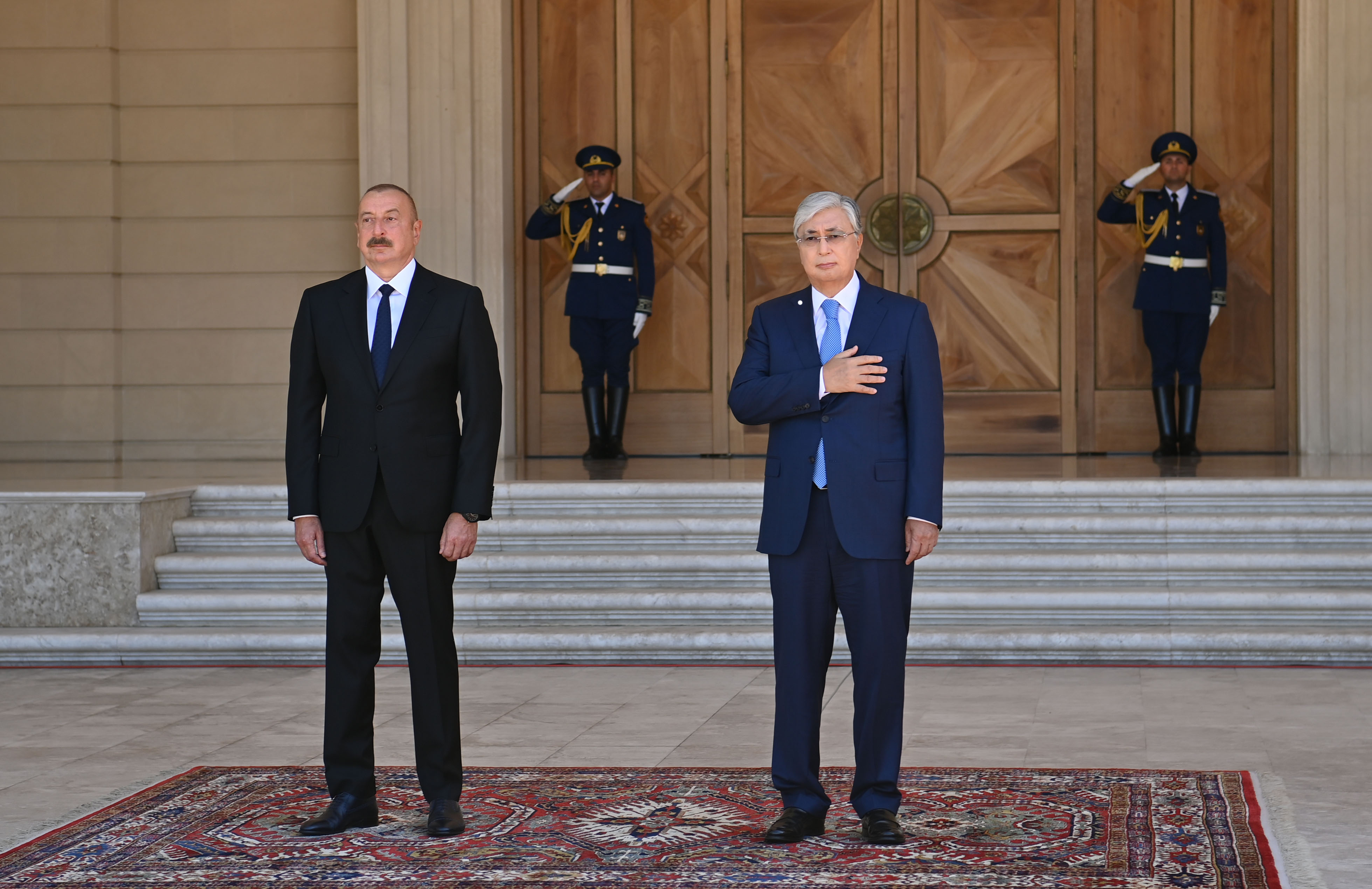 Құрмет Қарауылының бастығы екі ел басшыларына рапорт беріп, Қазақстан мен Әзербайжанның әнұрандары орындалғаннан кейін Қасым-Жомарт Тоқаев пен Ильхам Әлиев бір-біріне ресми делегациялардың құрамын таныстырды. Салтанатты рәсімнен соң екі ел президенттері келіссөз жүргізді.