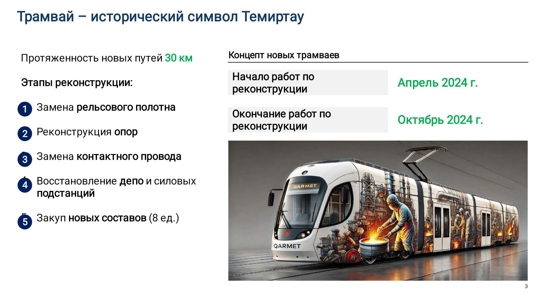Мемлекет басшысы комбинатты табиғи газға көшіру маңызды шешім екенін атап өтті. Бұл бастапқы кезеңде қоршаған ортаға келетін зиянды 30 пайызға төмендетуге мүмкіндік береді. Биыл күзде Теміртау қаласында экологиялық таза көлік түрі – трамвай желісі қалпына келтіріледі.
