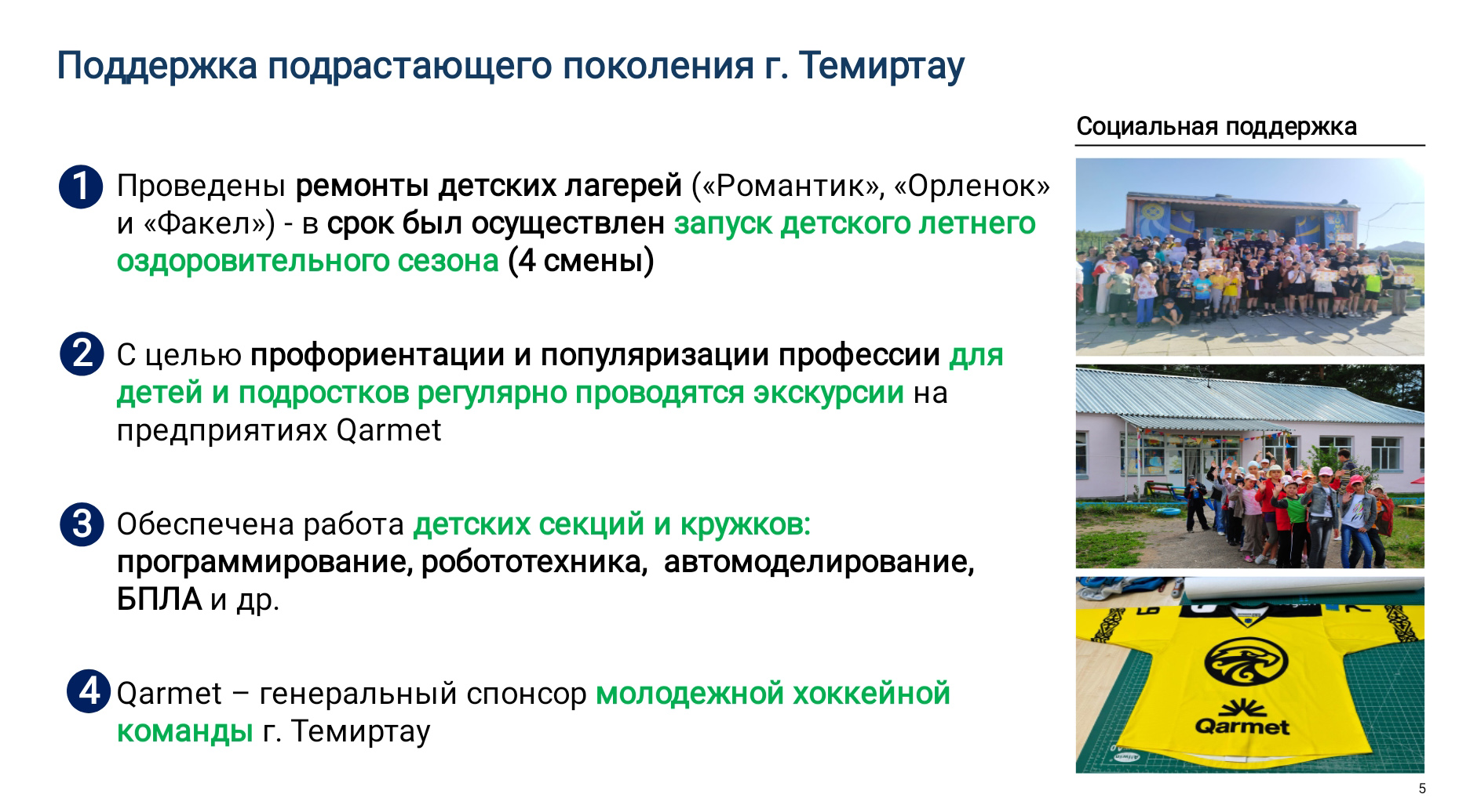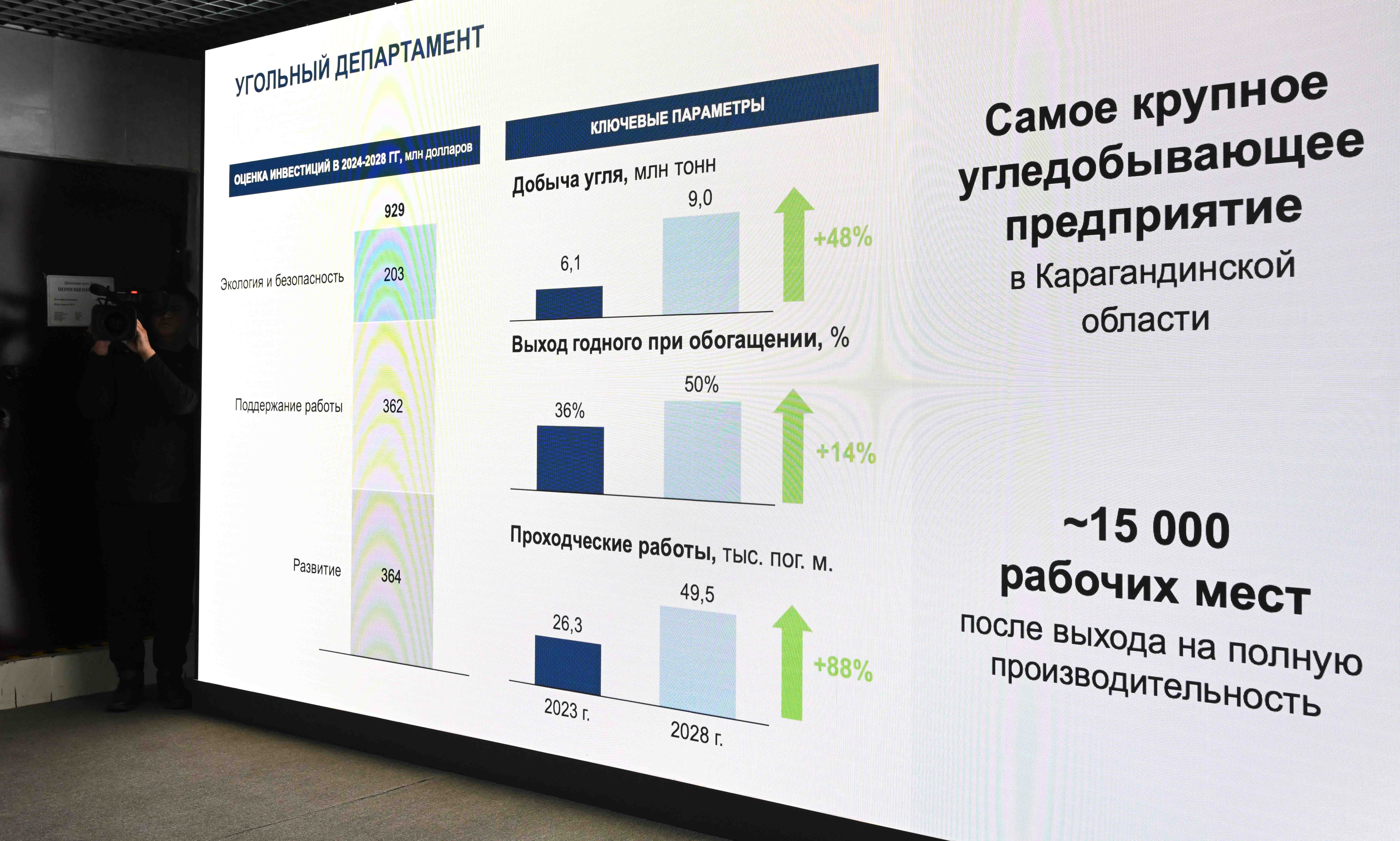 «Qarmet» акционерлік қоғамы Директорлар кеңесінің төрағасы Андрей Лаврентьев пен кәсіпорынның бас директоры Вадим Басин өндірісті дамыту үшін атқарылған және жүзеге асырылып жатқан жобалар жөнінде баяндады. Бұл мақсатқа 3,5 миллиард доллардан астам қаржы қарастырылған. Бұдан бөлек 500 миллион доллар шамасында Көмір департаментіндегі және 978 миллион доллар көлемінде Темір рудасы департаментіндегі жобаларға қосымша инвестиция құю жоспарланған.