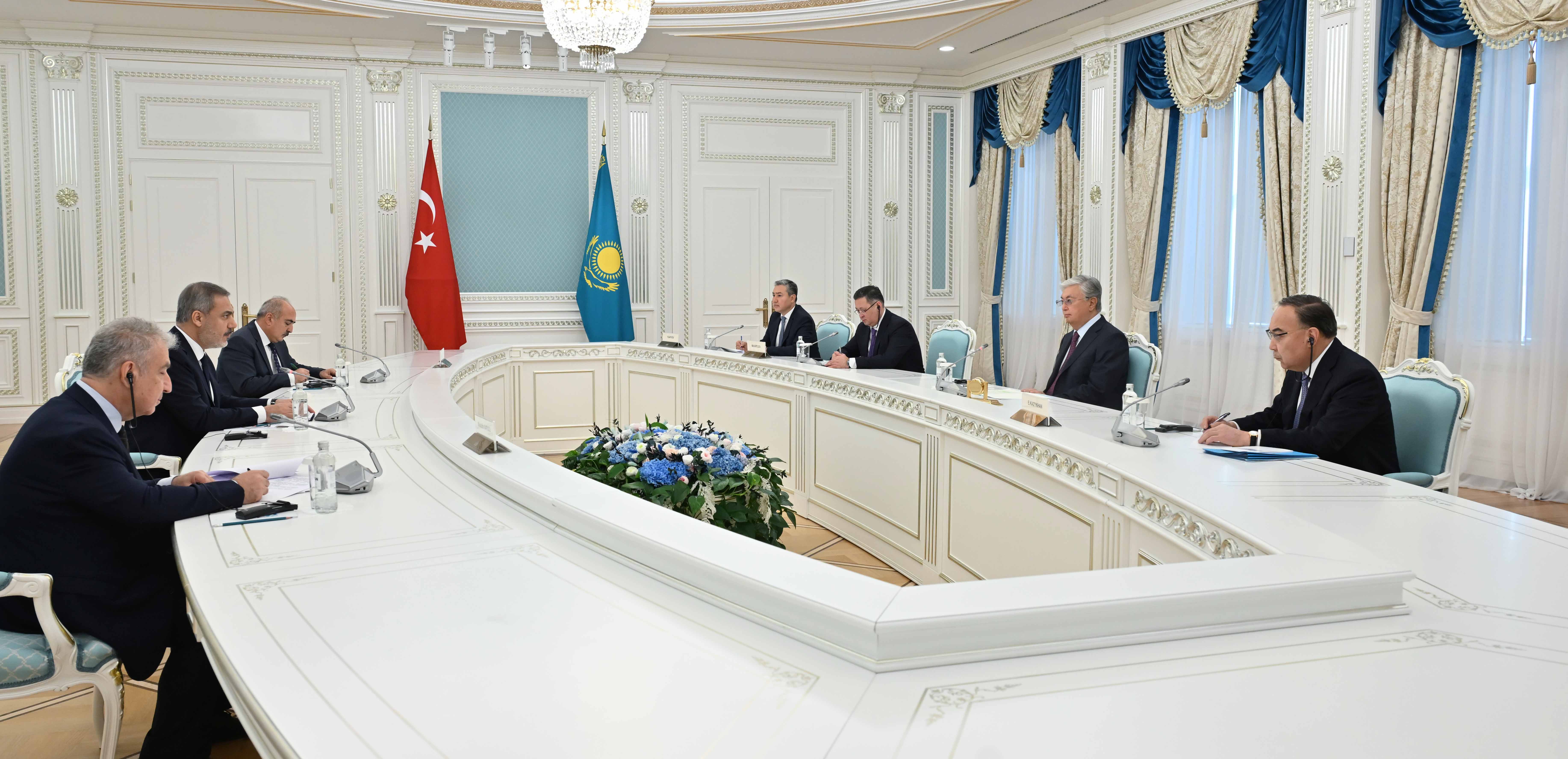 Өз кезегінде Хакан Фидан Мемлекет басшысына Президент Режеп Тайип Ердоғанның сәлемін жеткізіп, Түркия тарапы ортақ күш-жігердің нәтижесінде екі елдің өзара ынтымақтастығын, сондай-ақ аймақтық және халықаралық аренадағы әлеуетін бұдан да жоғары деңгейге жеткізуге ниетті екенін айтты.