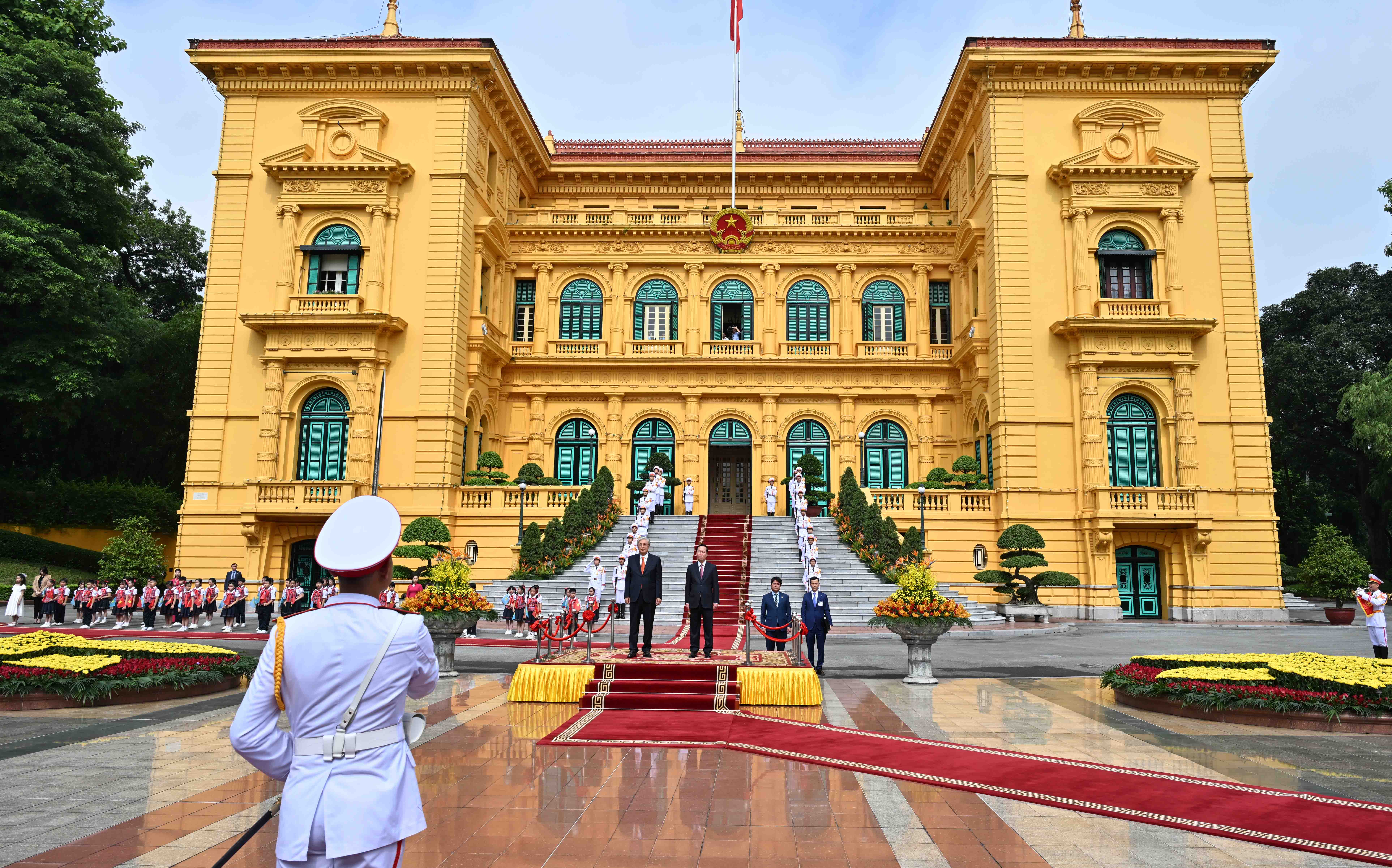Екі ел басшыларына Құрмет қарауылы ротасының бастығы рапорт берген соң, Қазақстан мен Вьетнамның мемлекеттік әнұрандары орындалды. Қасым-Жомарт Тоқаев пен Во Ван Тхыонг бір-біріне ресми делегация мүшелерін таныстырды.
