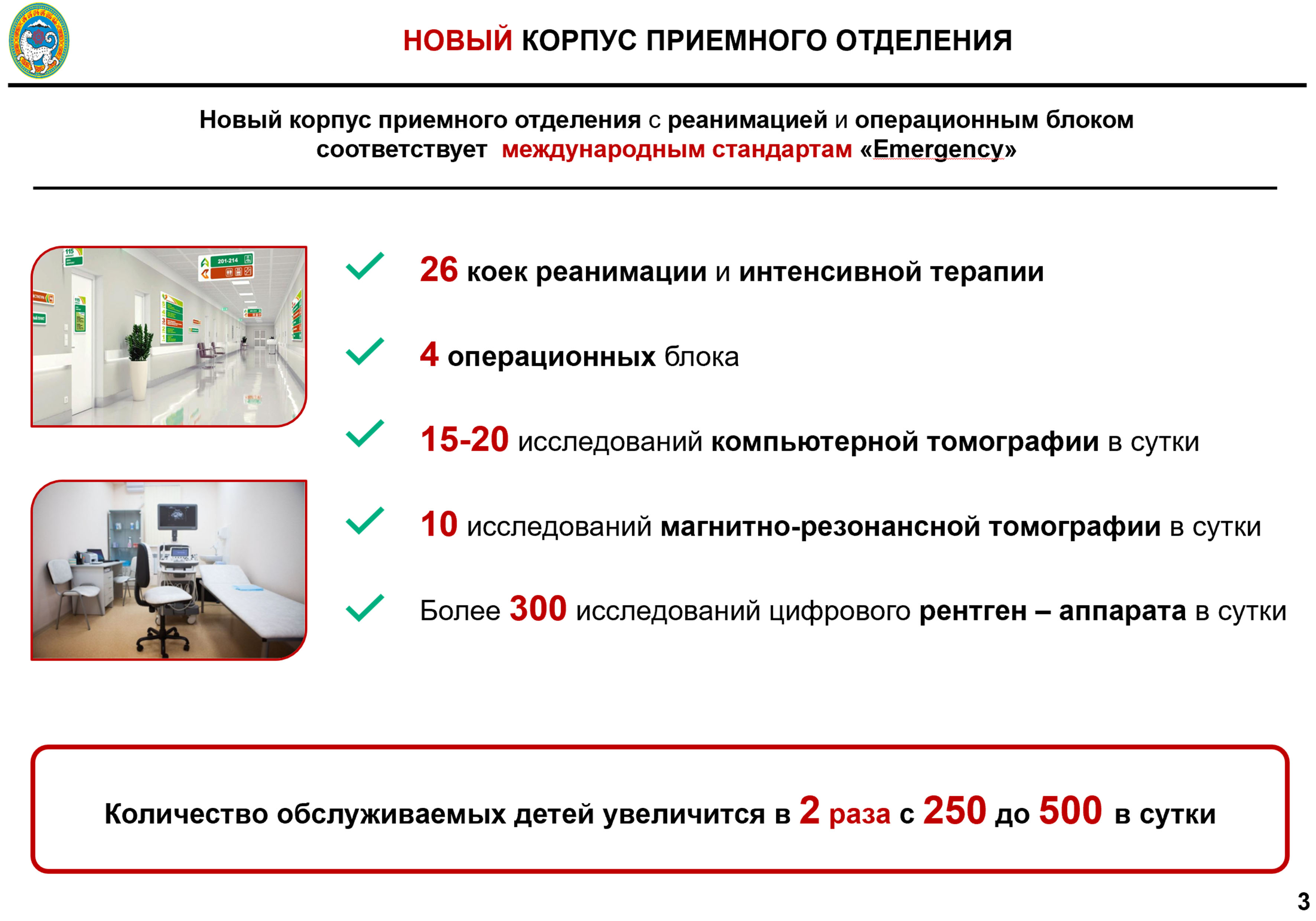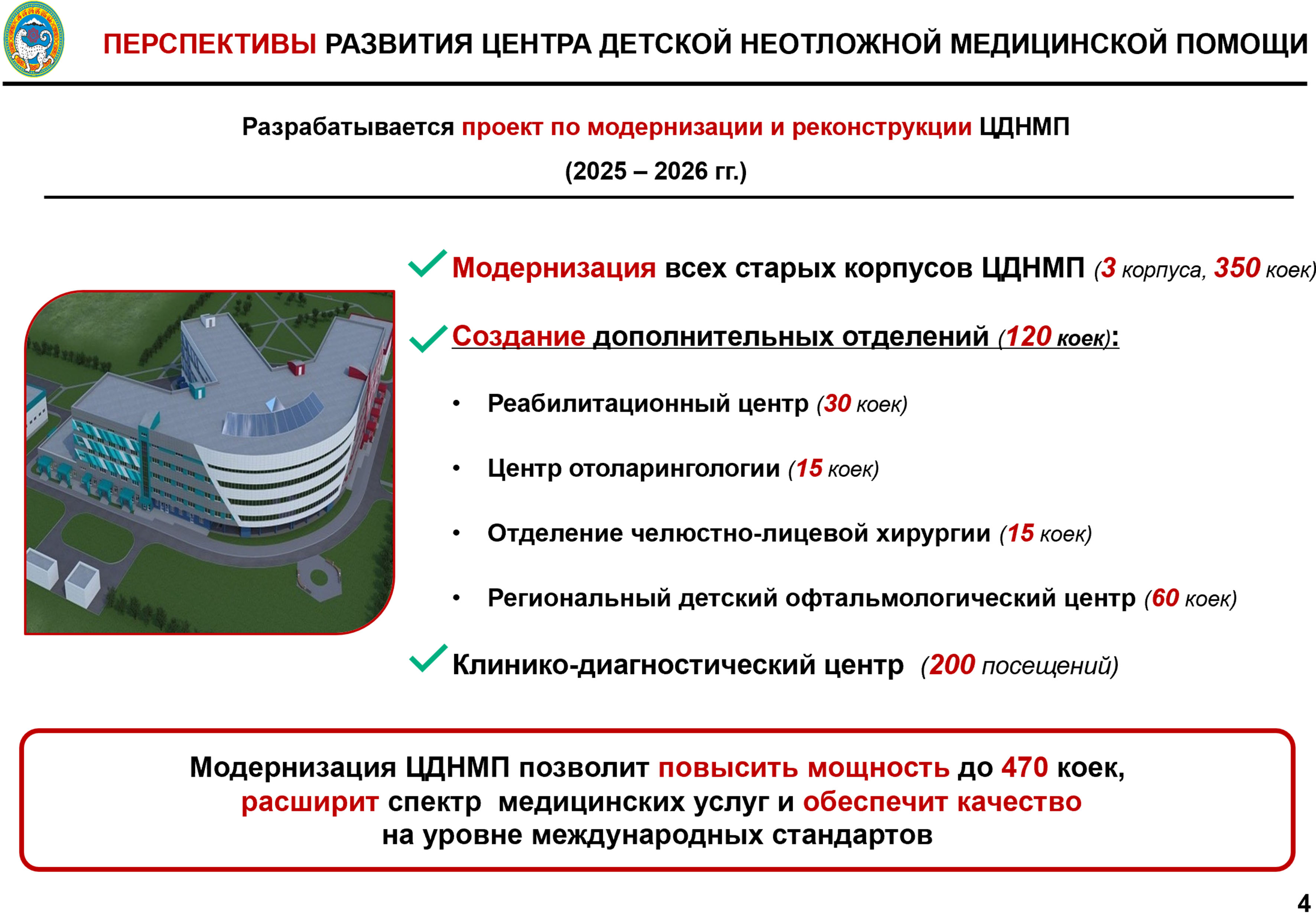 Соңғы үш жылда бұл ауруханада емделушілер саны 30 пайызға артқан. Сол себепті қазір Балалар шұғыл медициналық жәрдем орталығының негізгі ғимаратын жаңарту және реконструкциялау жоспары әзірленіп жатыр. Соған сәйкес ескі корпустардың бәрі күрделі жөндеуден өткізіліп, қосымша оңалту, отоларингология, аймақтық офтольмология орталықтары және жақ-бас сүйек хирургиясы бөлімшелері ашылмақ. Нәтижесінде стационардағы төсек-орын саны 350-ден 470-ке дейін артады. Сондай-ақ көрсетілетін медициналық қызметтердің түрі көбейіп, халықаралық стандарттар деңгейіндегі сапаны қамтамасыз ету мүмкіндігі пайда болады.