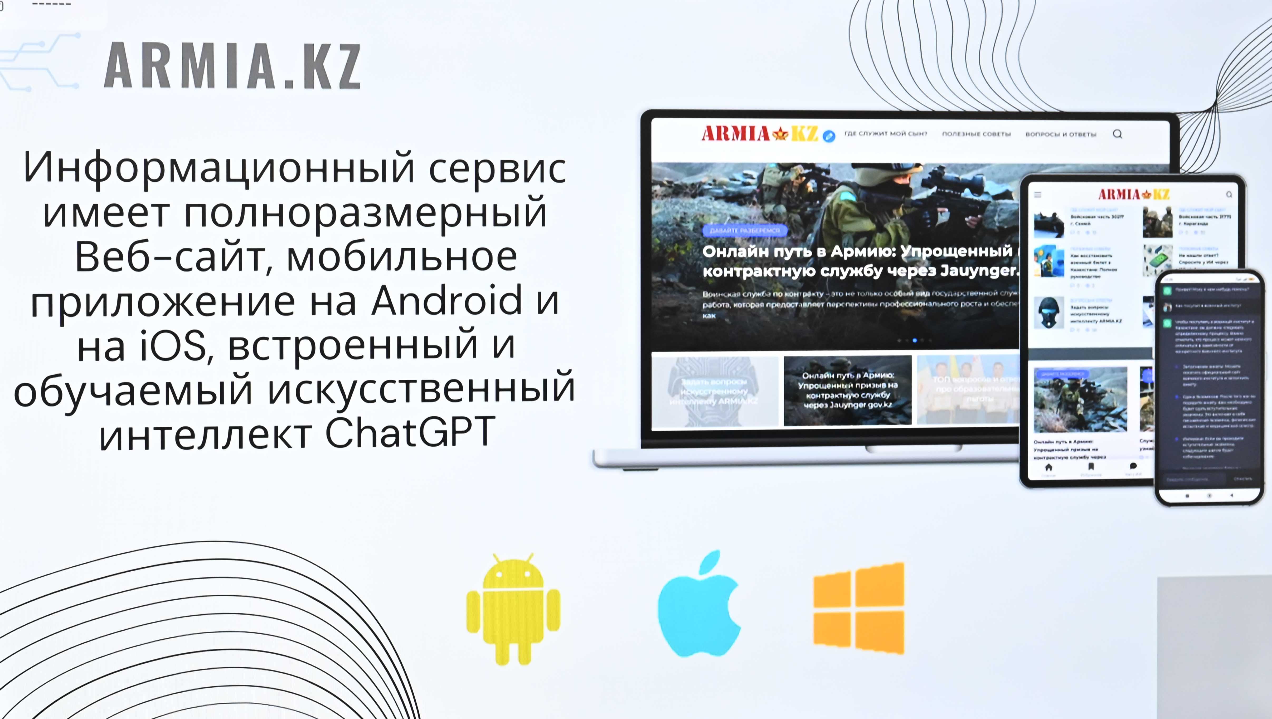 Бұдан бөлек, IT саласы бойынша білімі бар сарбаздар «Халық үніне құлақ асатын мемлекет» қағидатына сәйкес Armia.kz ақпараттық қызметін жасап шыққан. Аталған жоба тәрбие және идеологиялық жұмыстарды ұйымдастыру мақсатында жасанды интеллект арқылы әзірленген. Ата-аналармен кері байланысқа ыңғайлы бұл қызметтің мобильді нұсқасы да бар.