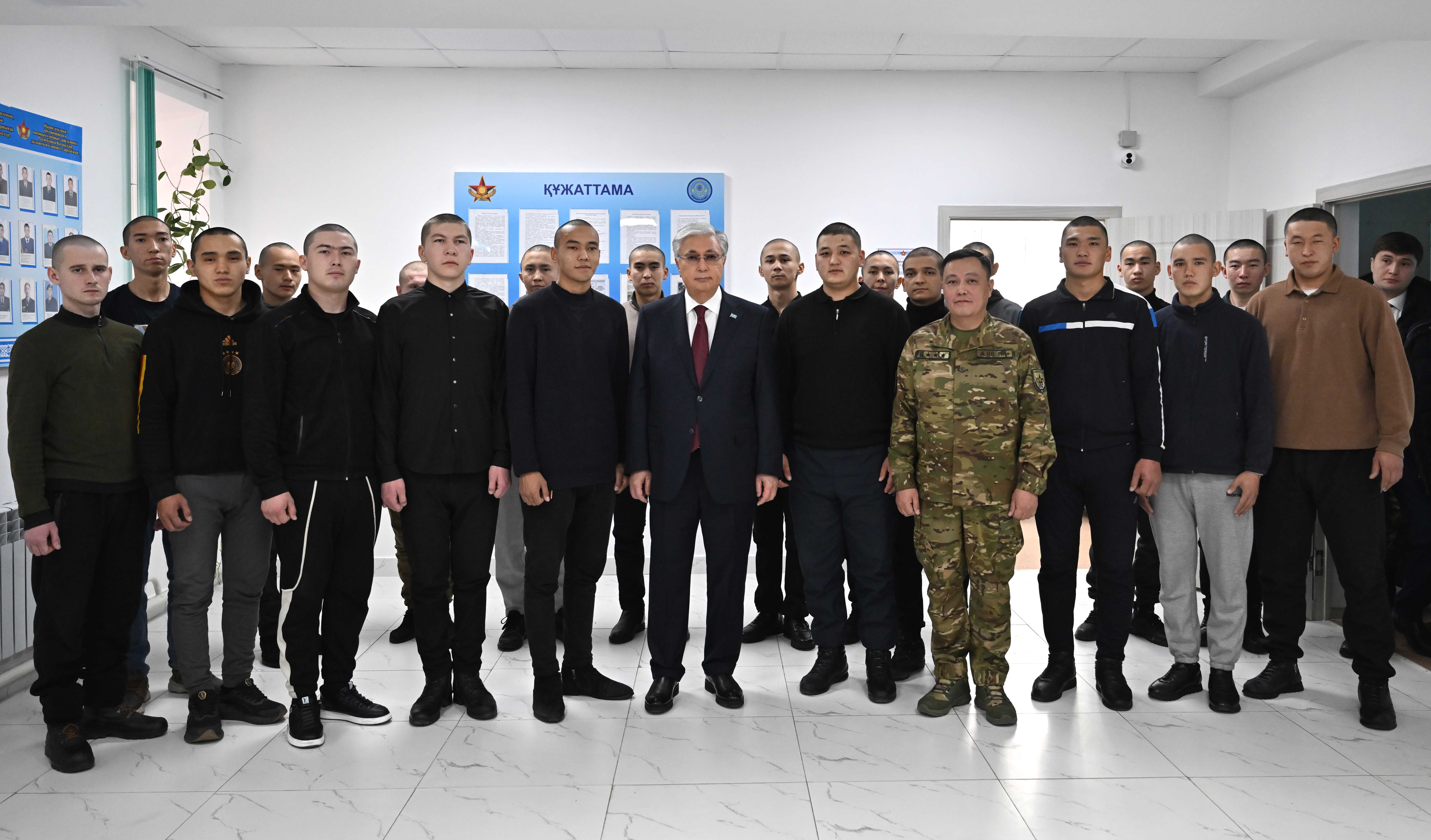 Қасым-Жомарт Тоқаев әскерге шақырылған азаматтармен әңгімелесіп, оларға Отан алдындағы борышын өтеуде сәттілік тіледі.