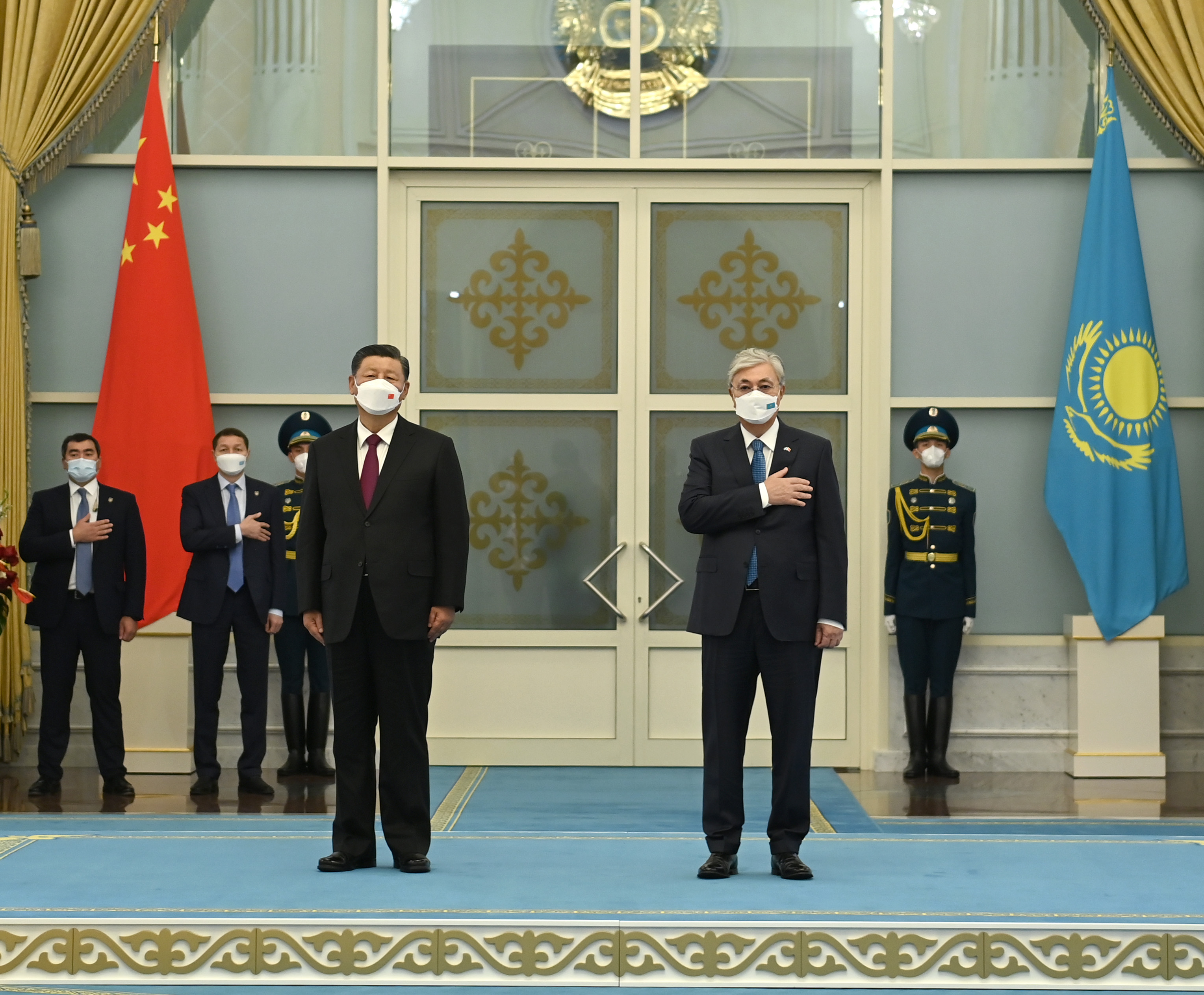 «Ақорда» резиденциясында ҚХР Төрағасын ресми қарсы алу шарасы өтті. Құрмет қарауылының бастығы екі ел басшыларына рапорт беріп, Қазақстан мен Қытайдың мемлекеттік әнұрандары орындалғаннан кейін мемлекеттер басшылары екіжақты келіссөз өткізетін залға барды.