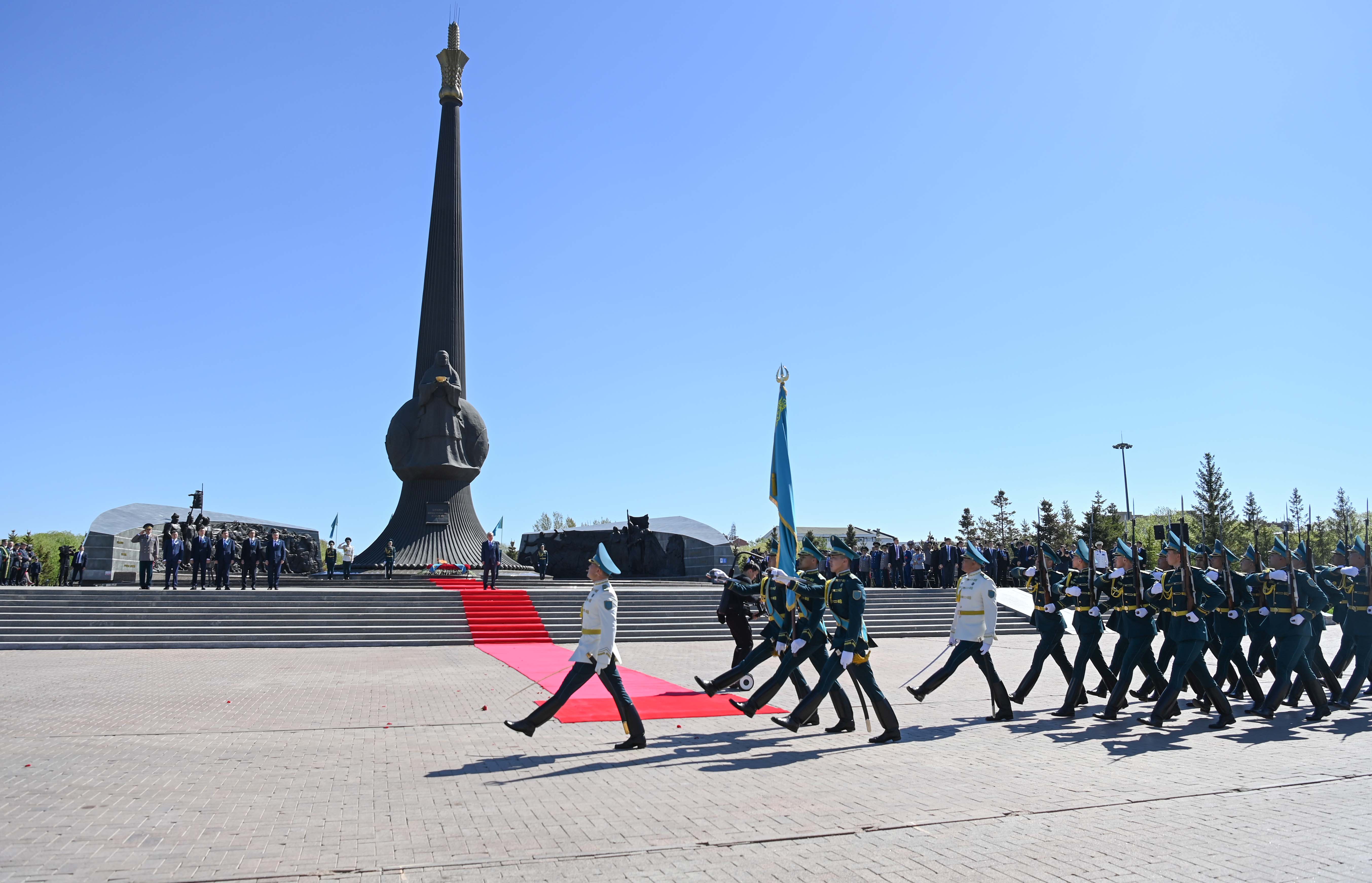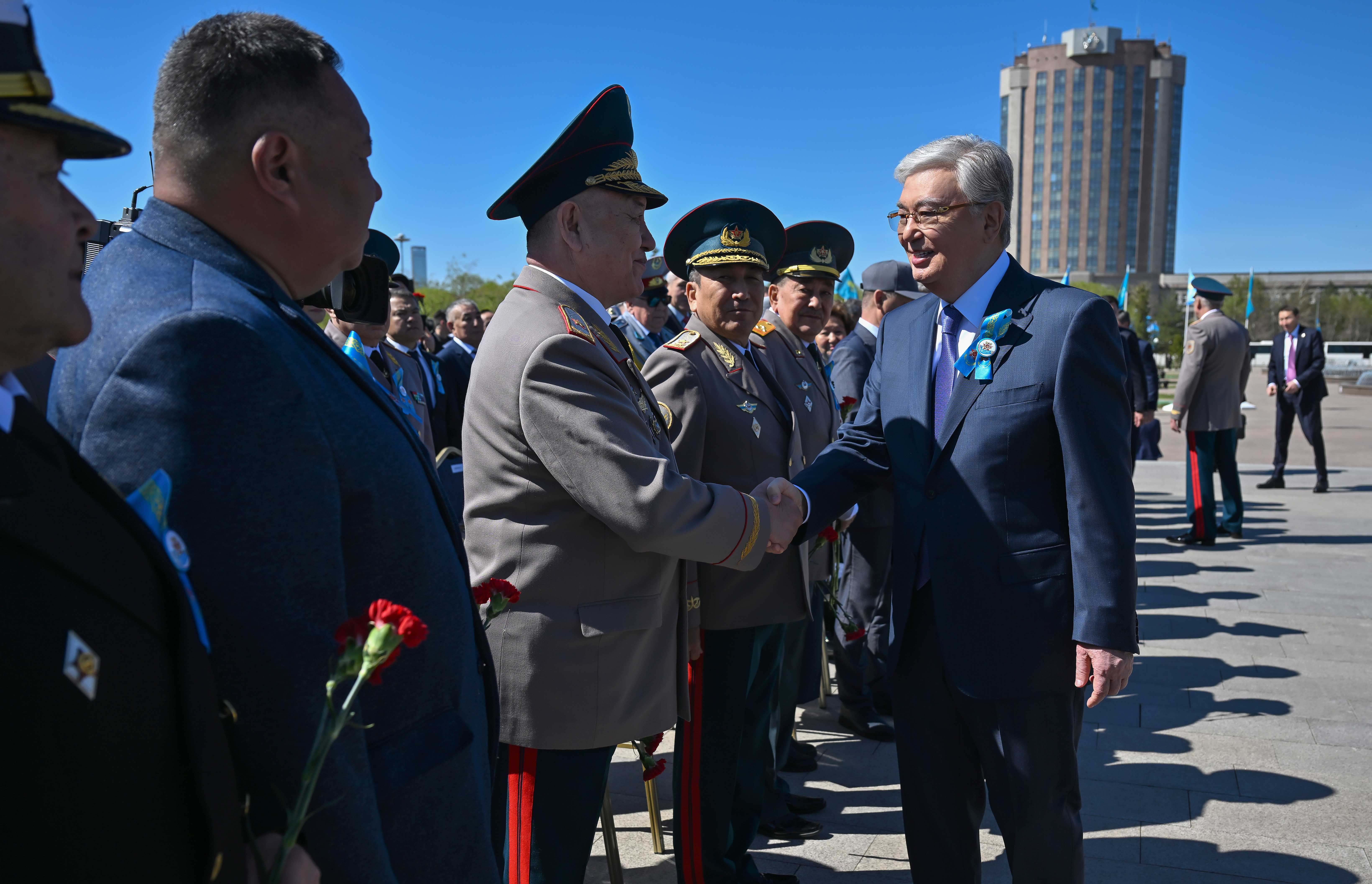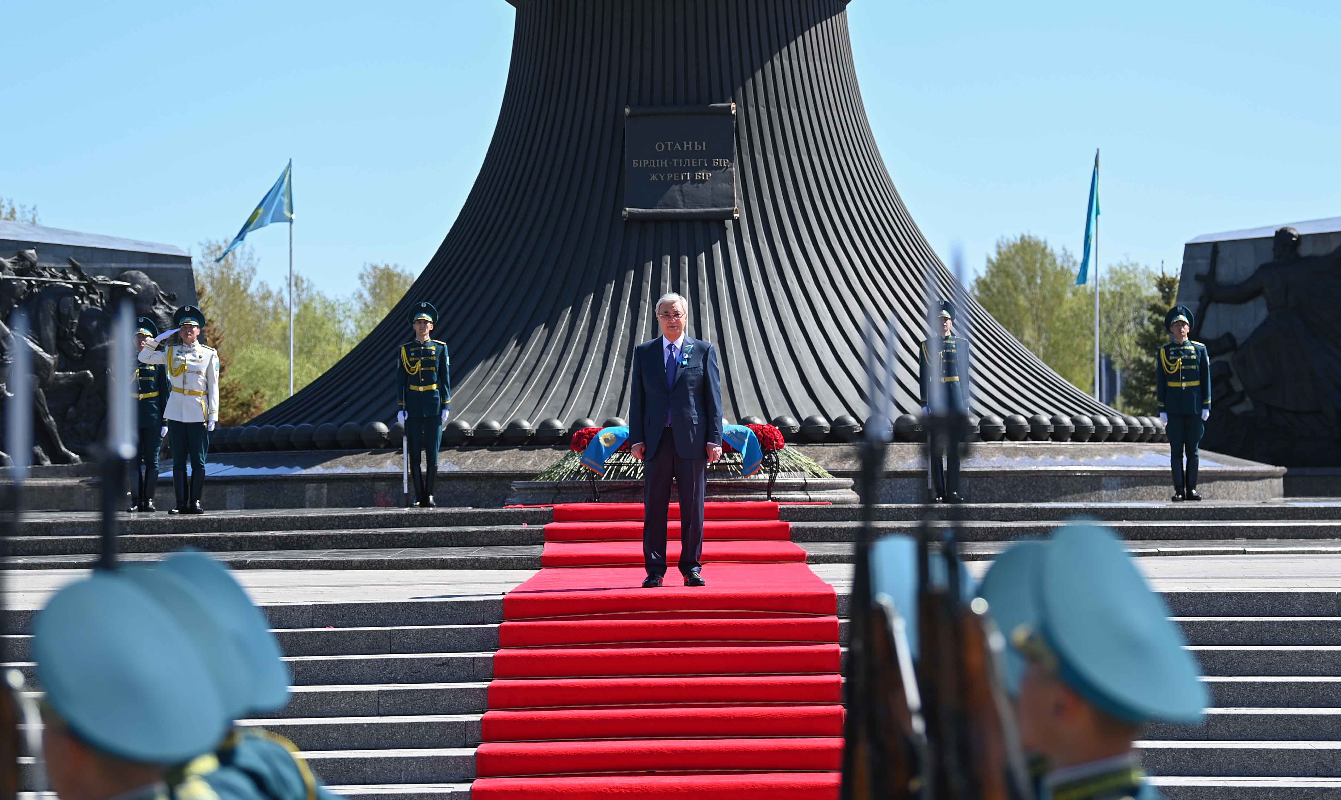 Мемлекет басшысы елордадағы «Отан Ана» монументіне гүл шоғын қойып, Ұлы Отан соғысы жылдарында қаза тапқан жауынгерлердің рухына тағзым етті. Содан кейін Президенттік оркестр Мемлекеттік әнұранды орындап, Құрмет қарауылының ротасы шараға қатысушылар алдынан сап түзеп өтті. Қасым-Жомарт Тоқаев гүл қою рәсіміне жиналған жұртшылықпен жүздесіп, ардагерлерді Жеңіс күнімен құттықтады.