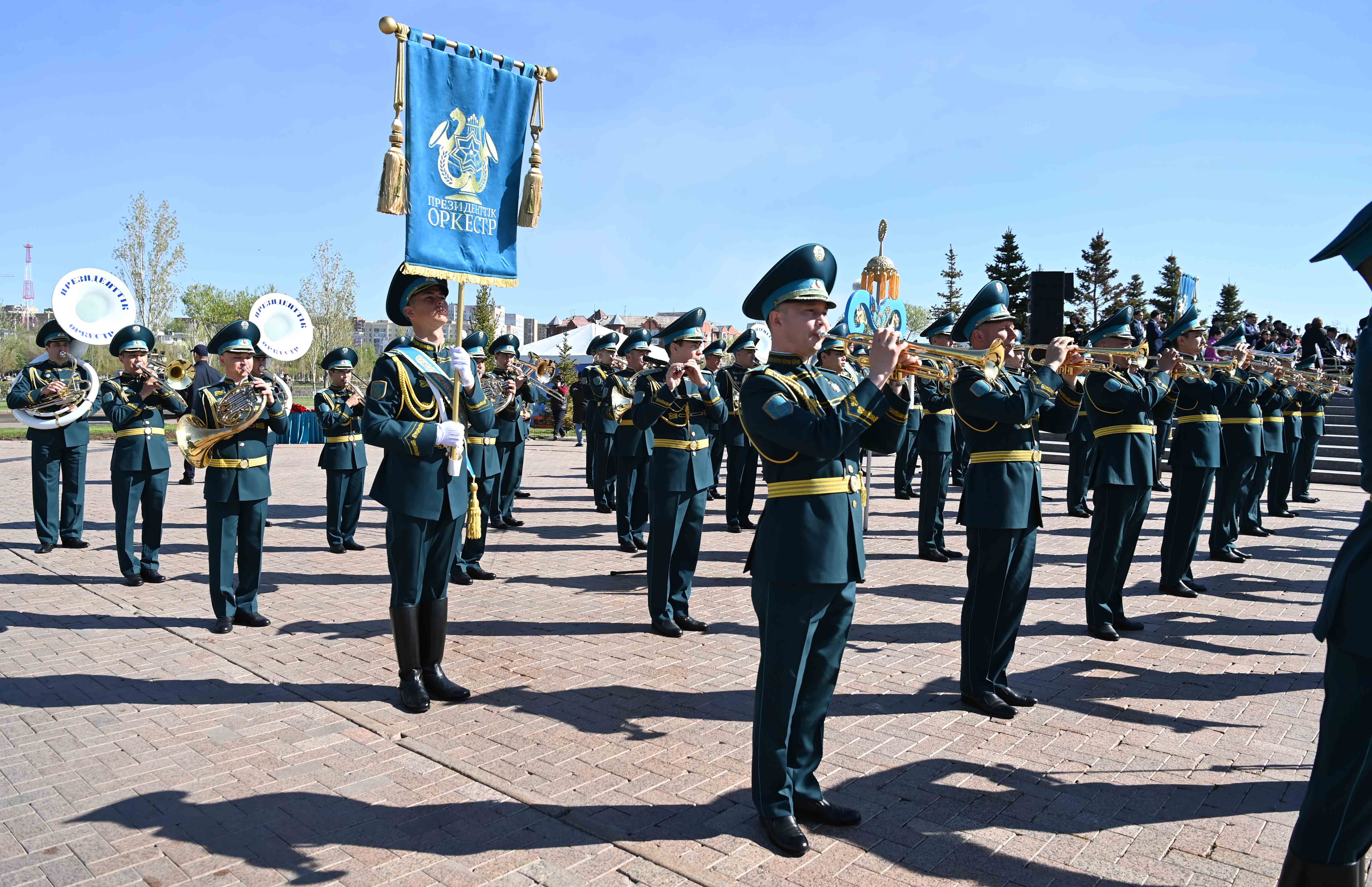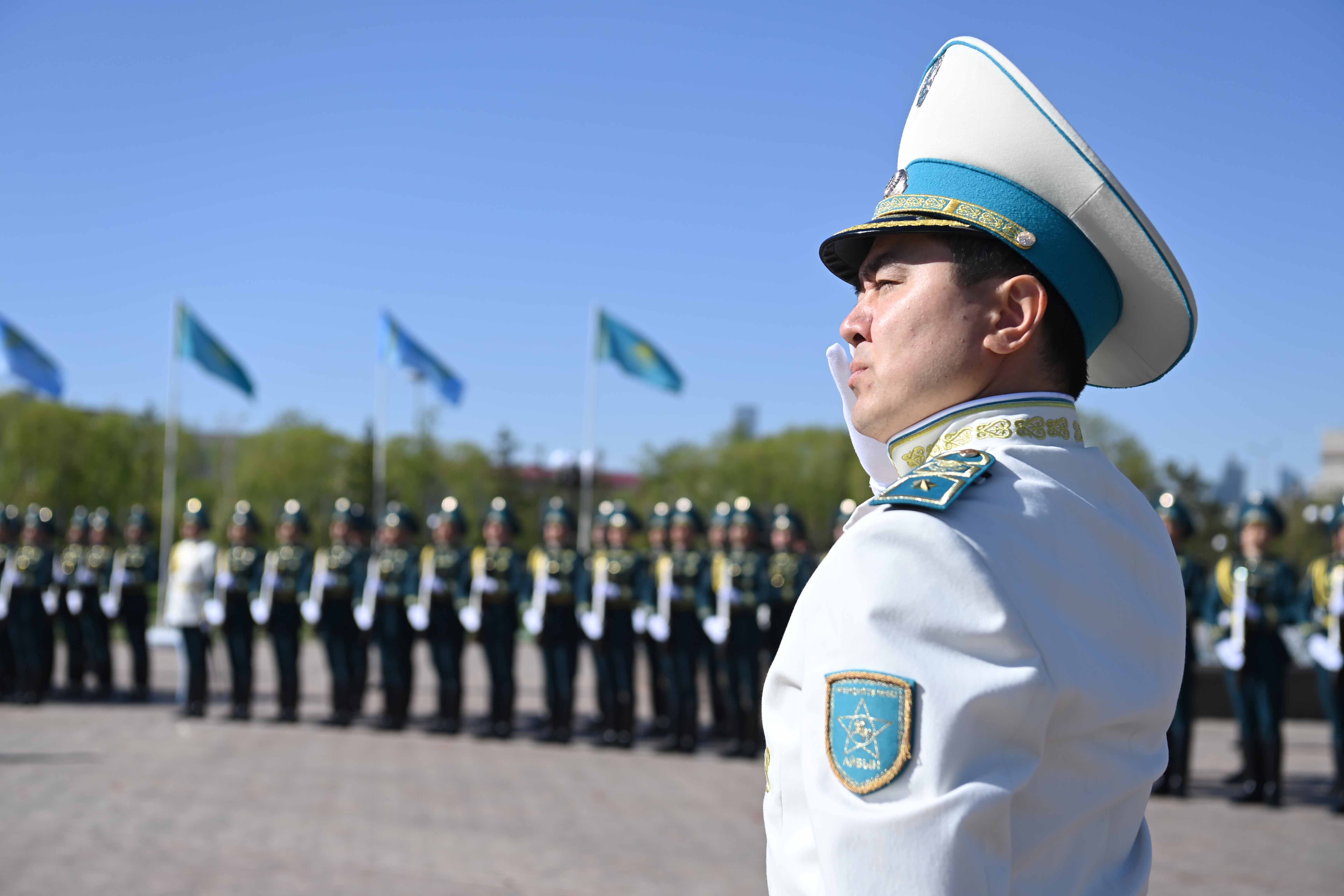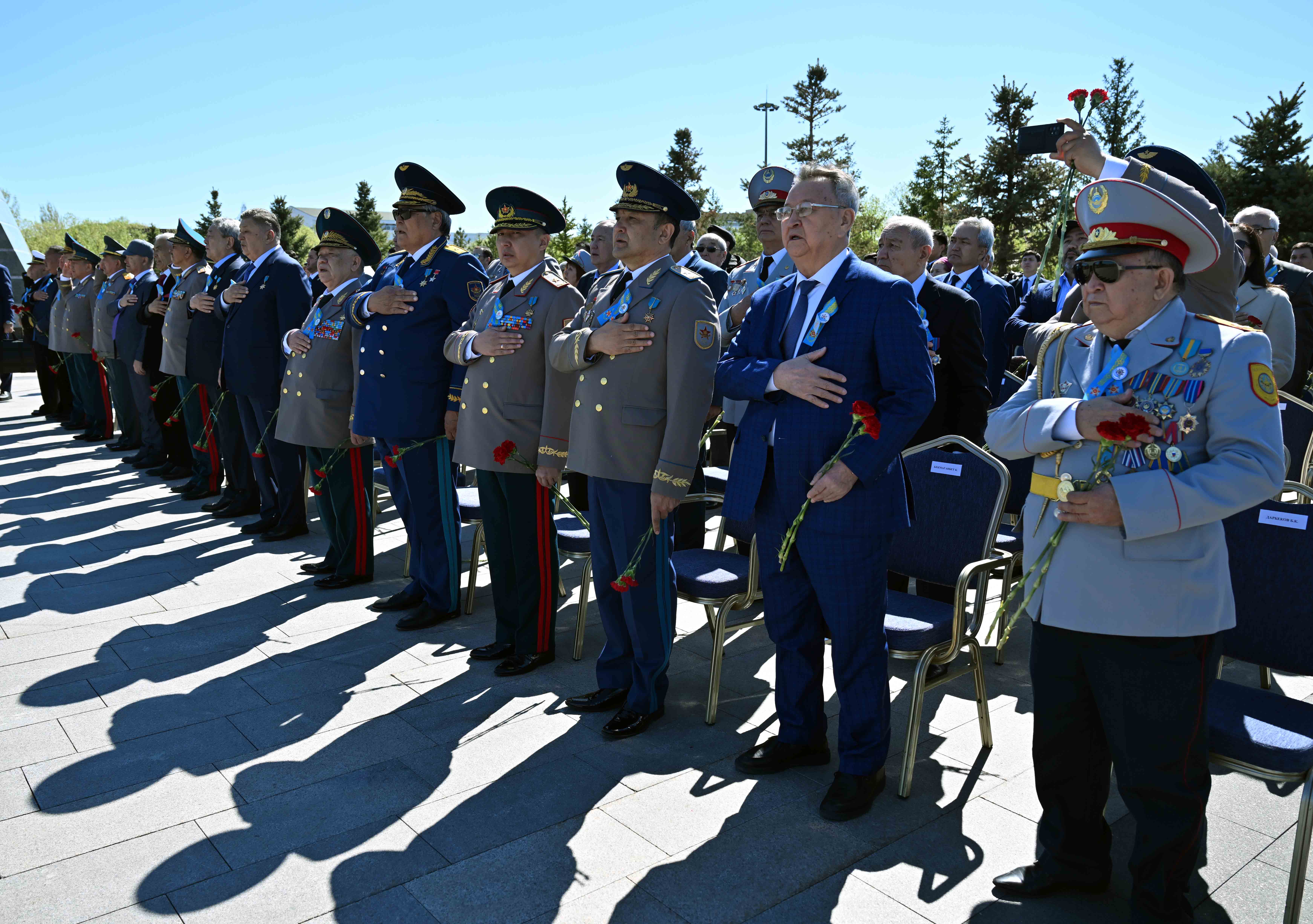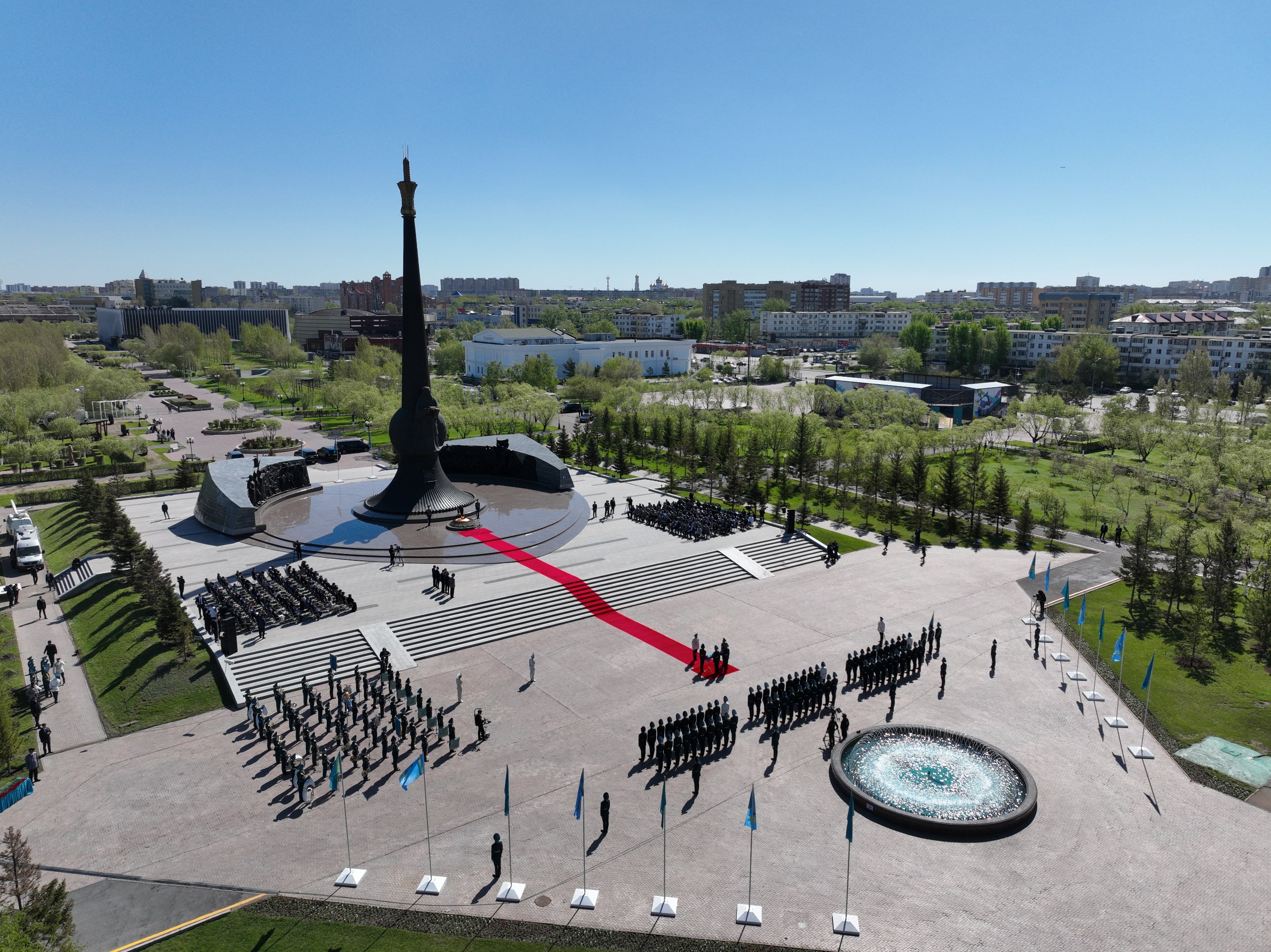 Мемлекет басшысы елордадағы «Отан Ана» монументіне гүл шоғын қойып, Ұлы Отан соғысы жылдарында қаза тапқан жауынгерлердің рухына тағзым етті. Содан кейін Президенттік оркестр Мемлекеттік әнұранды орындап, Құрмет қарауылының ротасы шараға қатысушылар алдынан сап түзеп өтті. Қасым-Жомарт Тоқаев гүл қою рәсіміне жиналған жұртшылықпен жүздесіп, ардагерлерді Жеңіс күнімен құттықтады.