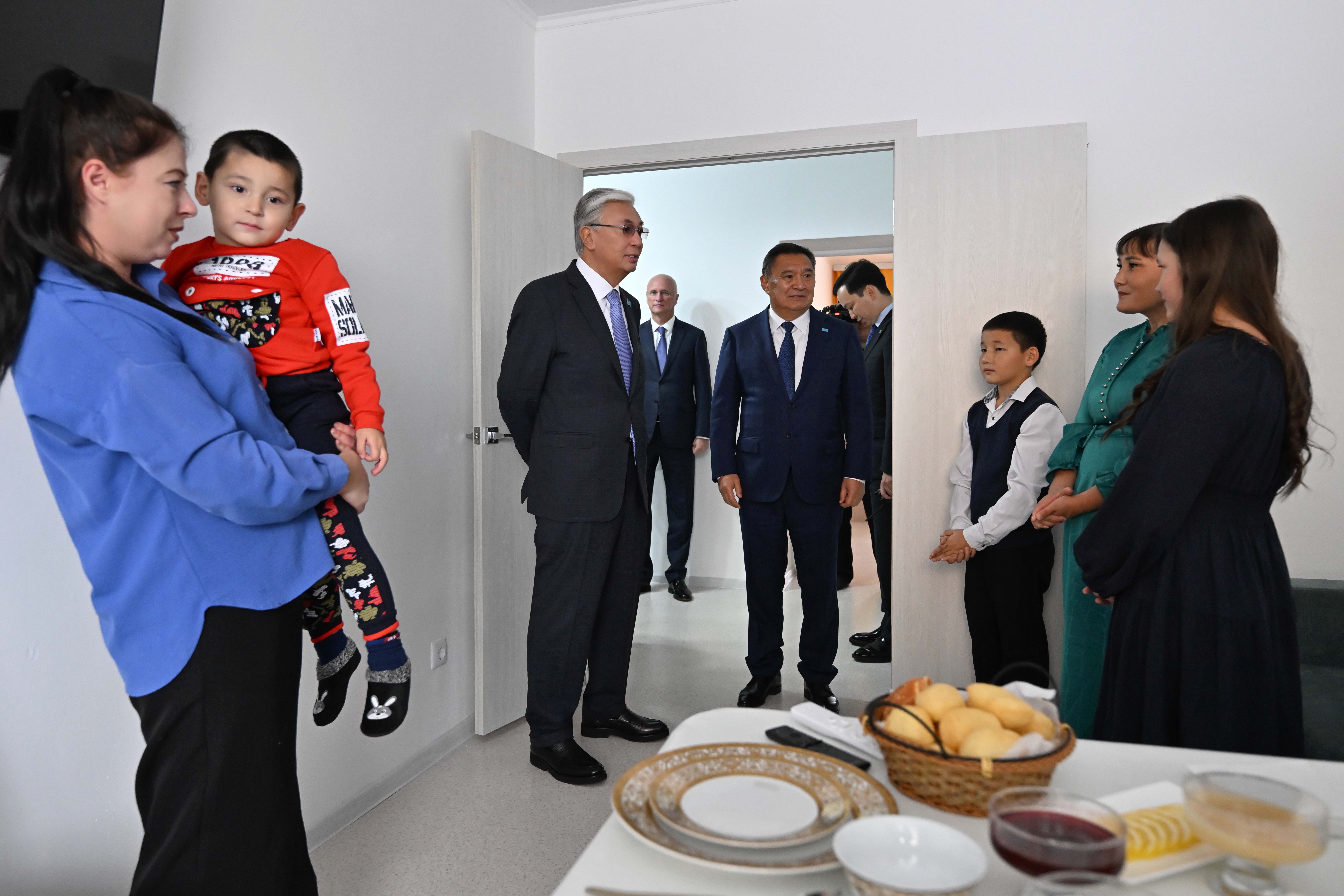 Қасым-Жомарт Тоқаев тұрғын үй кешеніндегі пәтерлерді аралап көріп, жаңа қонысқа көшіп келген отбасылардың бірімен әңгімелесті.