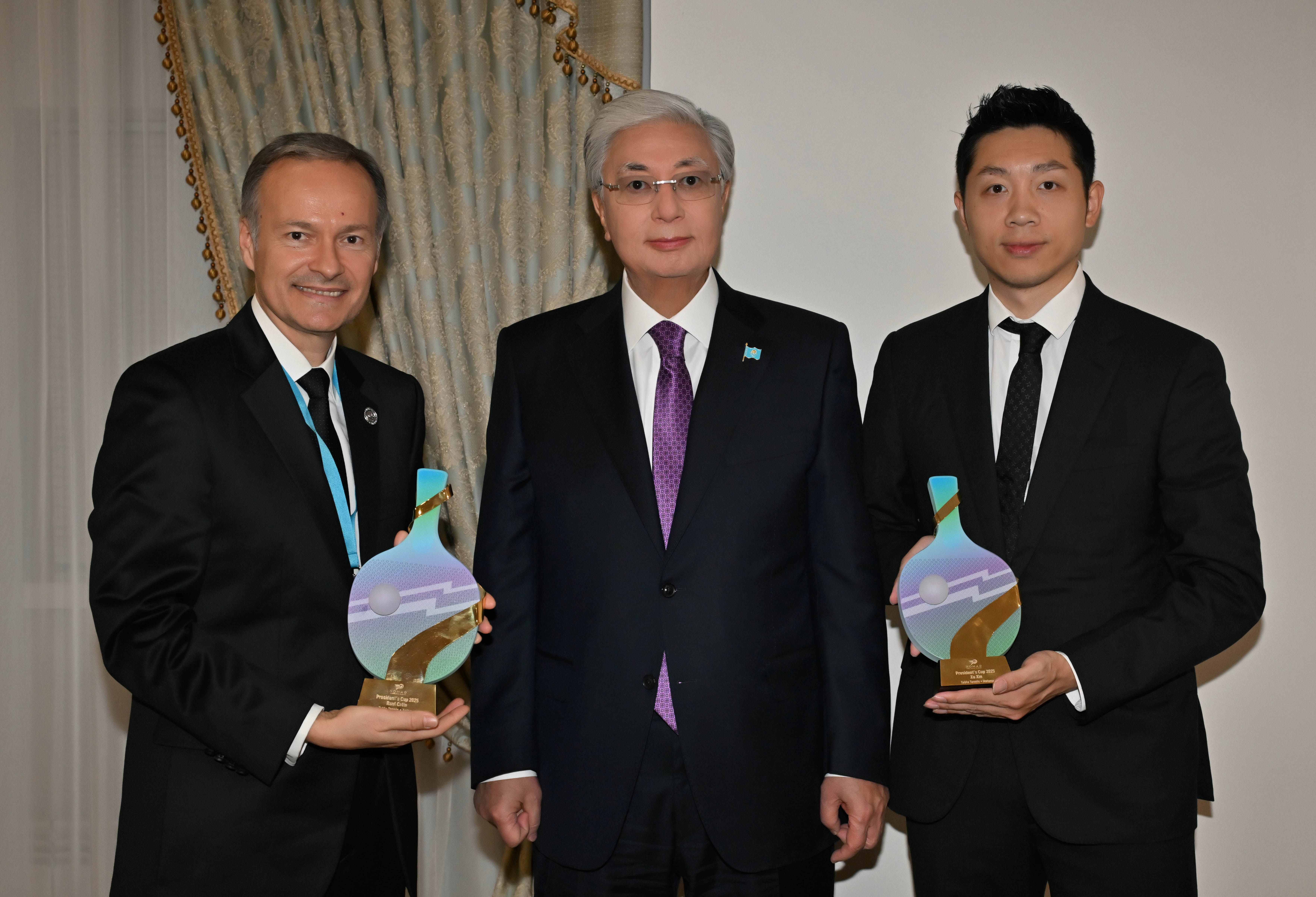 Глава государства провел беседу со звездами и легендами мирового настольного тенниса, в числе которых были чемпион Олимпийских игр Сюй Синь (Китай), чемпион мира и призер Олимпийских игр Шлагер Вернер (Австрия), чемпионы мира Фан Бо (Китай) и Чу Се Хёк (Республика Корея).