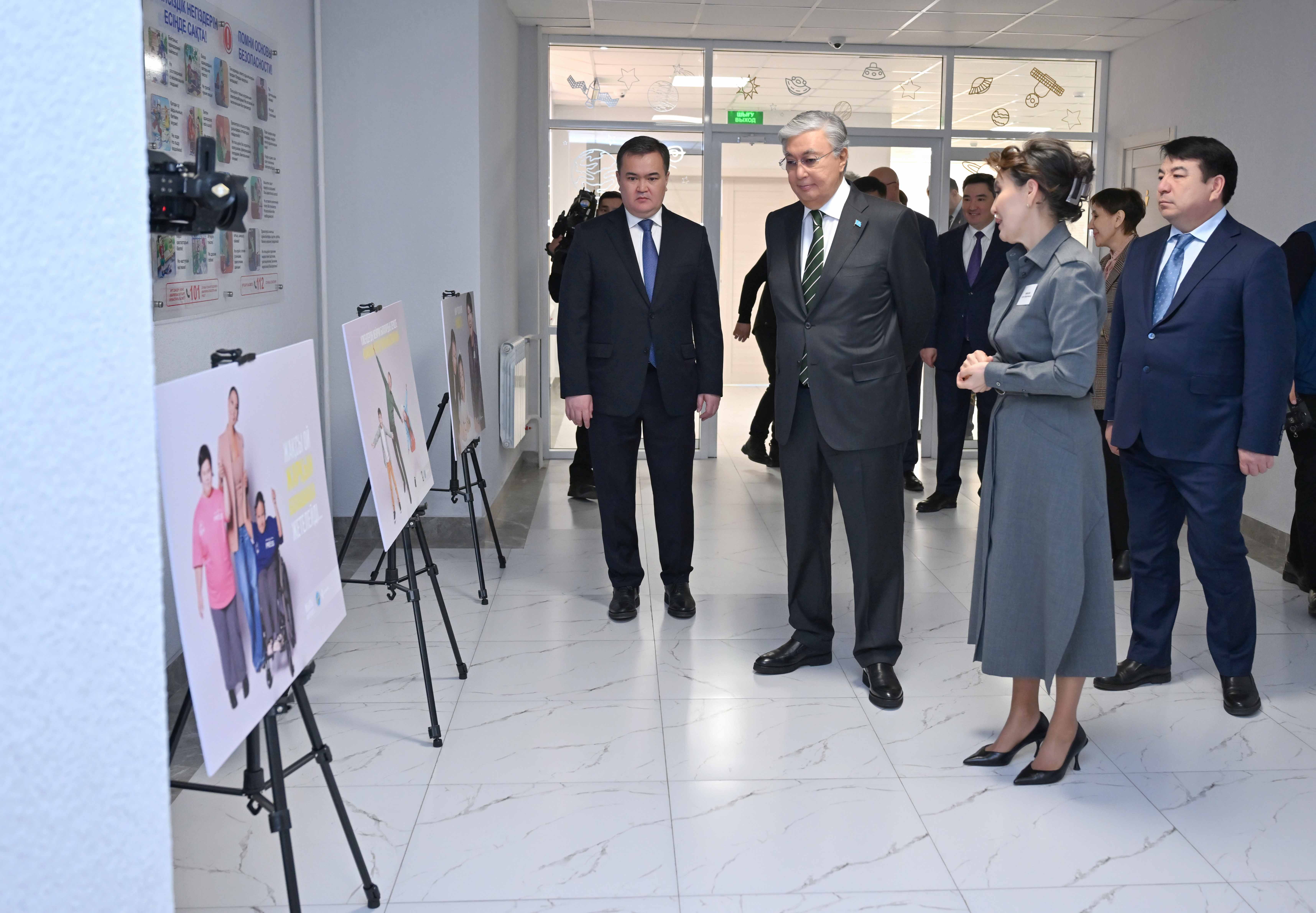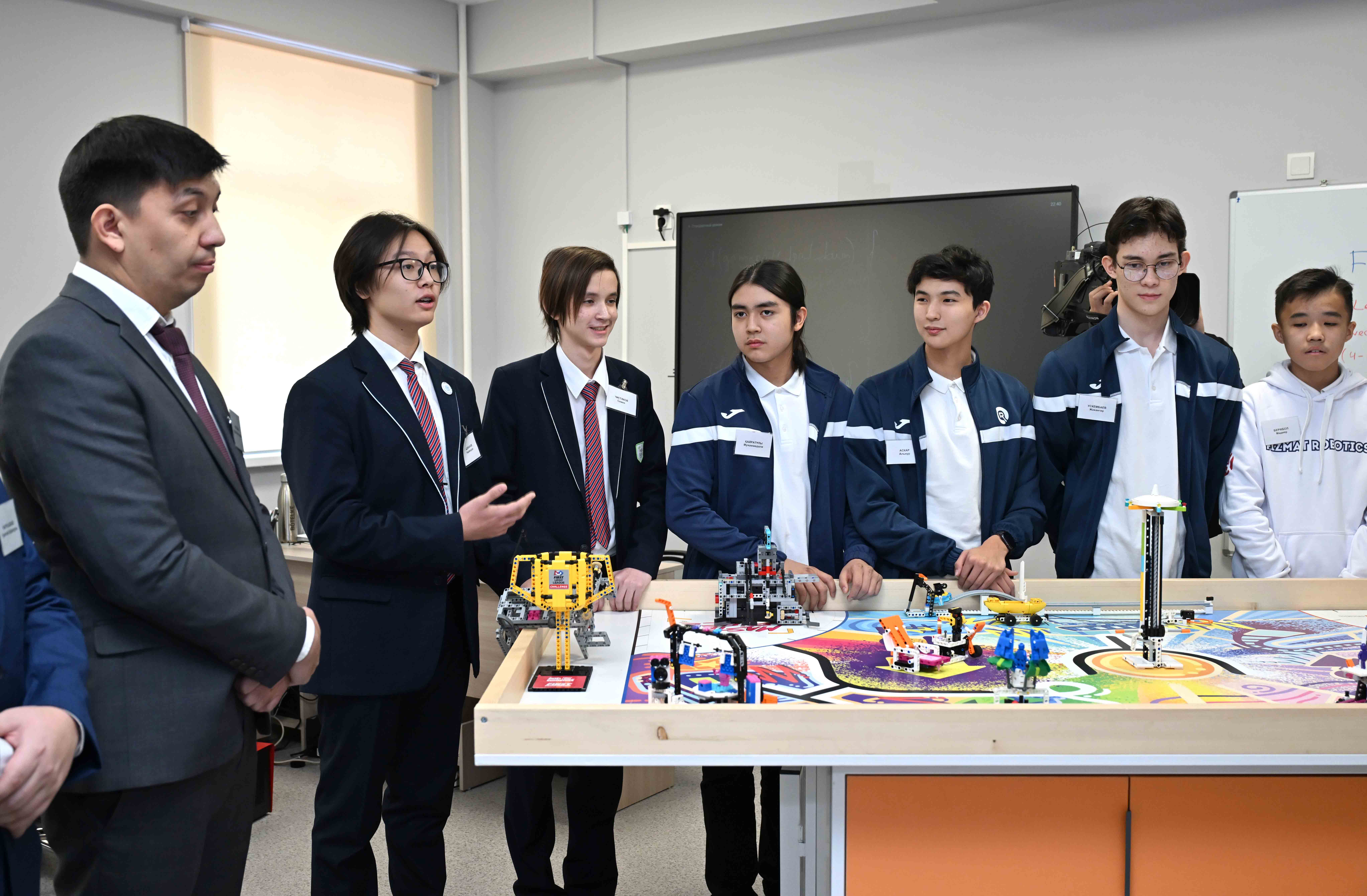 Глава государства осмотрел спортивный зал, кабинет робототехники и пообщался с учениками.