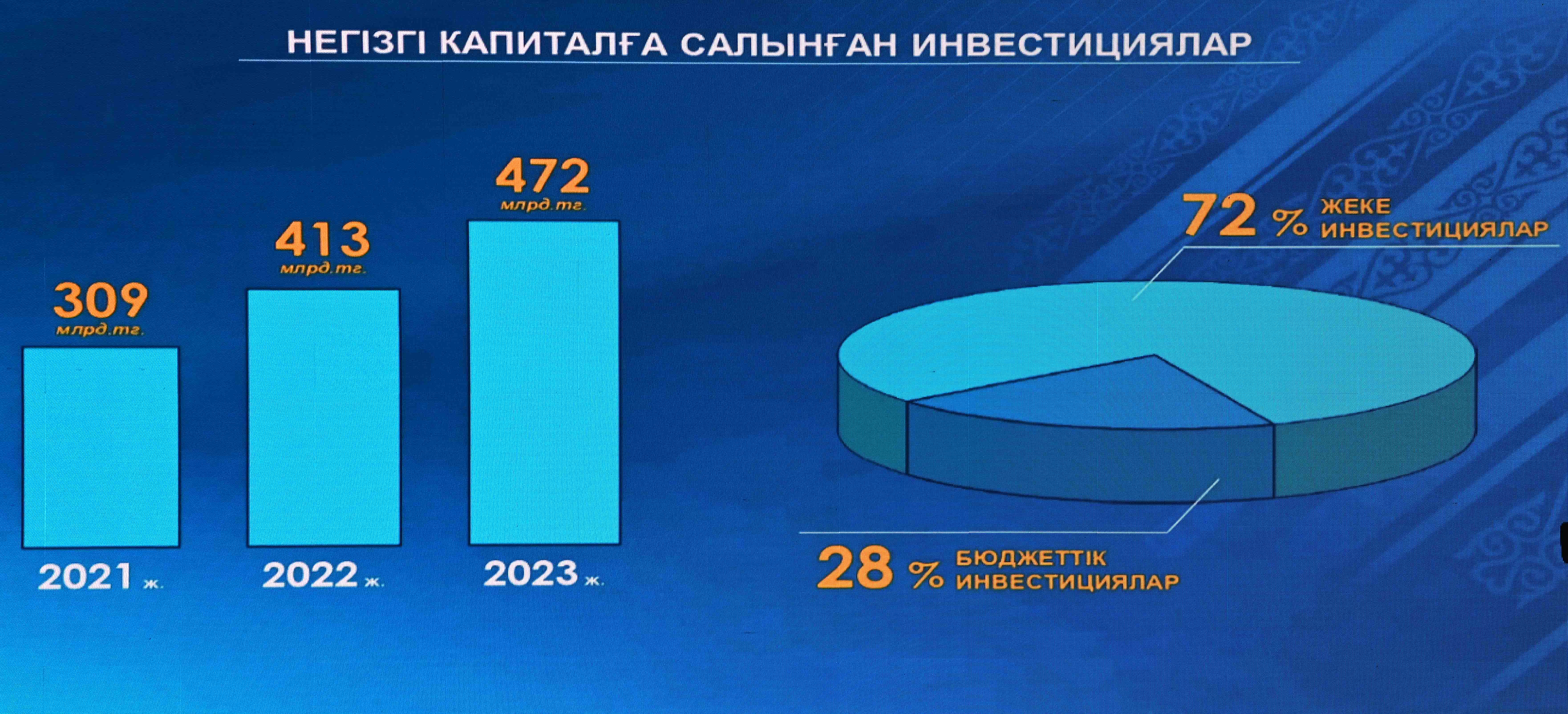 По информации главы региона, наблюдается рост показателей социально-экономического развития. В частности, объем производства в обрабатывающей промышленности увеличился на 115,8% (227 млрд тенге), сельском хозяйстве – на 101,6% (157 млрд тенге), строительстве – на 126,4% (117 млрд тенге), жилищном строительстве – на 118,9% (618 тыс. кв. м), торговле – на 104,1% (531 млрд тенге). Объем инвестиций в основной капитал в текущем году планируется довести до 472 миллиардов тенге. Большая часть из них приходится на частные инвестиции.