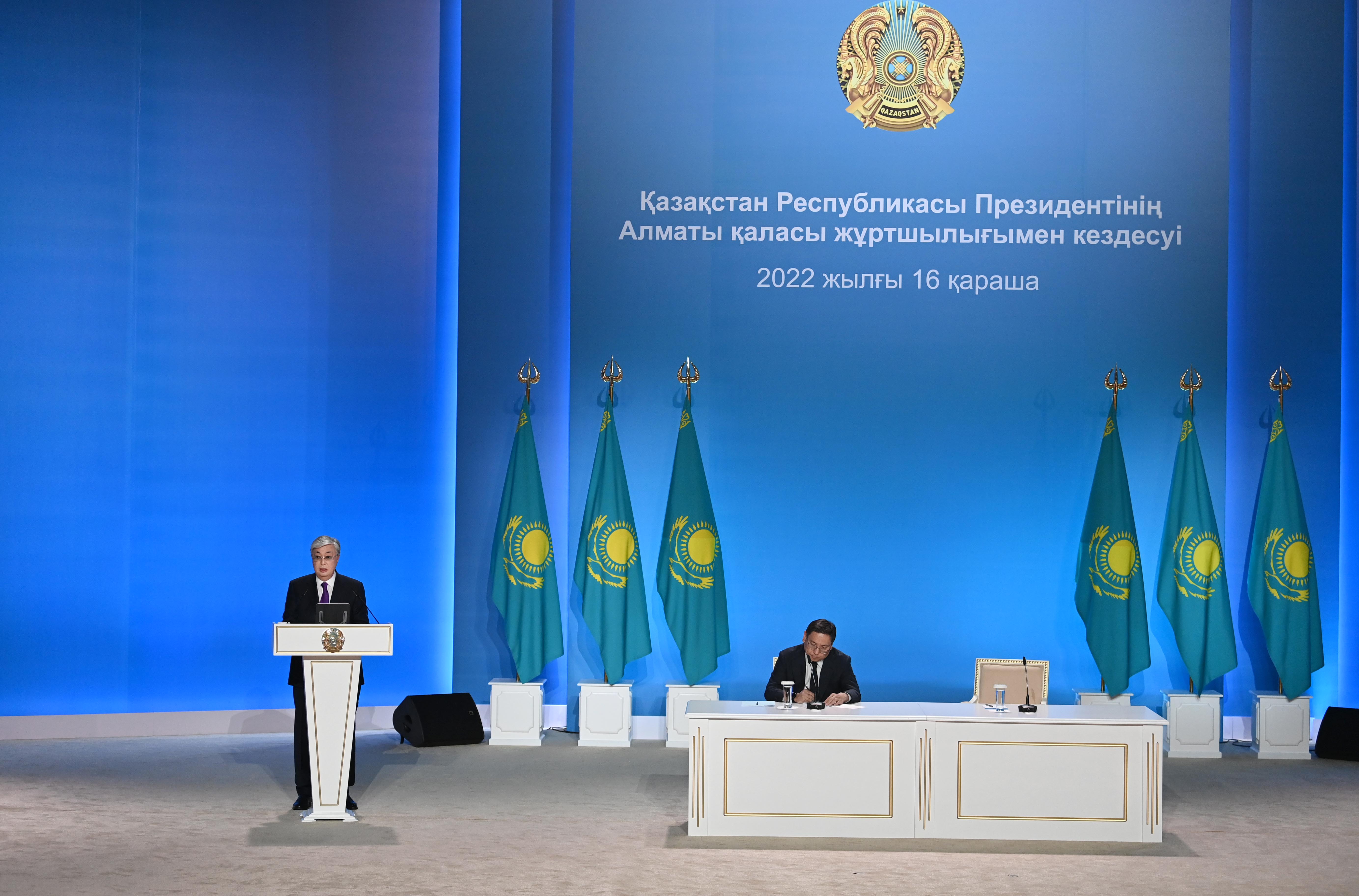 Поприветствовав участников встречи, Касым-Жомарт Токаев в своем выступлении отметил особую роль Алматы в истории Казахстана. Он напомнил, что именно здесь была подписана Декларация о суверенитете и провозглашена Независимость Казахстана.