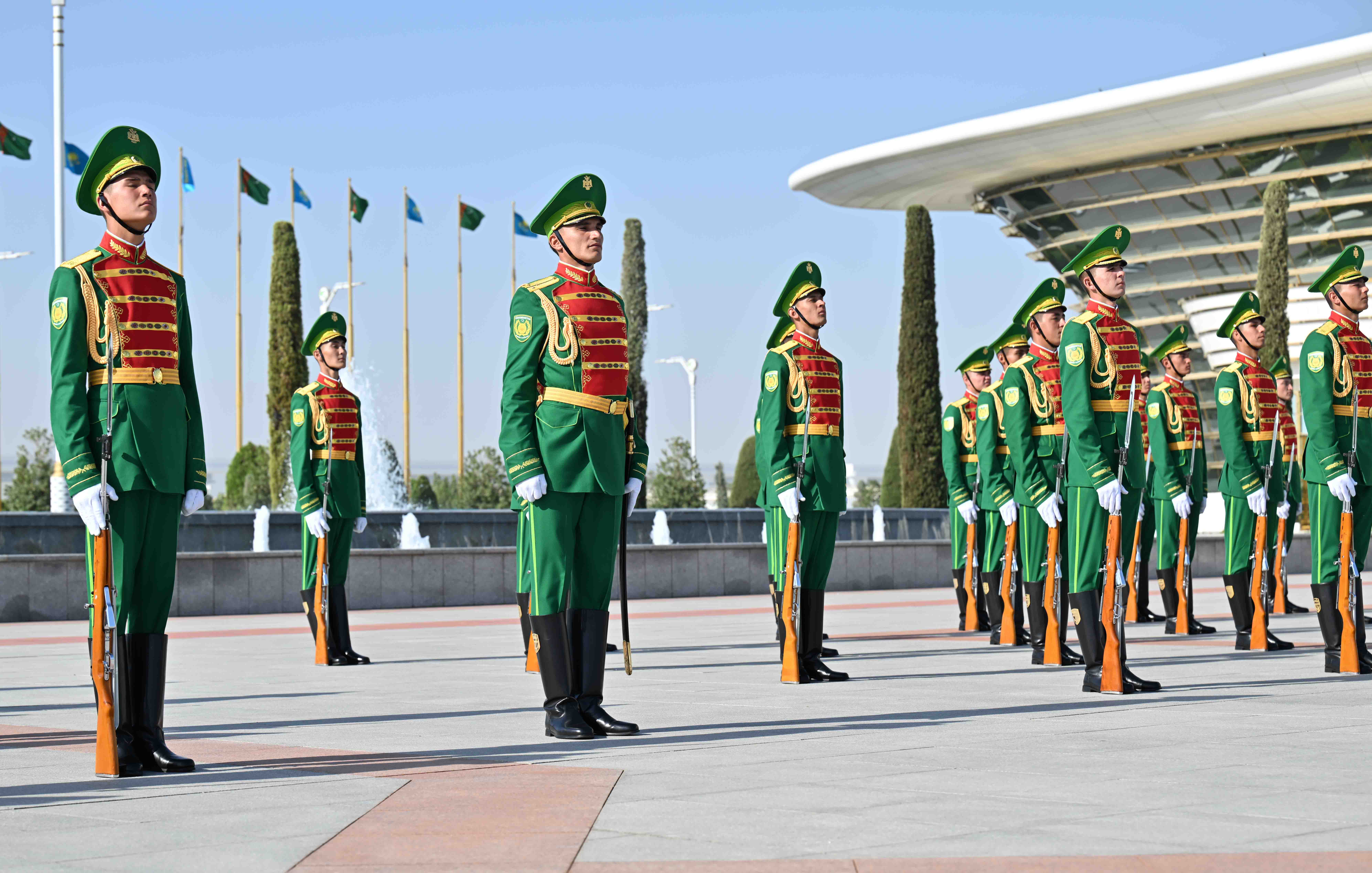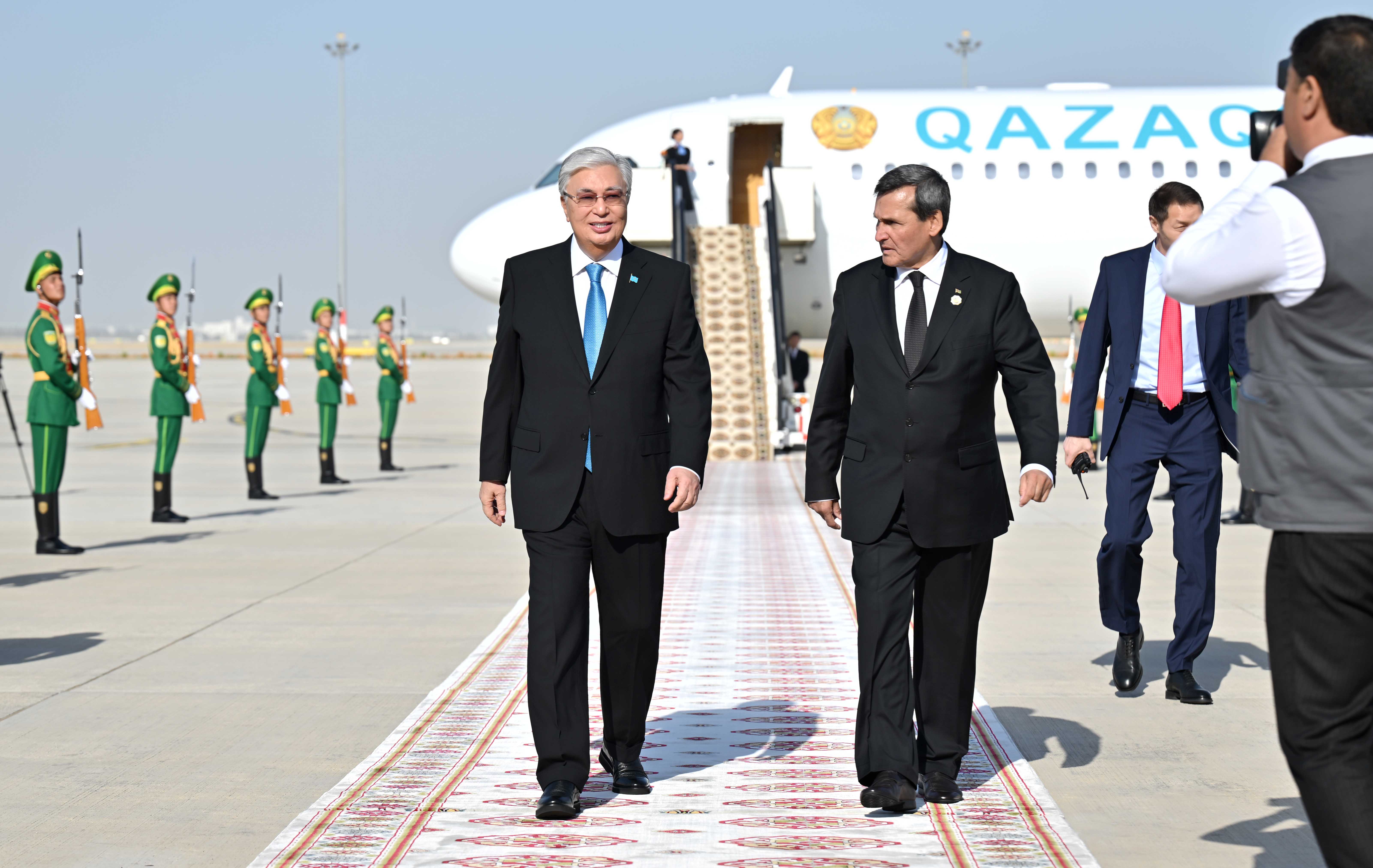 Национальный лидер туркменского народа лично встретил Касым-Жомарта Токаева в аэропорту Ашхабада. У трапа президентского борта была выстроена рота почетного караула, начальник которого отдал приветственный рапорт, затем прозвучали государственные гимны двух стран.