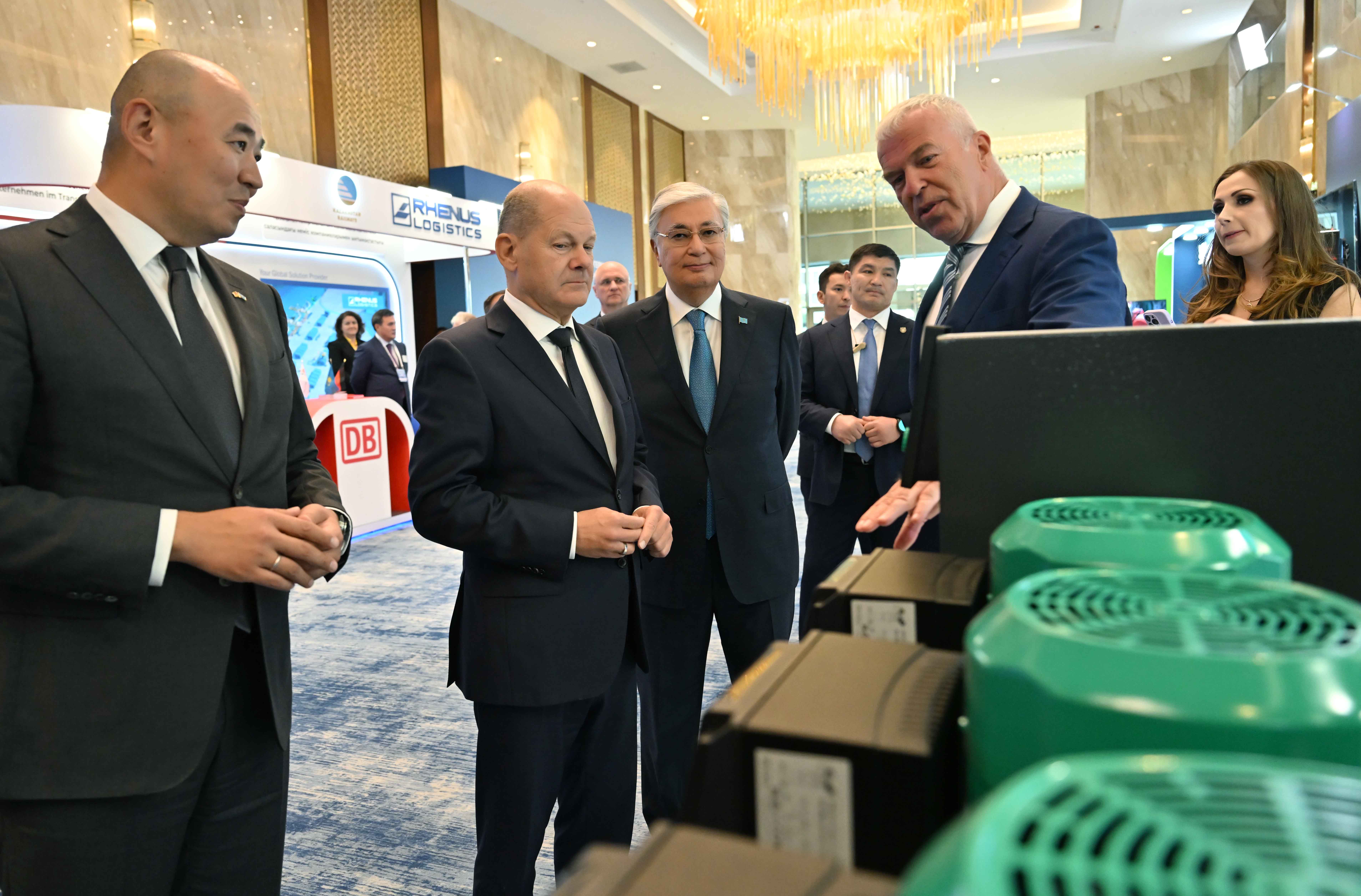 Перед началом форума Президент Казахстана и Федеральный канцлер Германии осмотрели выставку, посвященную казахско-германским совместным проектам в сферах энергетики, машиностроения, логистики, горно-металлургической отрасли и сельского хозяйства.