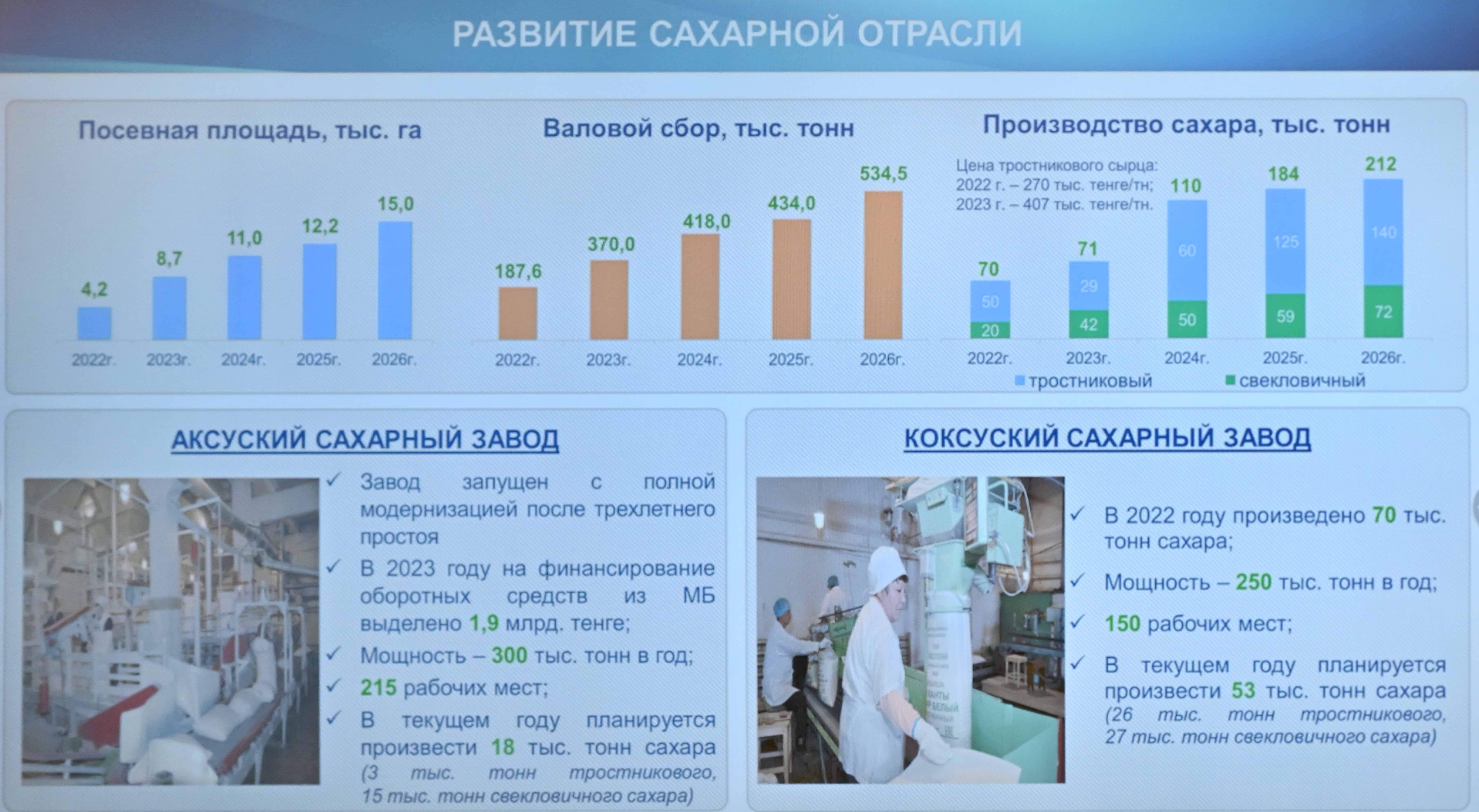 В целях реализации поручения Главы государства был полностью отремонтирован и введен в эксплуатацию Аксуский сахарный завод. Коксуским сахарным заводом выпущено 70 тысяч тонн сахара. На сегодняшний день эти предприятия приняли более 205 тысяч тонн сырья от 280 хозяйств, из которых переработано 56 тысяч тонн и получено 7 тысяч тонн сахара.
