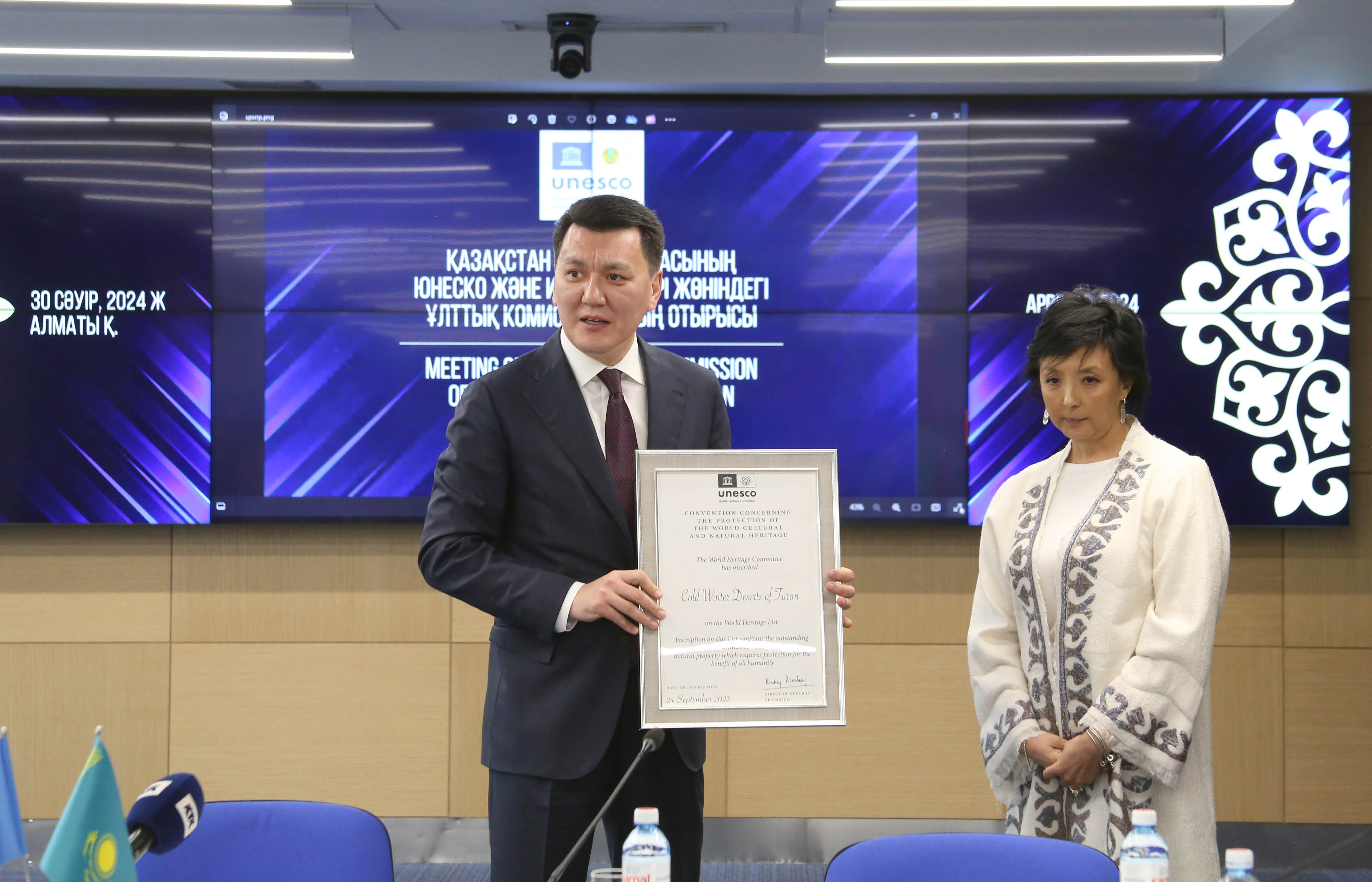В ходе заседания исполняющая обязанности главы регионального офиса ЮНЕСКО в Алматы Айгуль Халафова вручила Председателю Национальной комиссии по делам ЮНЕСКО и ИСЕСКО Ерлану Карину оригинал сертификата о включении в Список ЮНЕСКО в 2023 году национального парка «Алтын-Эмель» и заповедника «Барсакельмес», как части транснациональной номинации «Холодные зимние пустыни Турана».