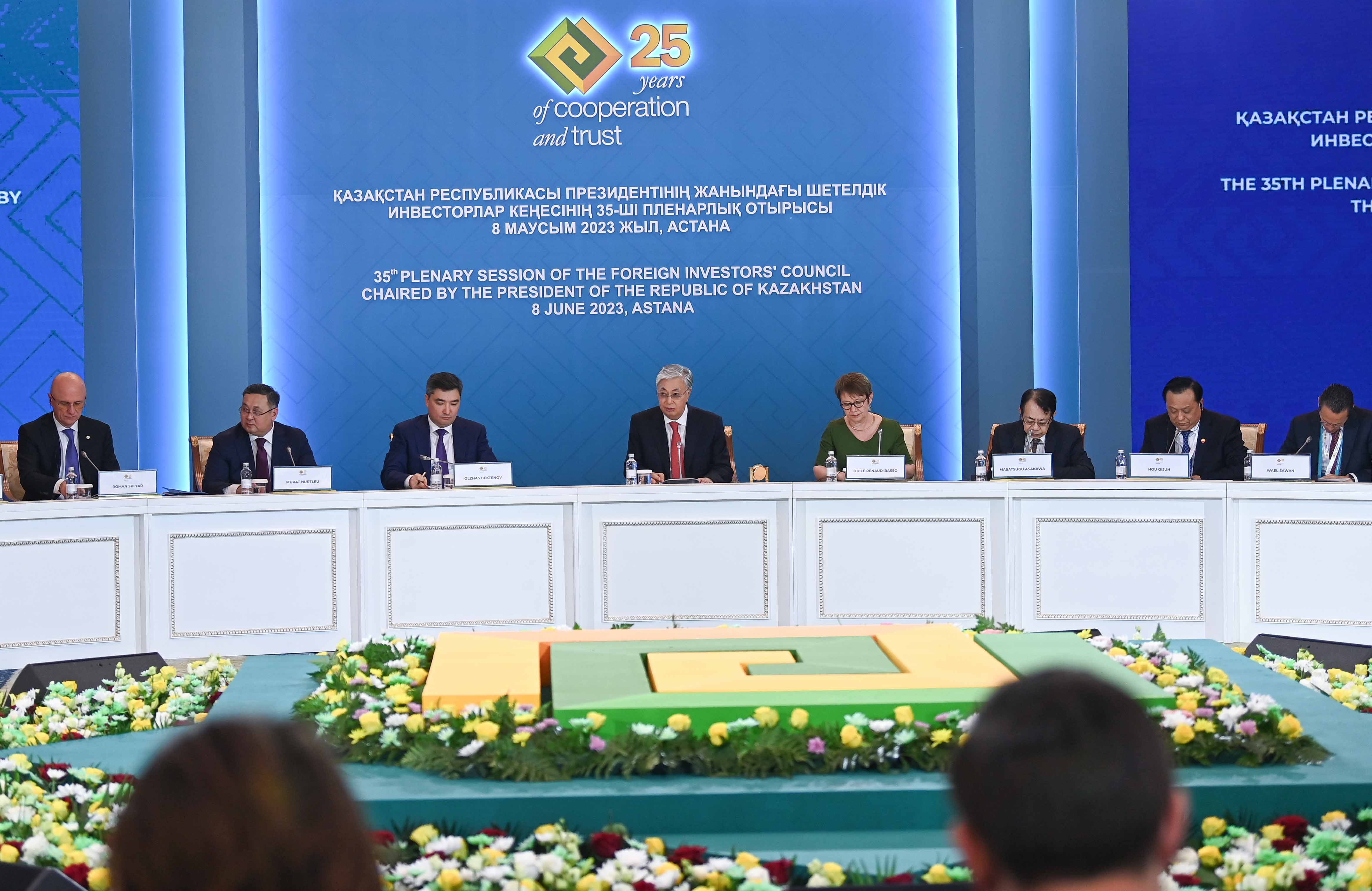 Открывая мероприятие, Глава государства выразил признательность всем делегатам за участие в 35-м пленарном заседании Совета иностранных инвесторов и отметил символичность его проведения вместе с первым Международным форумом Астана. Он также сообщил, что в этом году отмечается 25-летие Совета иностранных инвесторов.