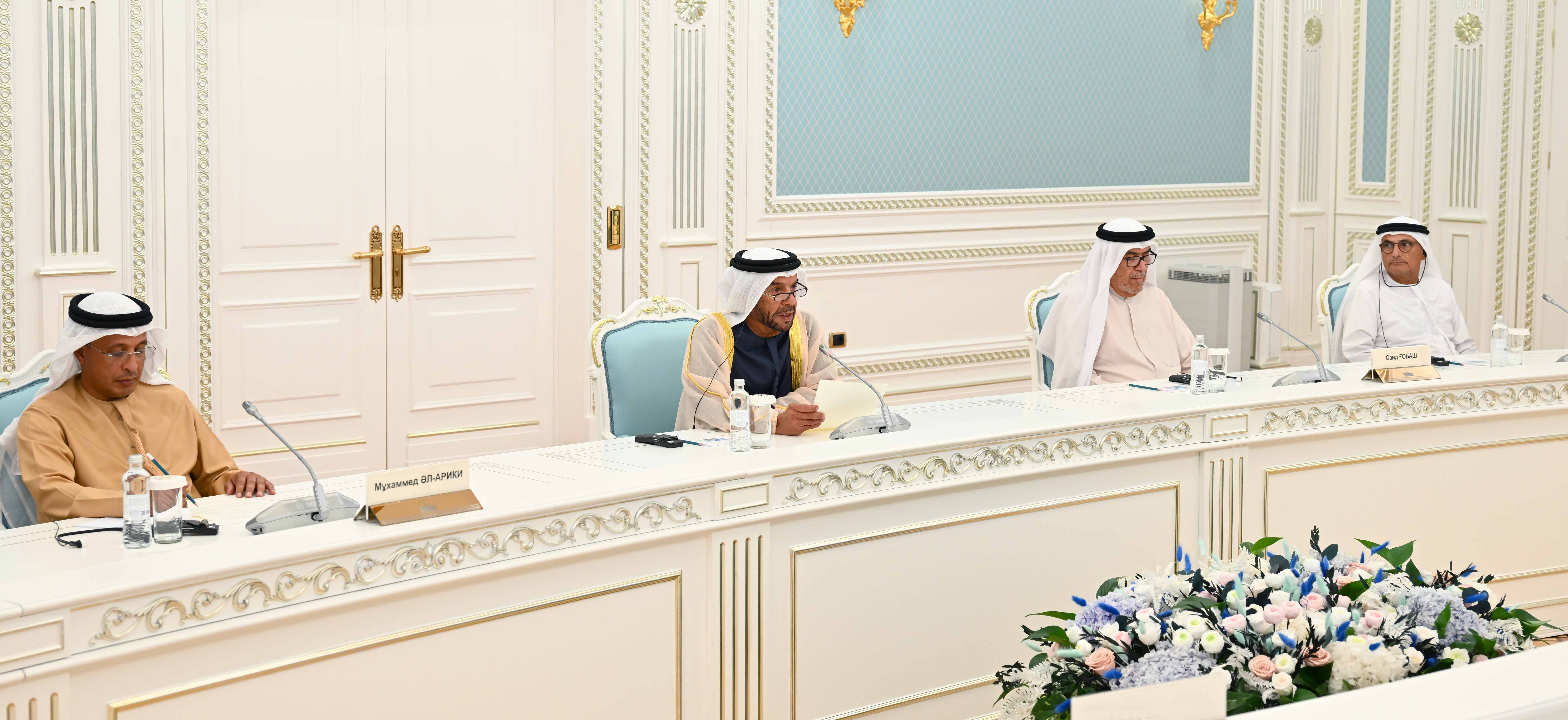В ходе встречи были рассмотрены вопросы торгово-экономического и инвестиционного взаимодействия двух стран. Глава государства, отметив высокий потенциал и возможности эмиратских компаний, пригласил их к активному участию в совместных проектах в сферах сельского хозяйства, энергетики, нефтехимии, горнодобывающей промышленности, строительства, транспорта и логистики, финансов и туризма.