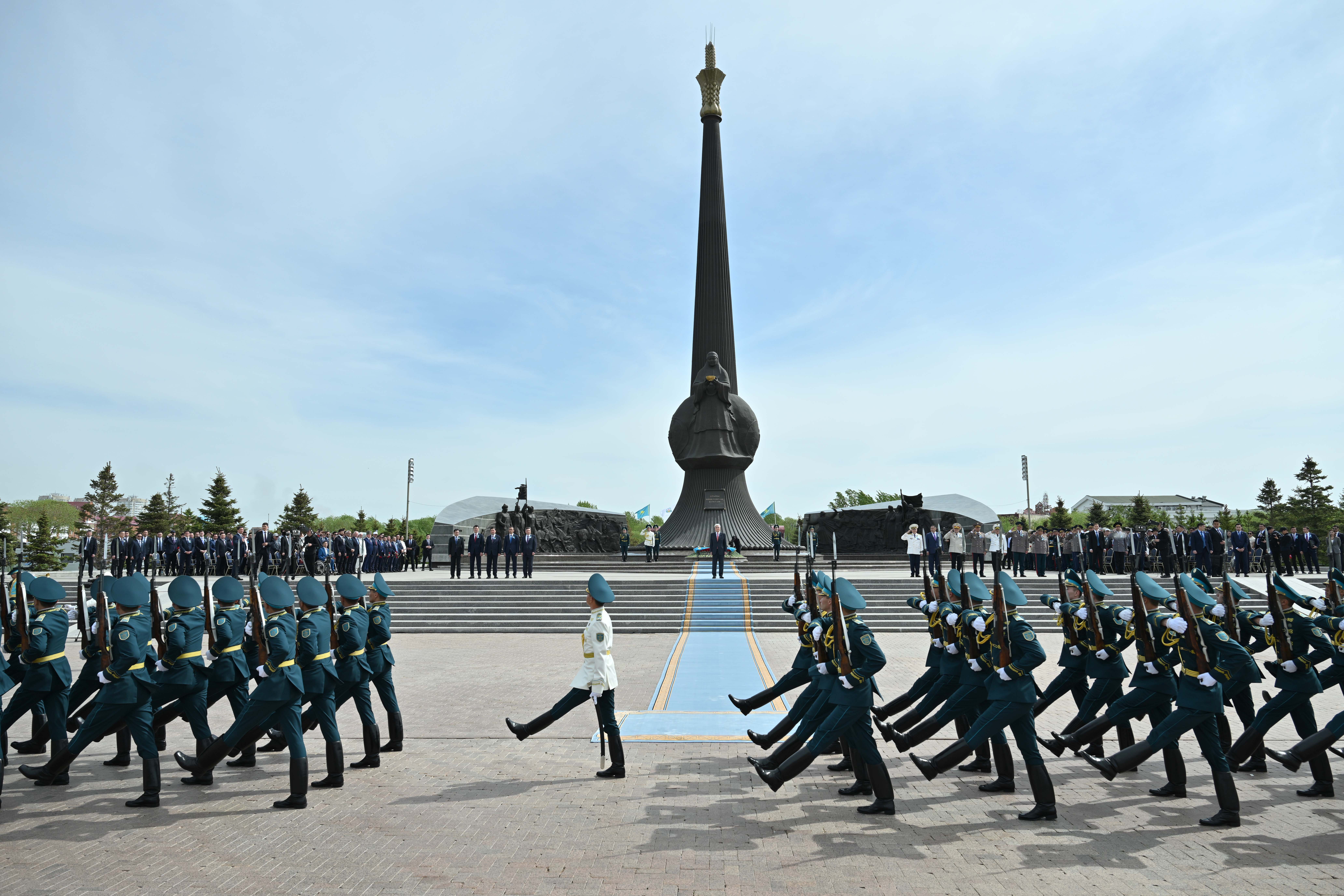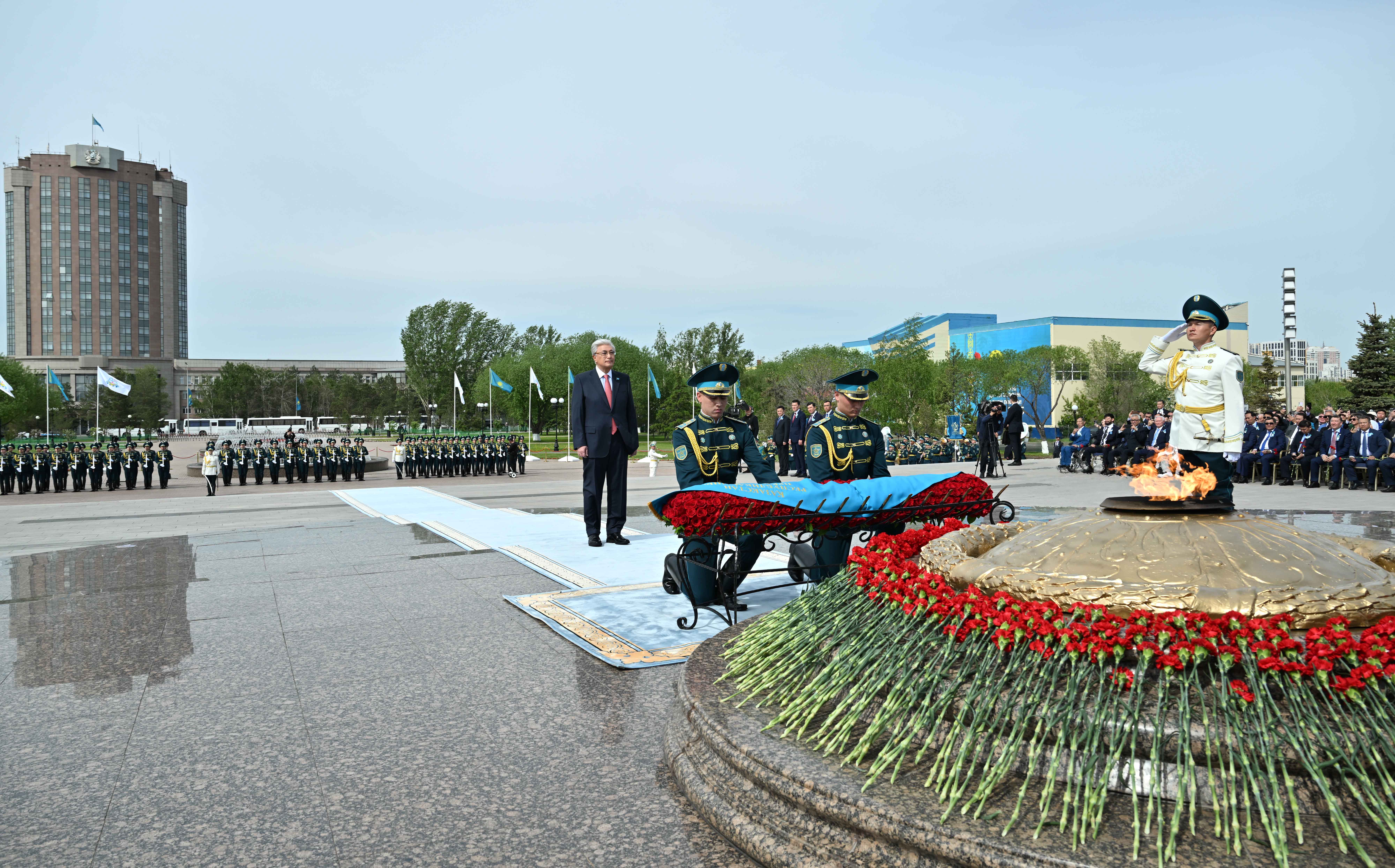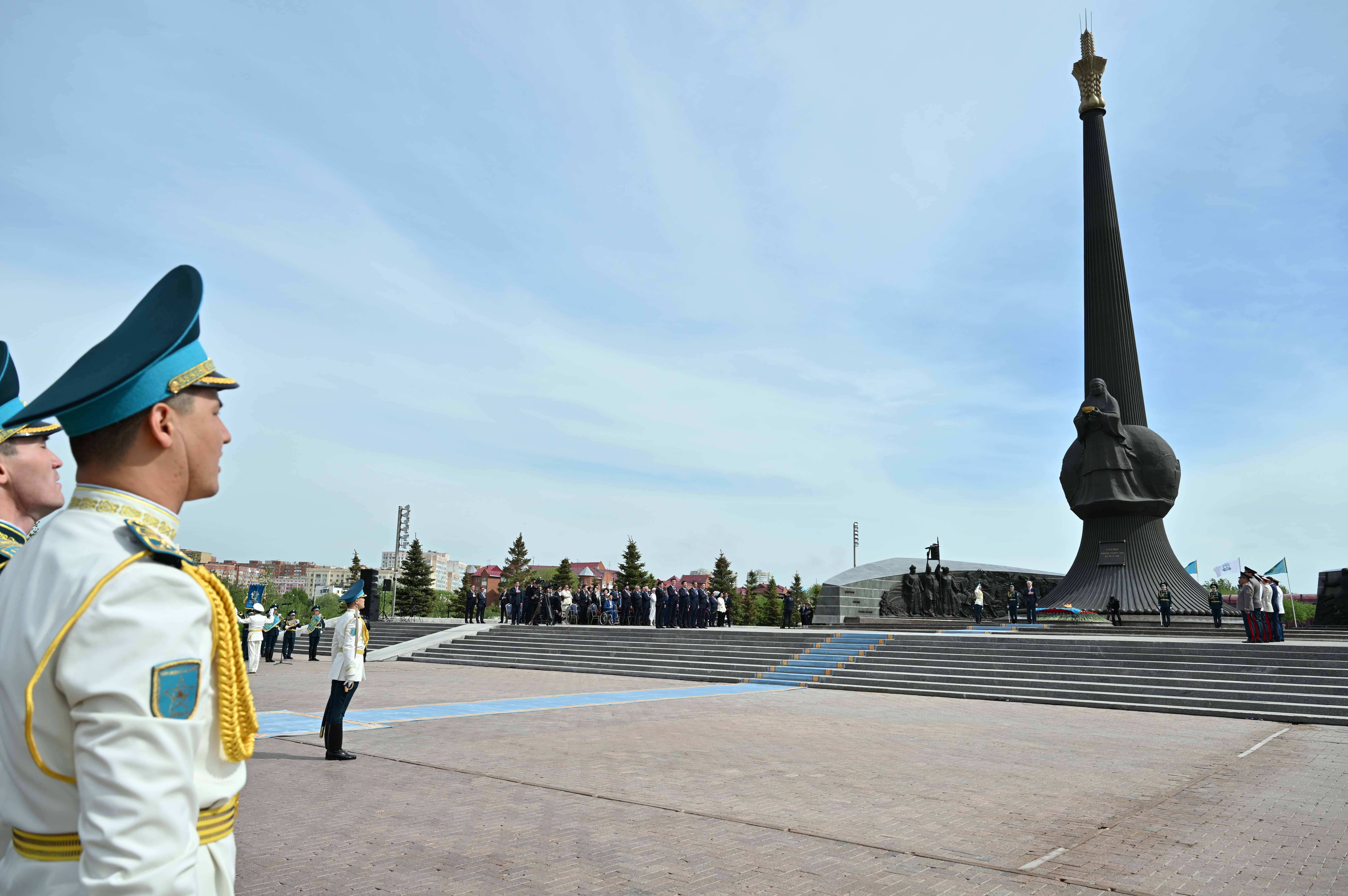 Глава государства возложил цветы к столичному монументу «Отан Ана» по случаю 80-летия Великой Победы и почтил минутой молчания память воинов-казахстанцев. Президентский оркестр исполнил Государственный Гимн, рота почетного караула прошла торжественным маршем перед участниками мероприятия.