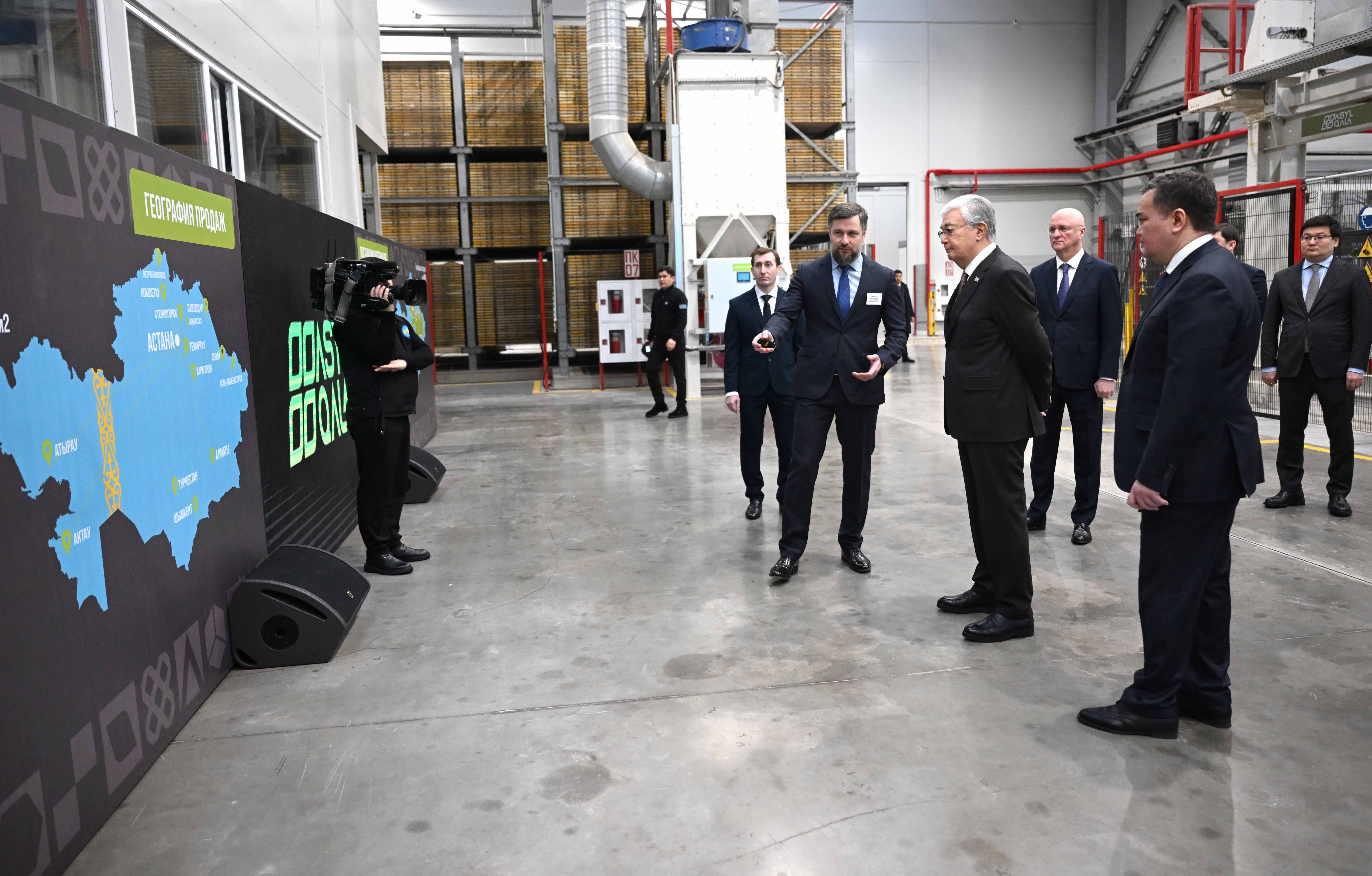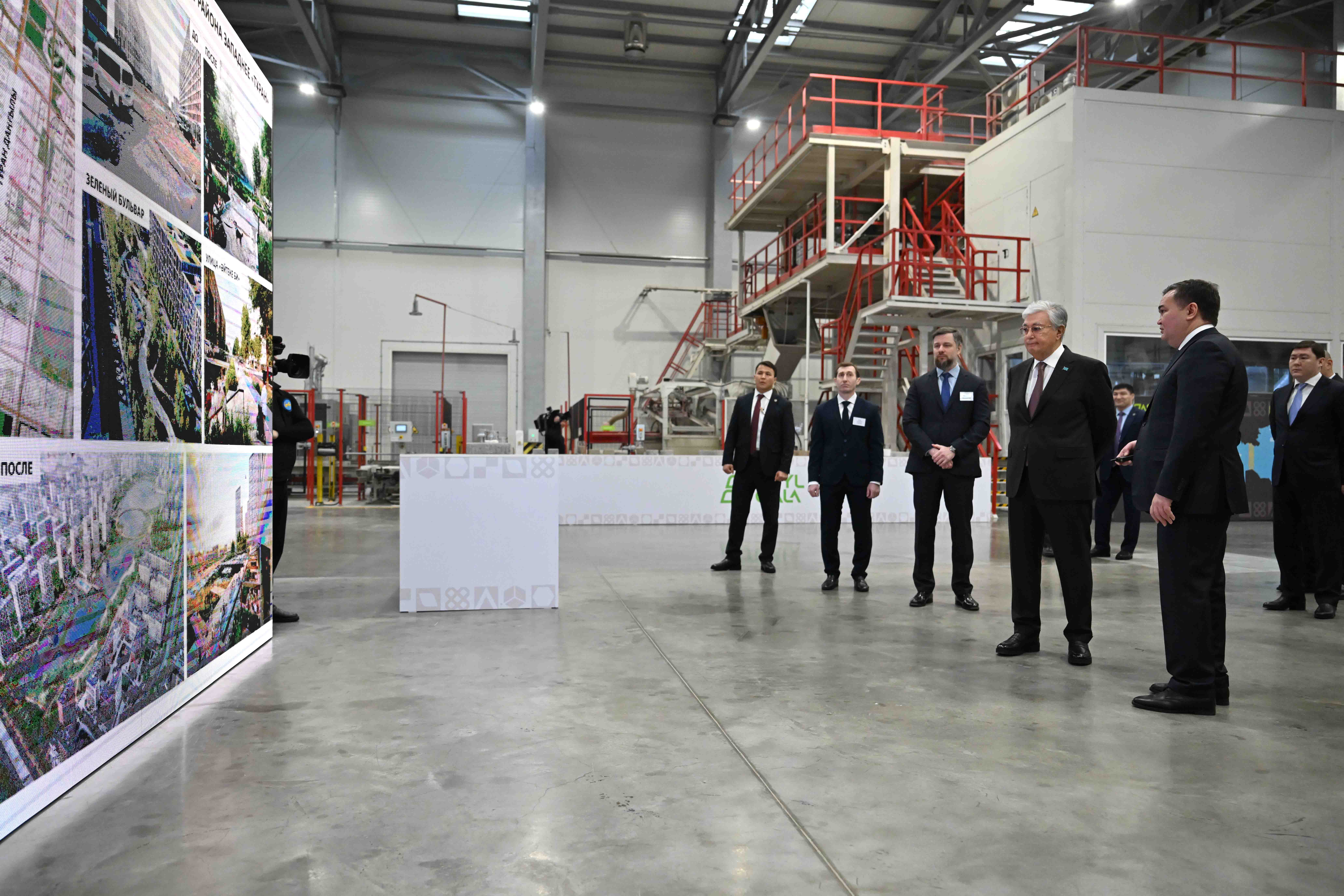 Глава государства посетил завод по производству тротуарной плитки Asyl Qala – специализированное предприятие, где трудятся более 100 человек. Объем инвестиций в проект составил 8 млрд тенге. Производственная мощность достигает до 4500 кв. метров тротуарных покрытий в сутки, а после завершения второго этапа строительства увеличится до 9000 кв. метров.