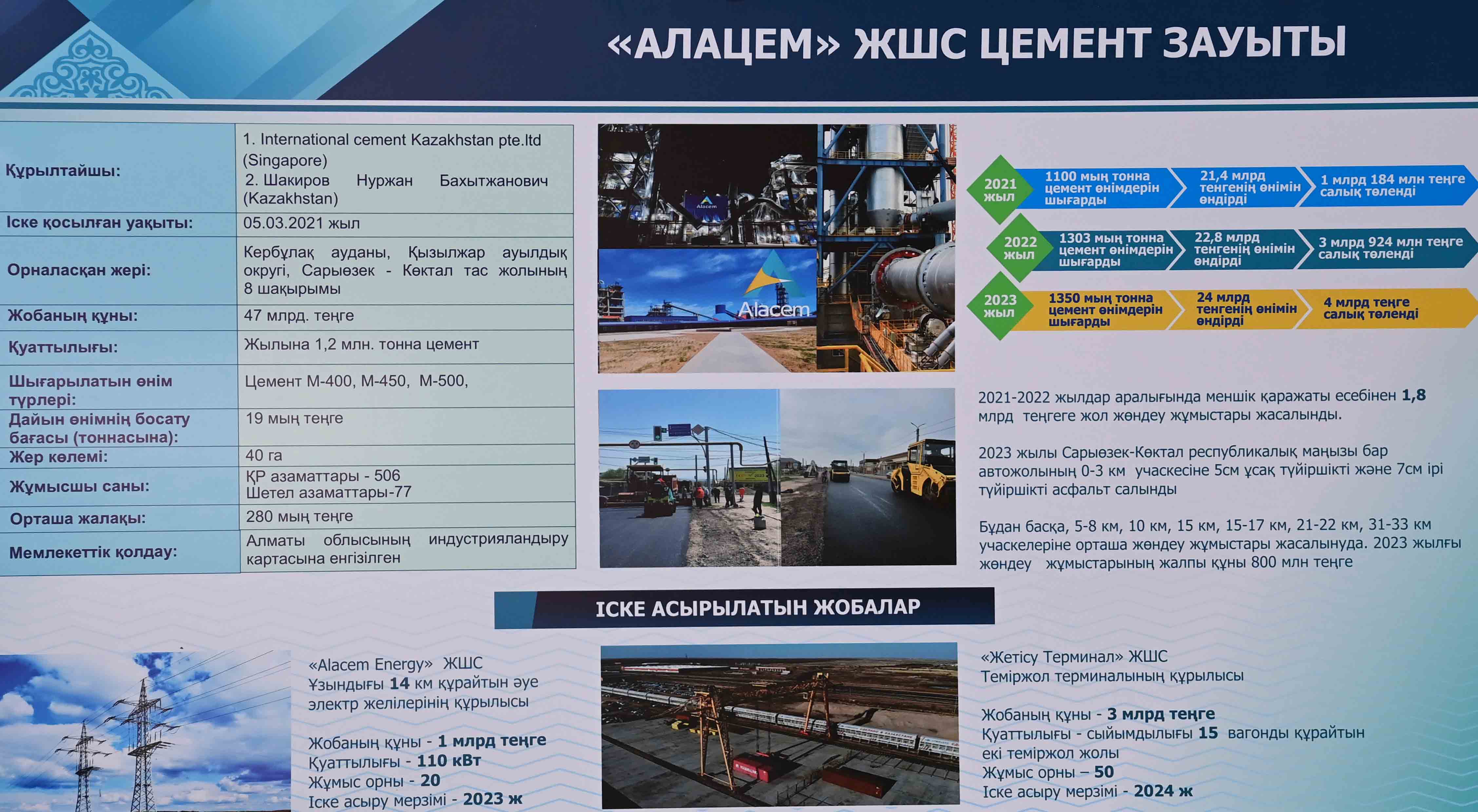 На совместном казахстанско-сингапурском предприятии, запущенном в 2020 году в рамках программы индустриализации, производится сухим способом 1,5 миллиона тонн цемента в год. Стоимость проекта – 47 миллиардов тенге. На заводе выпускаются марки цемента М400, М450, М500, широко используемые, в основном, при строительстве гражданских и промышленных объектов. Для строительства плотины «Аюсай», сооруженной в ущелье реки Большая Алматинка, использовалась продукция завода.