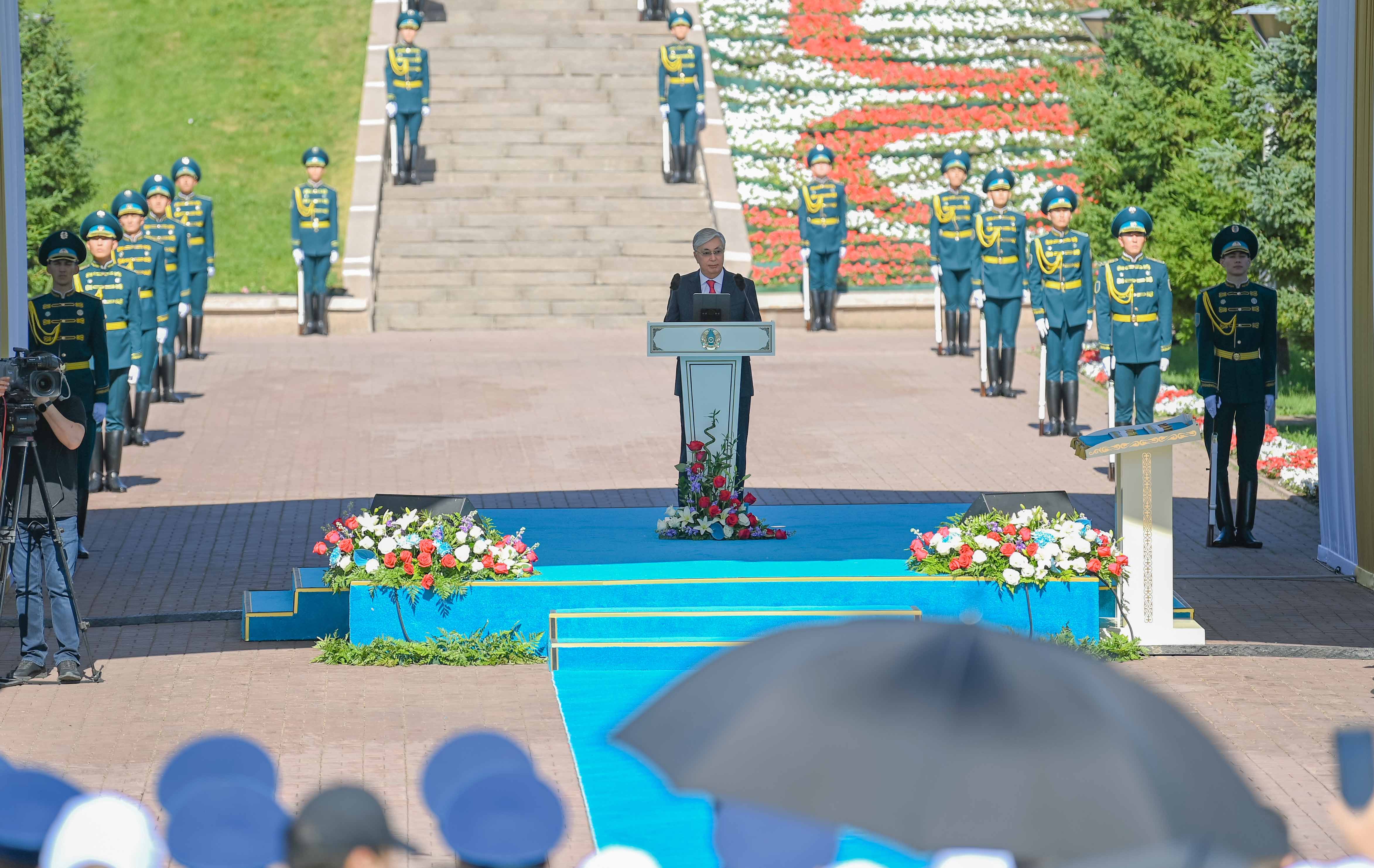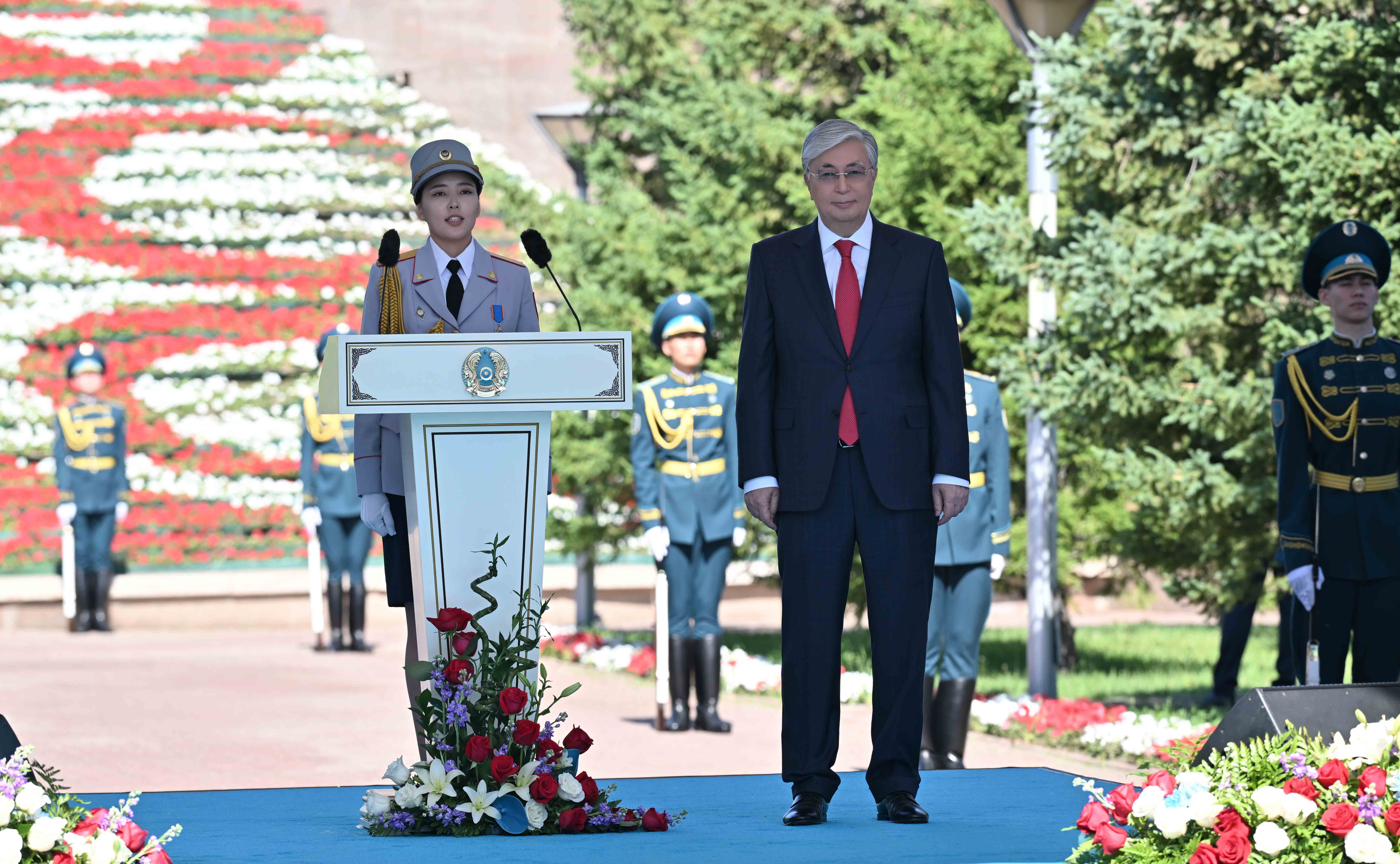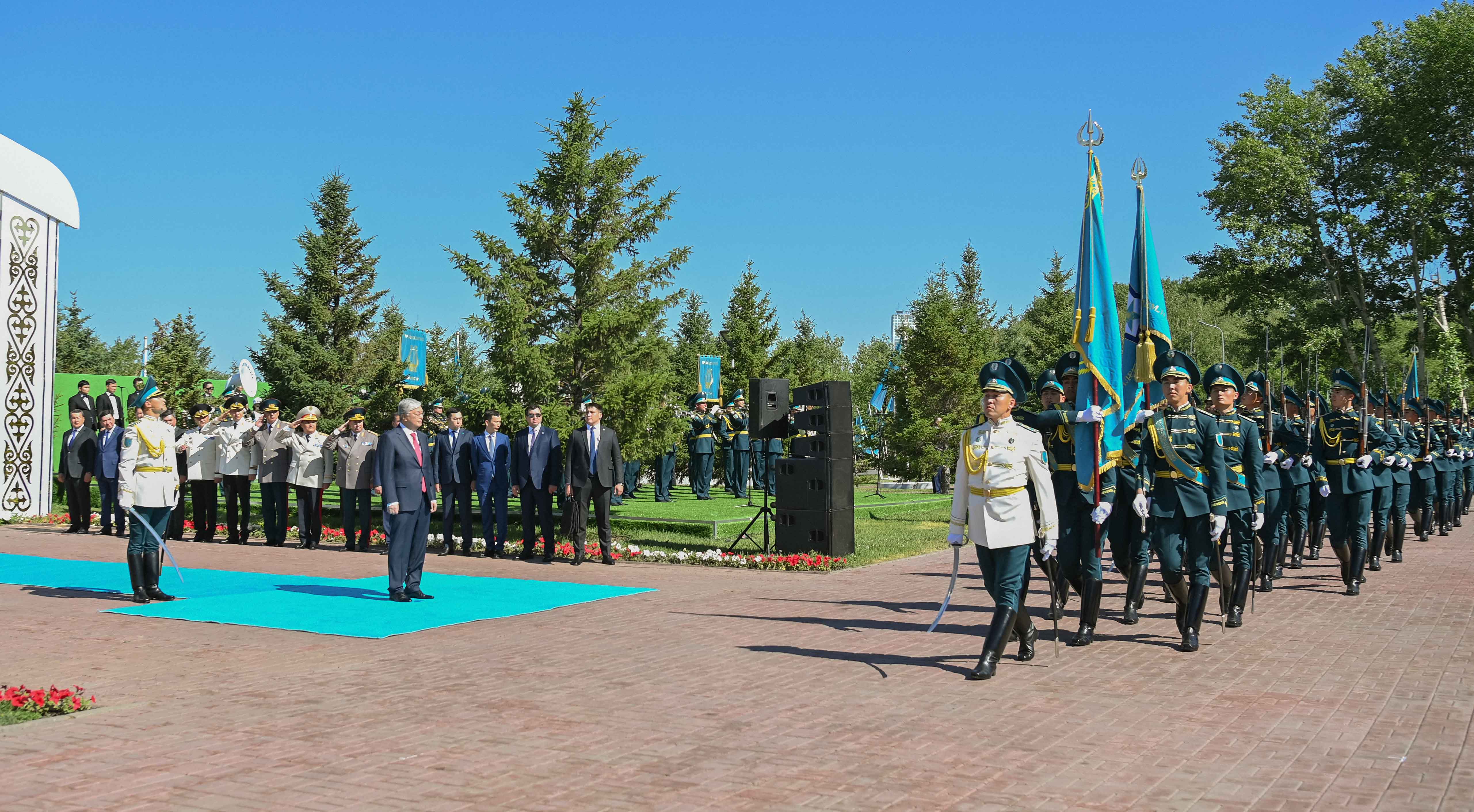 Президент Касым-Жомарт Токаев принял участие в торжественной церемонии поднятия Государственного флага в этномемориальном комплексе «Атамекен». Начальник роты Почетного караула отдал Президенту рапорт о готовности к церемонии. Затем прозвучал Государственный гимн и был поднят Государственный флаг Республики Казахстан.
