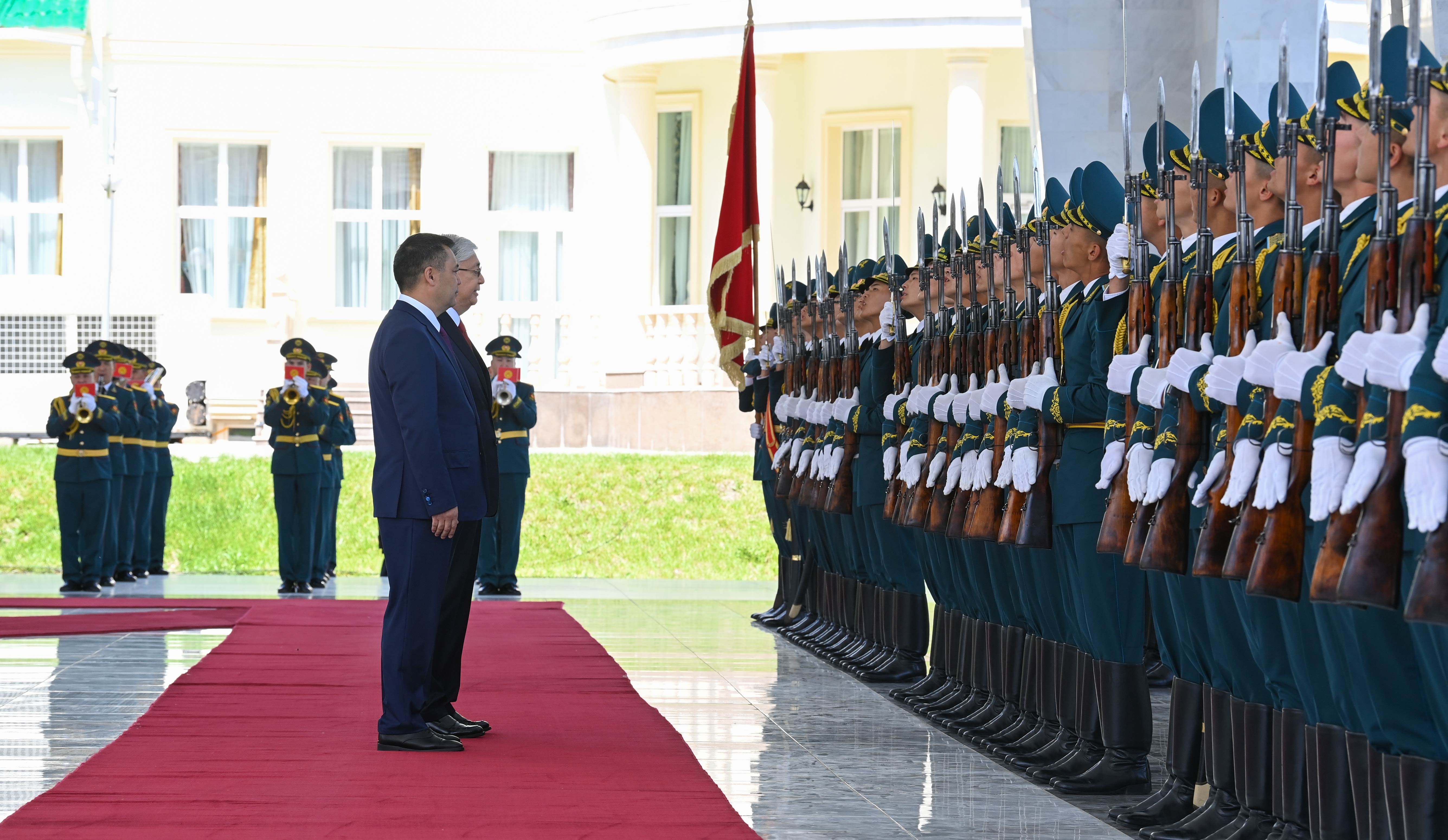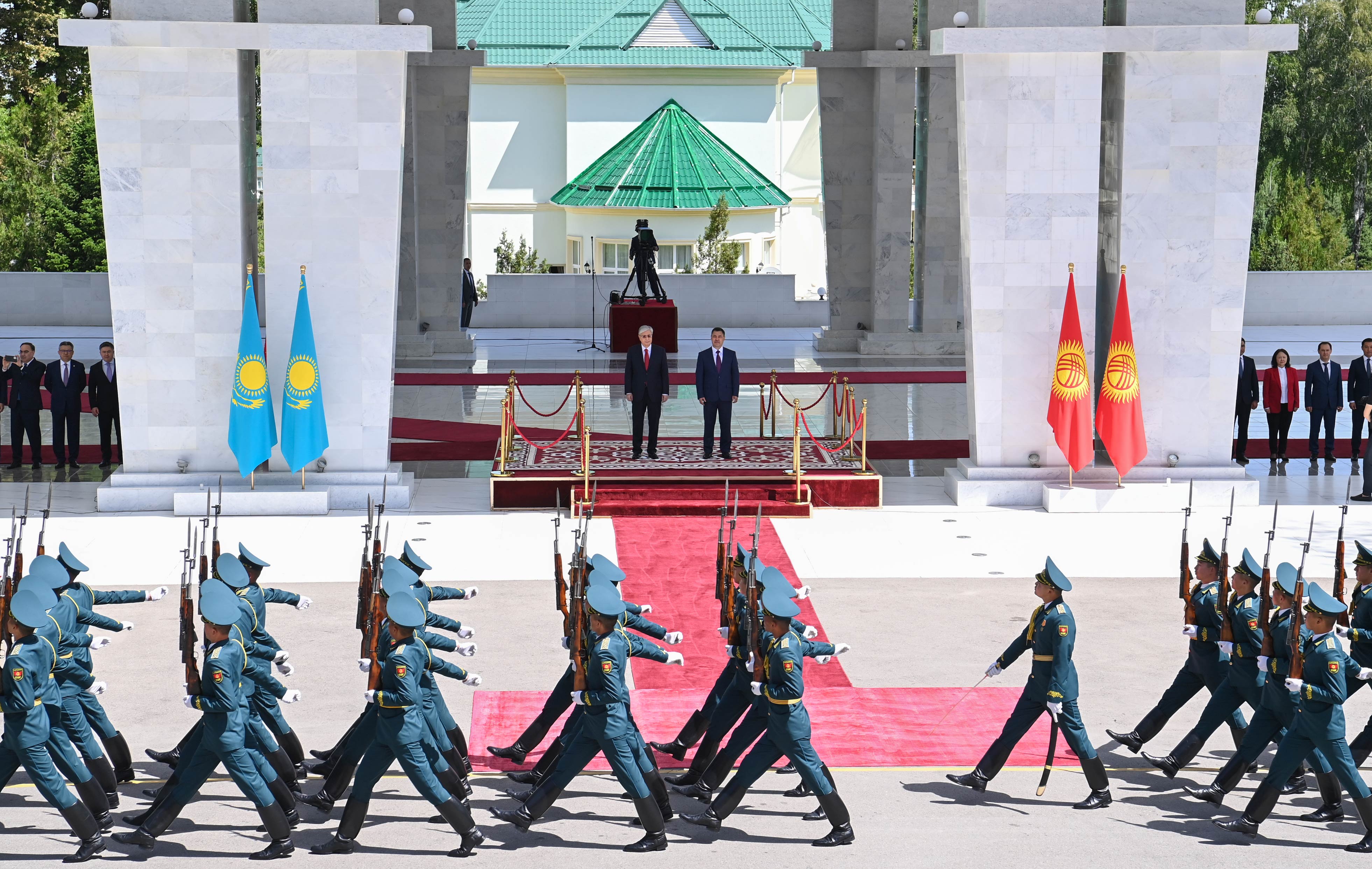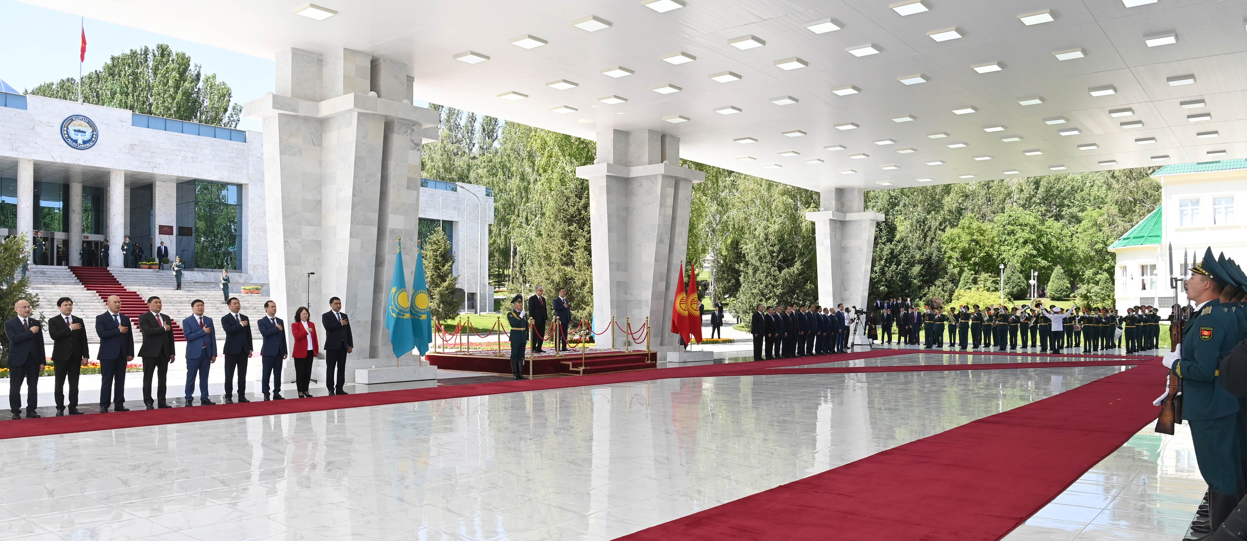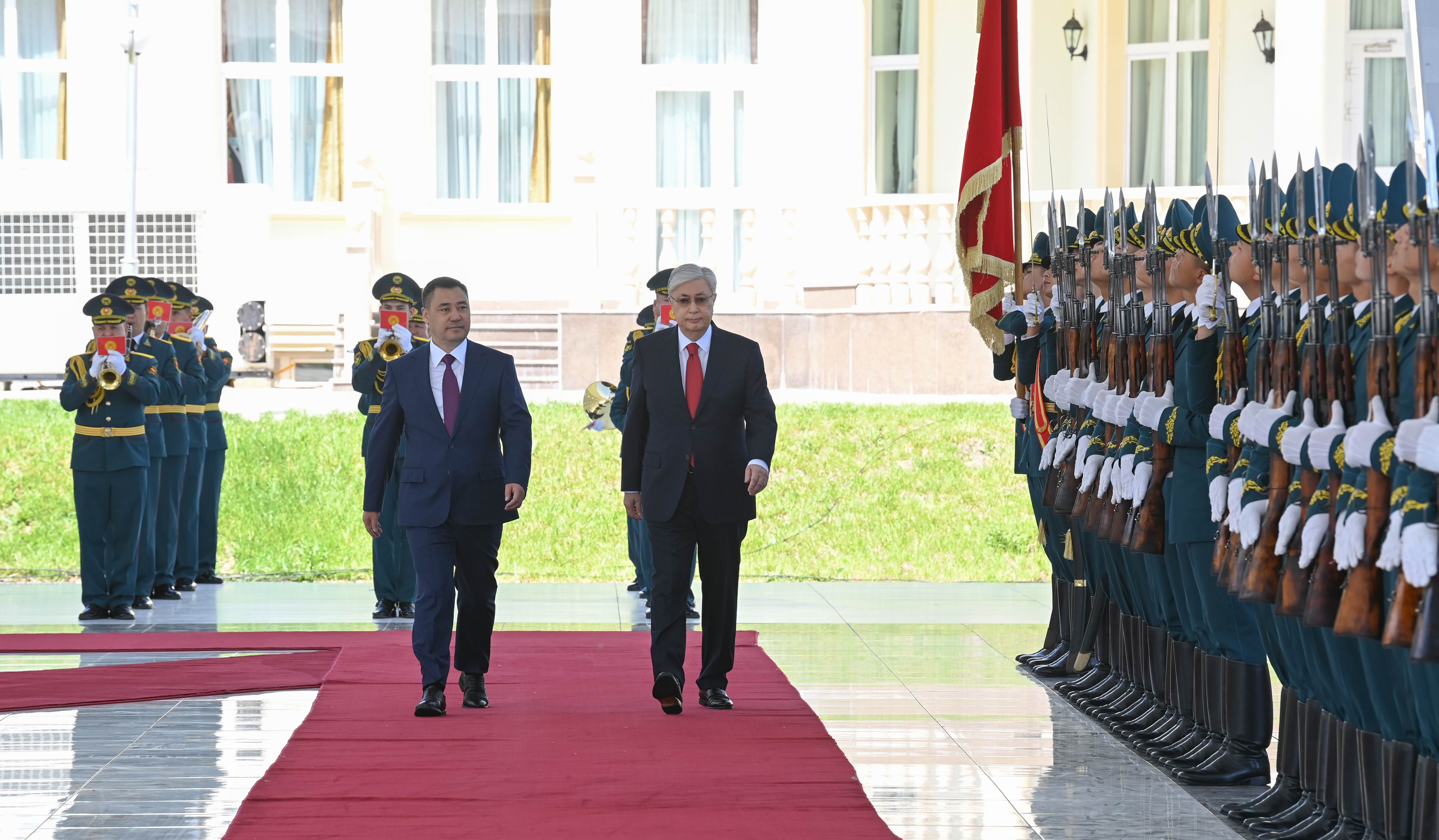 Переговорам предшествовала официальная церемония в мраморном шатре «Ақ кеме» в резиденции Президента Кыргызстана «Ала-арча». Начальник Почетного караула отдал рапорт главам государств. После исполнения гимнов Казахстана и Кыргызстана Касым-Жомарт Токаев и Садыр Жапаров представили друг другу членов официальных делегаций.