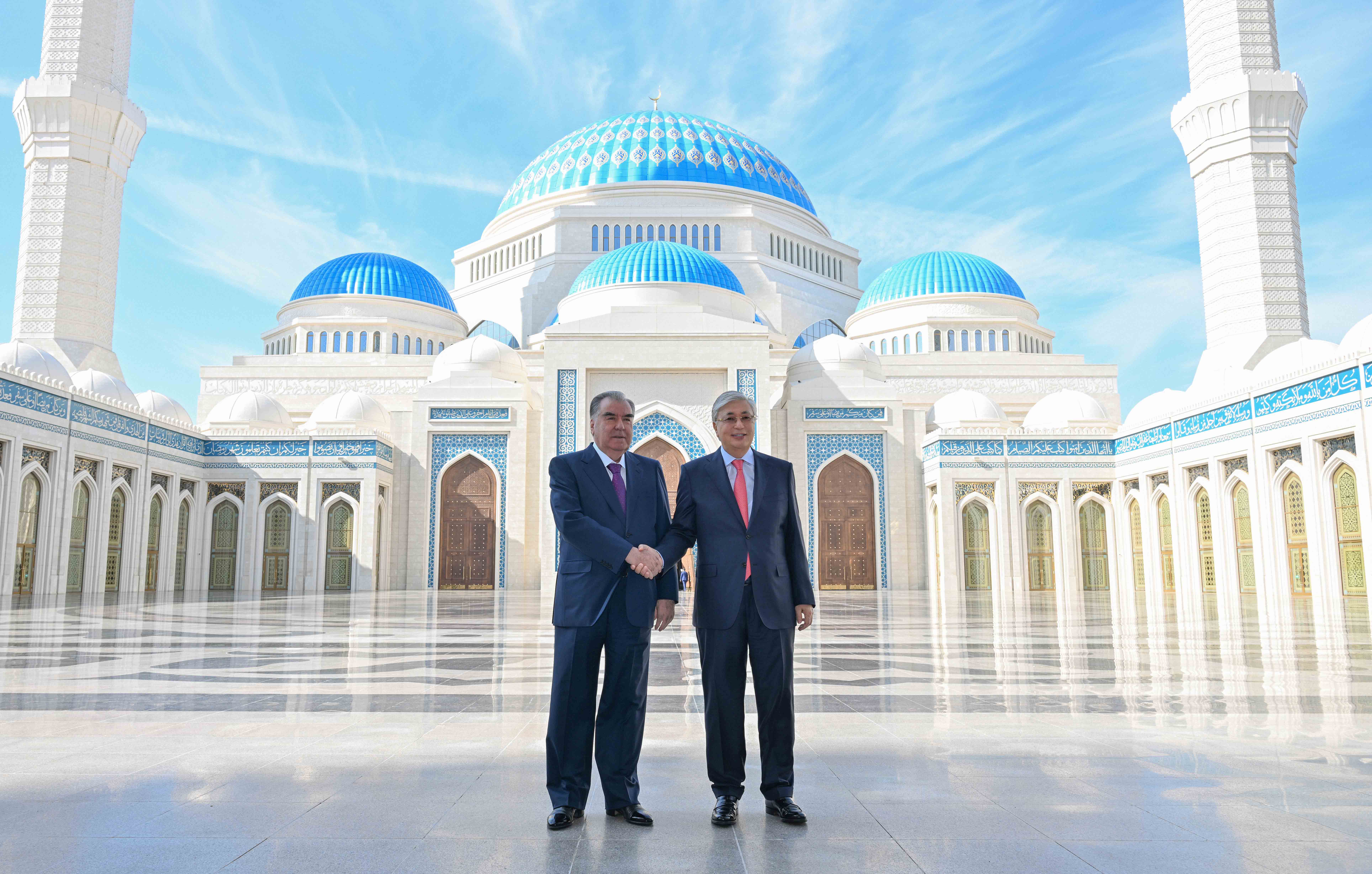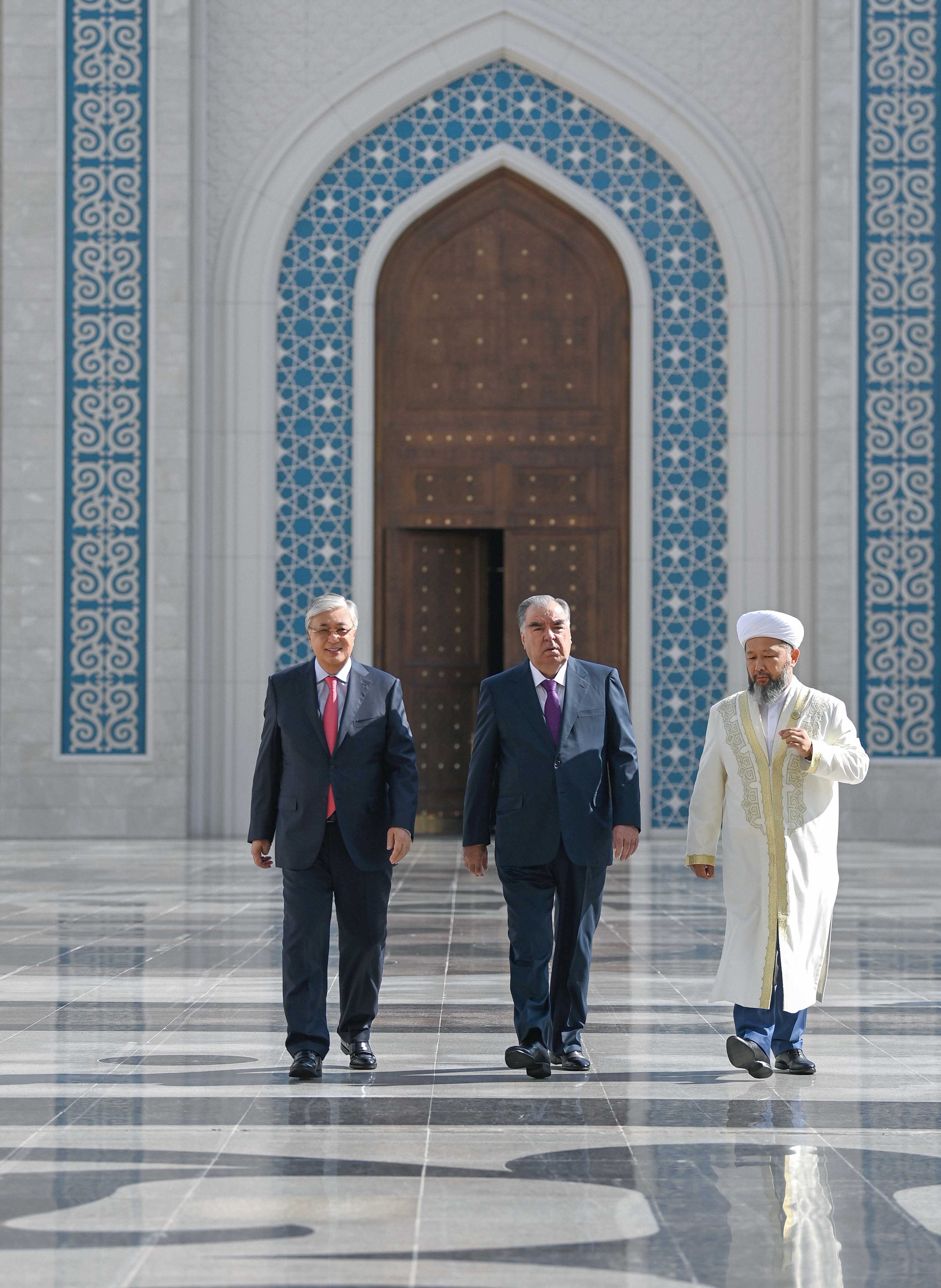 Касым-Жомарт Токаев и Эмомали Рахмон посетили Главную мечеть Астаны, построенную в 2022 году. Верховный муфтий Казахстана Наурызбай кажы Таганулы прочитал суры из Корана и пожелал народам двух стран мира, процветания и благополучия. Главы государств осмотрели крупнейшую мечеть Центральной Азии.