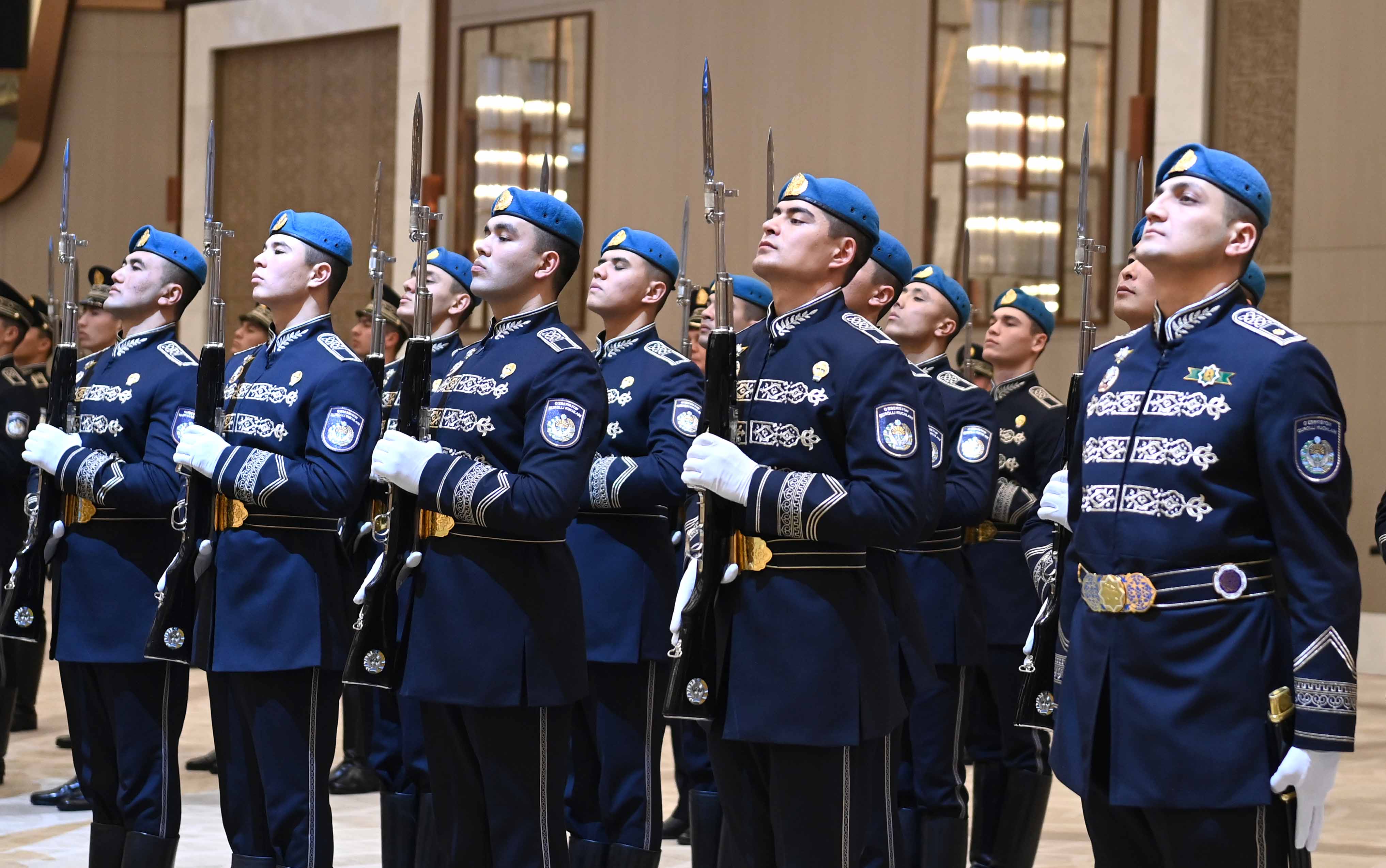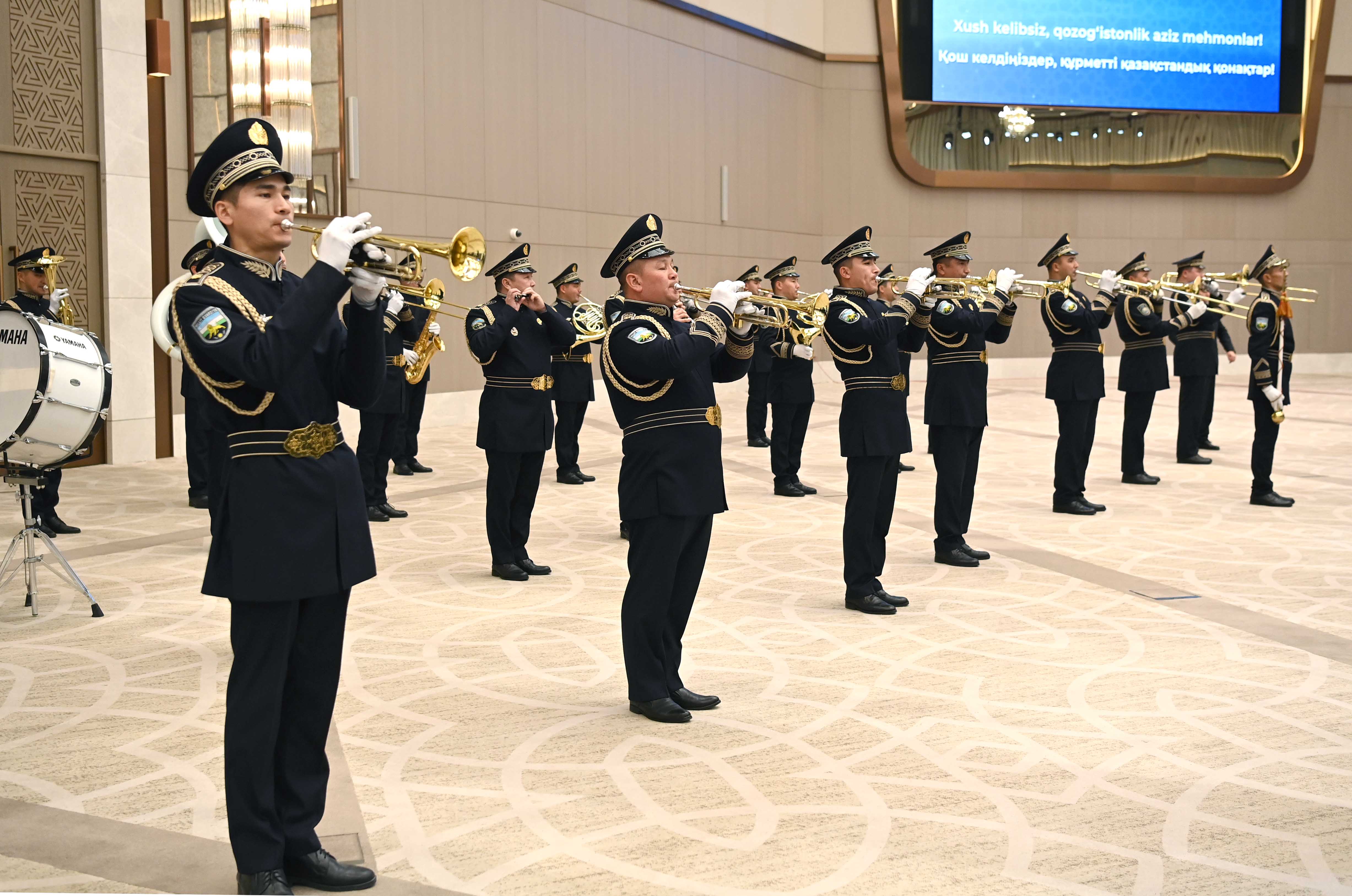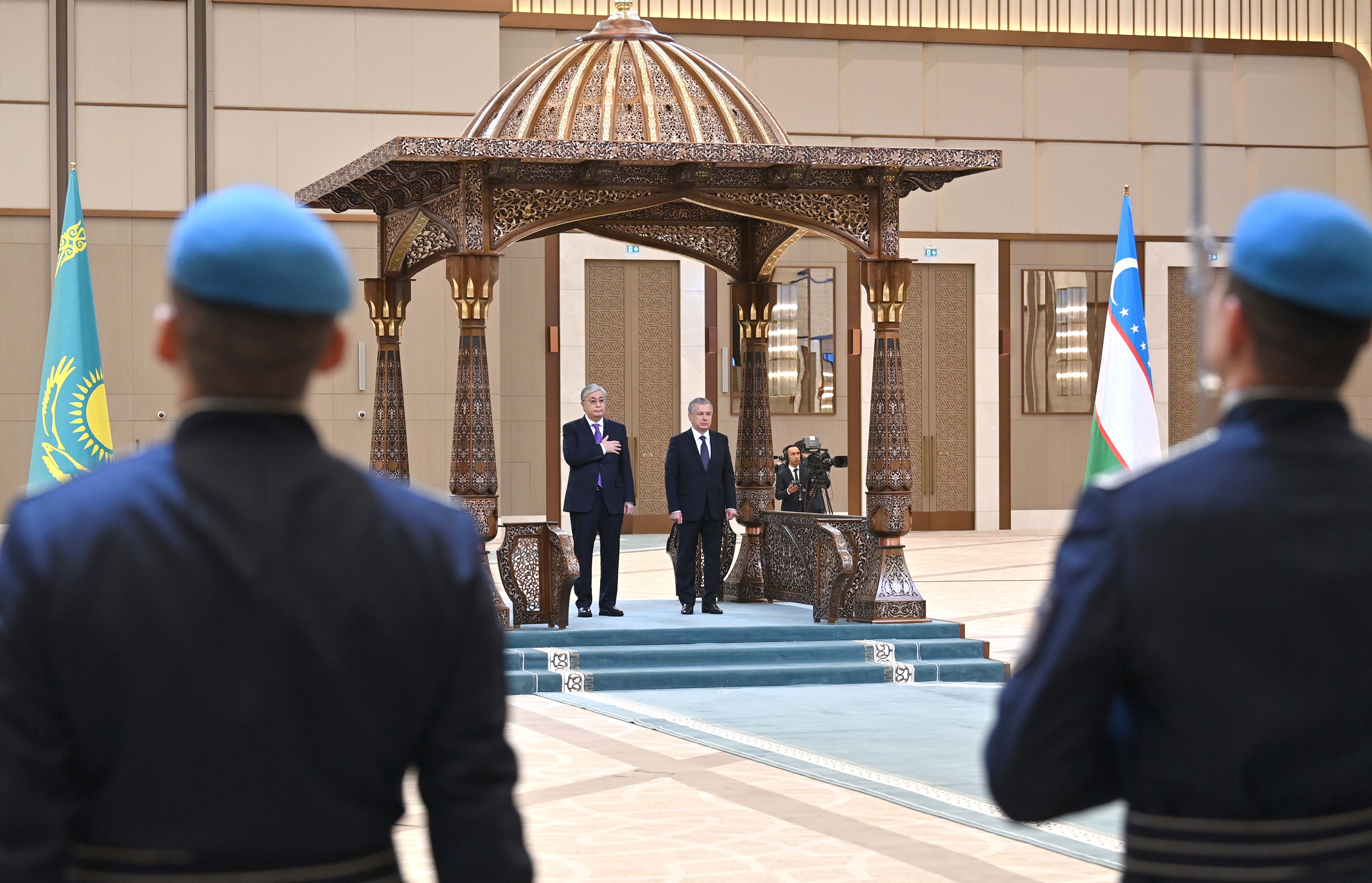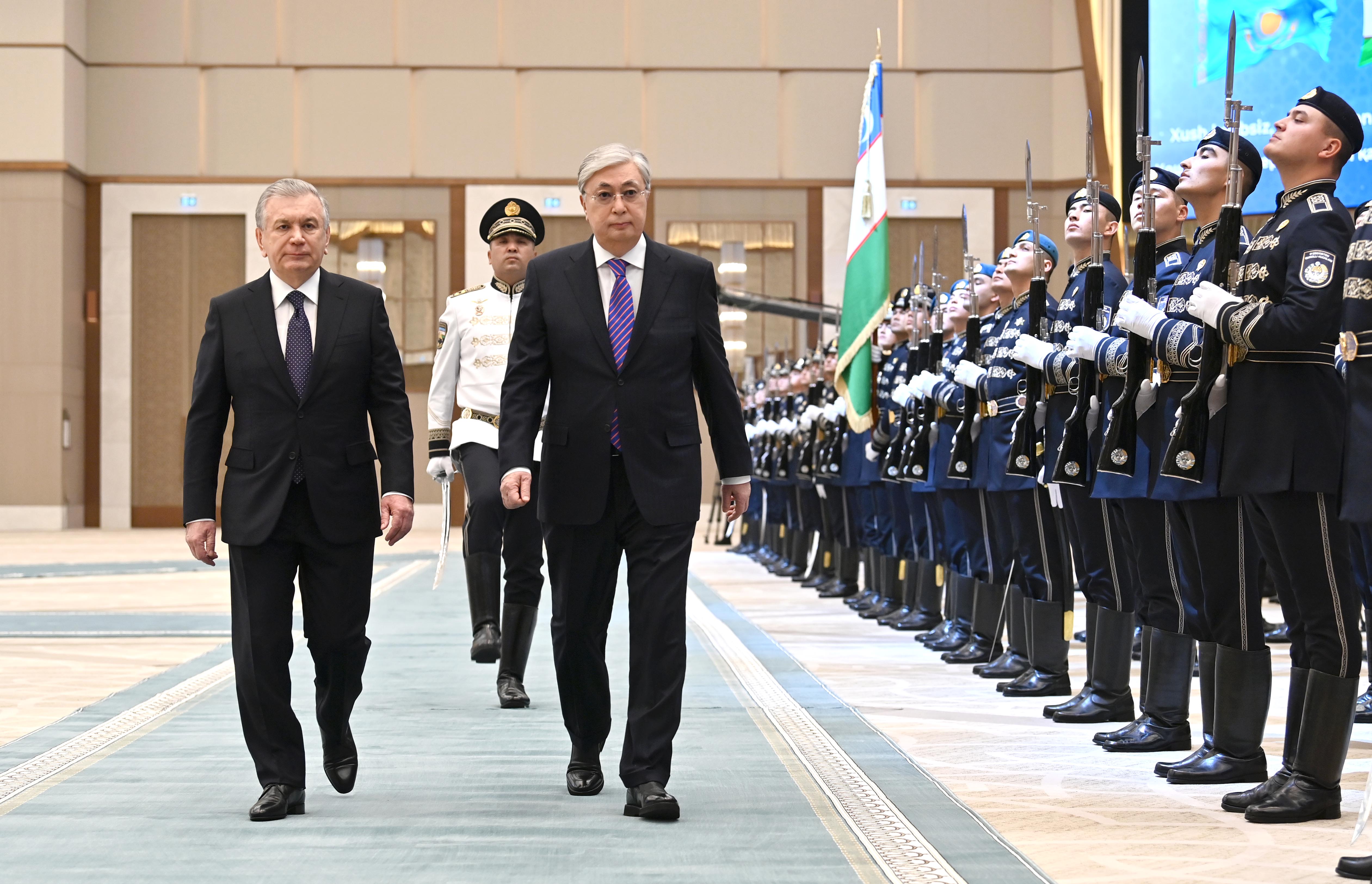 Лидеры двух стран приняли приветственный рапорт начальника роты почетного караула, прозвучали государственные гимны Казахстана и Узбекистана. Касым-Жомарт Токаев и Шавкат Мирзиёев представили друг другу членов официальных делегаций.